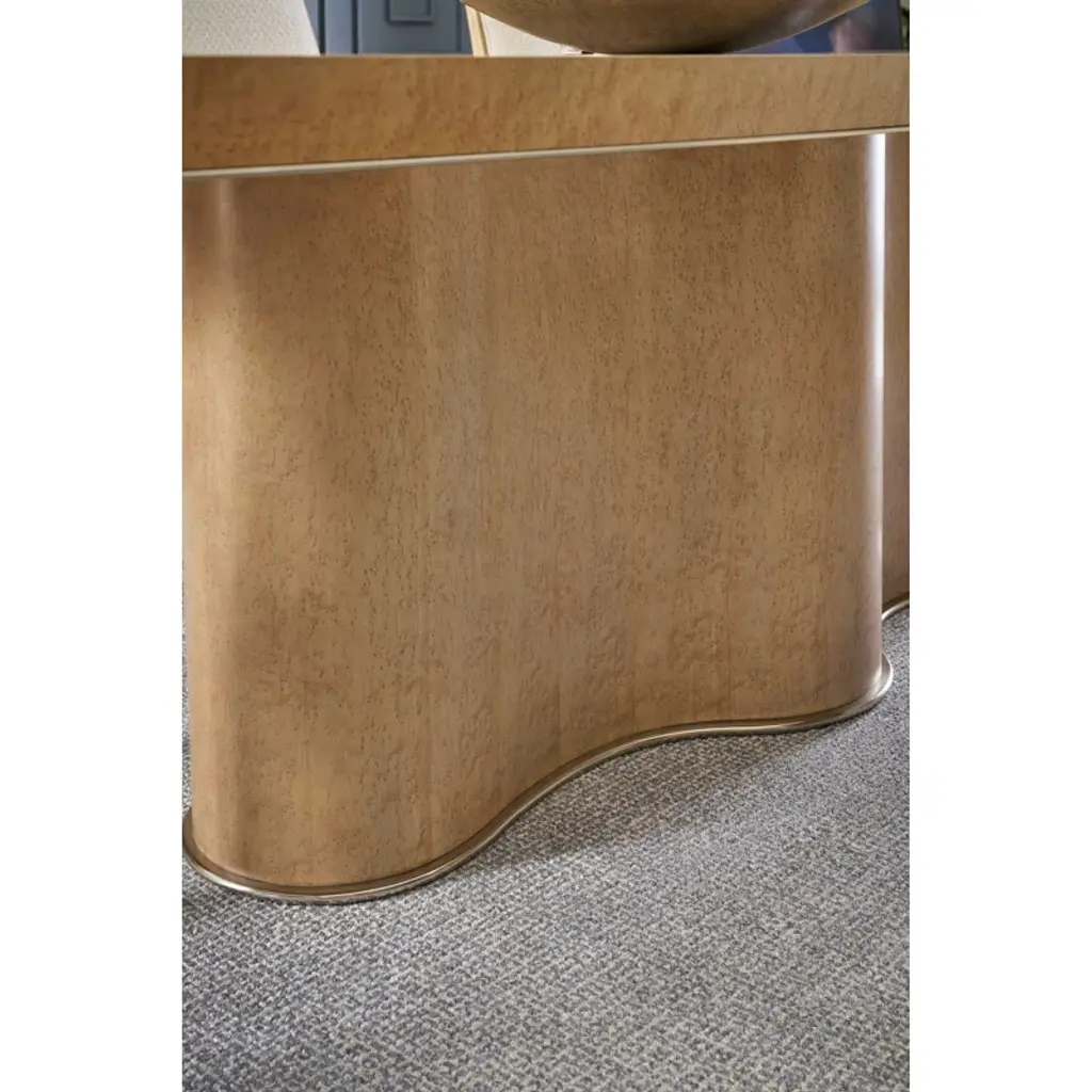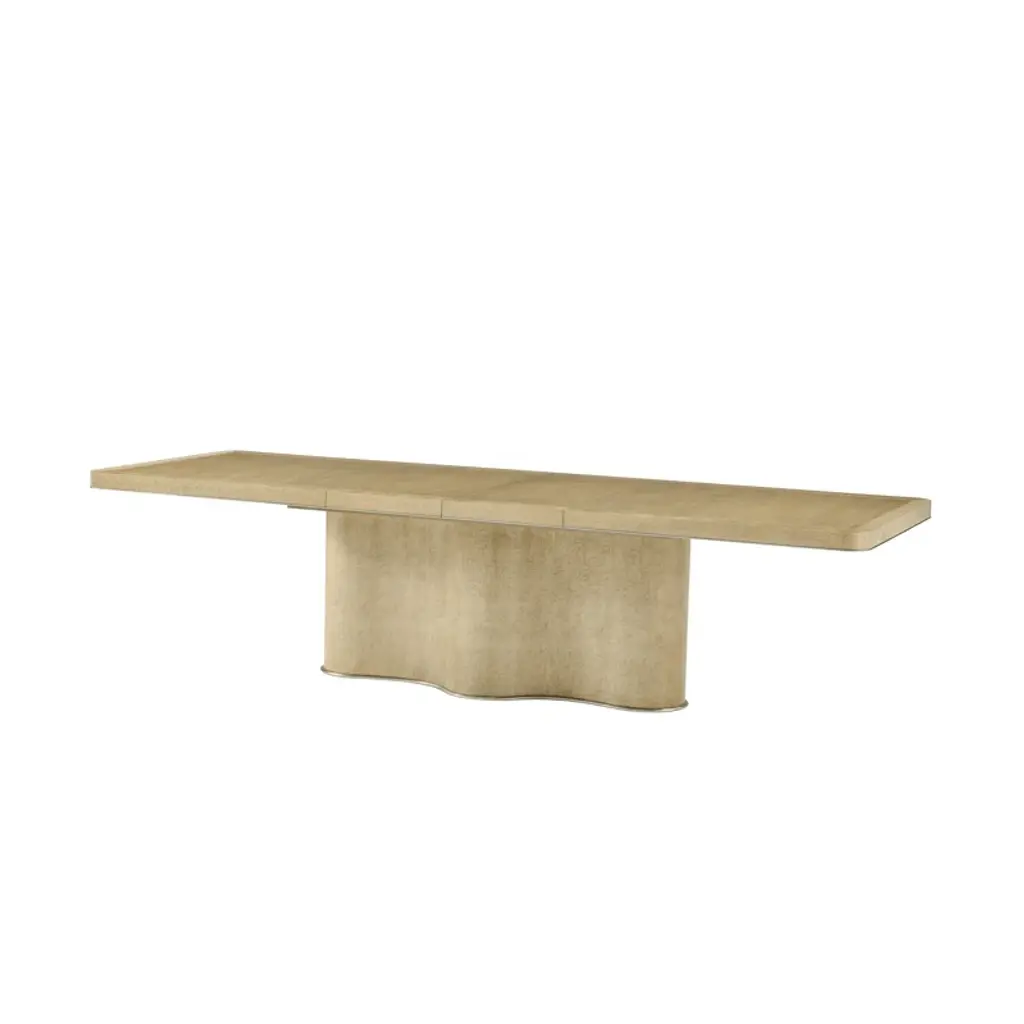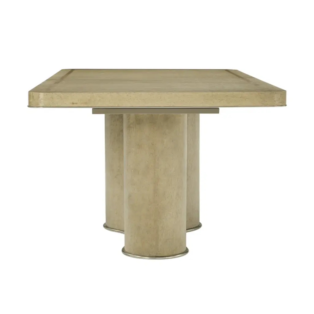 The Origins Rectangular Dining Table is an elegant nod to 1920s design with contrasting materials and attenuated forms. The surface is composed of figured sycamore inlay and beautifully accented with brass trim. Extends with two 18" leaves. Handcrafted in birdseye maple.