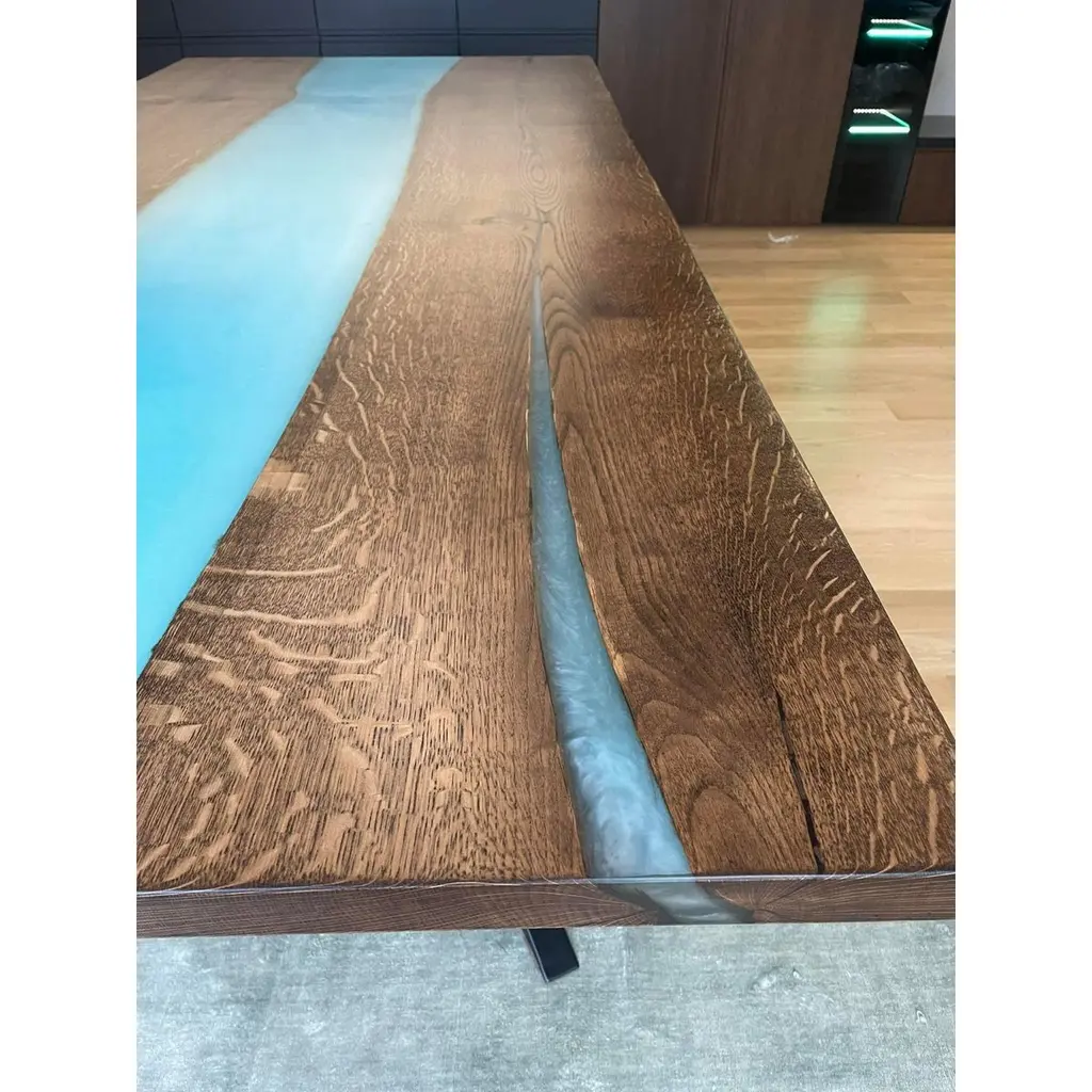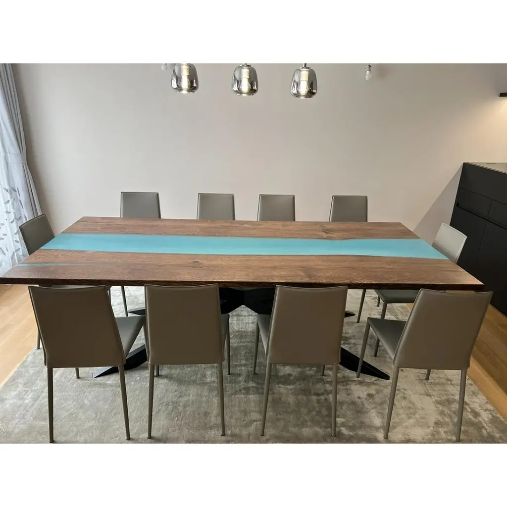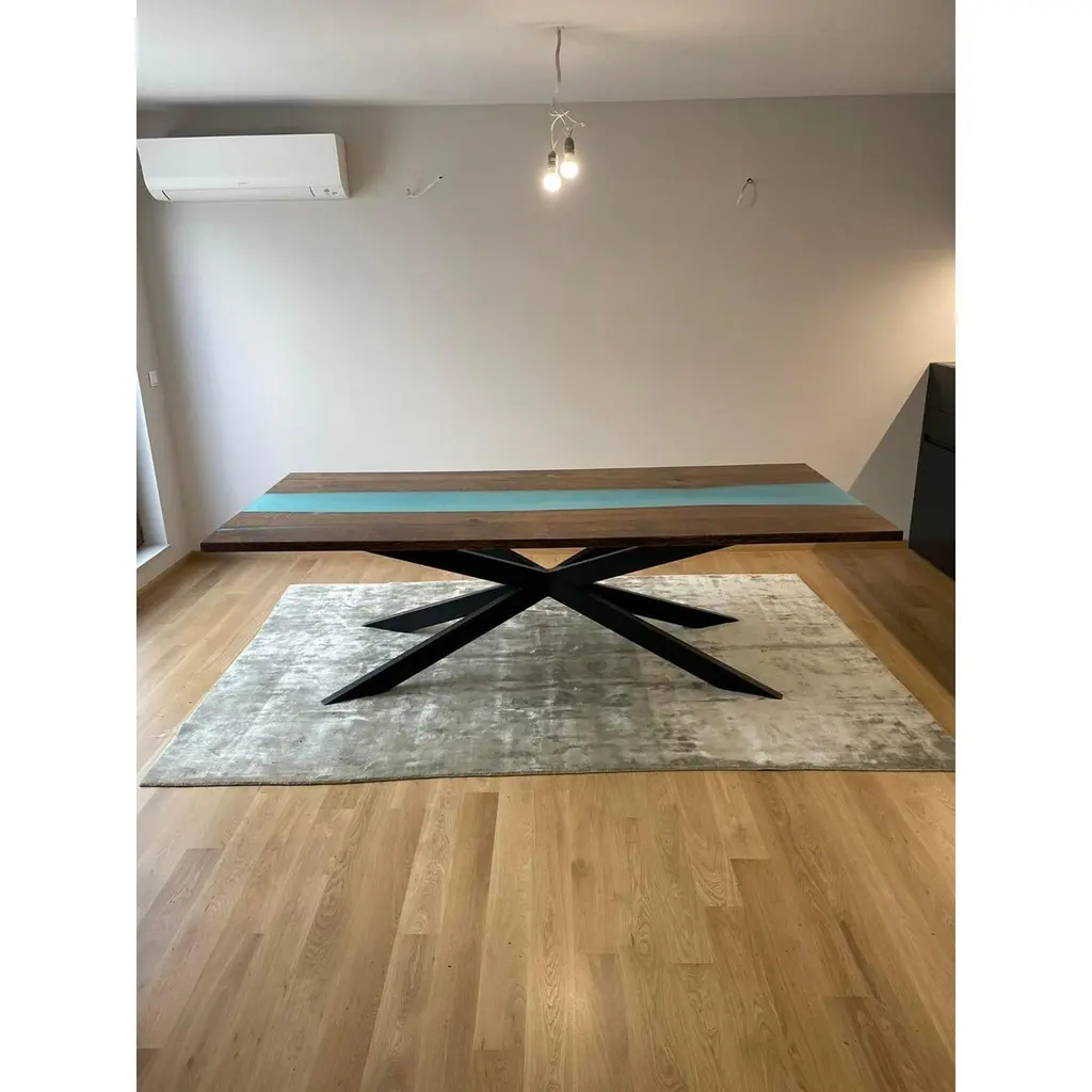 Orion Dining Table by KV DesignOne Of A KindDimensions: D 120 x W 260 x H 77 cm.Materials: European oak, metal, and epoxy.Everything is custom-made 1 of 1 edition. Please contact us.The dining table is an essential part of your home interiorAs we celebrate, share special moments with family members and friends.This is why we believe it is essential to create not only a strong and durable dining table but for it to also be warm and create a comforting environment. Our aim at KV Is to accentuate these exact feelings.The main feature of our dining table is not just the Solid wood but the combination of the aforementioned with epoxy resin, which fits it immaculately.KV Design is a team of professionals, and we believe that our custom-made furniture is not simply part of the interior design. We use high-quality wood and epoxy resin in the production of unique state-of-the-art products. Our ideology is that our tables are not solely to be used for their main purpose, but also to be observed and enjoyed as a piece of art. Hence, we combine functionality and elegance into the creation of a captivating and complex product. For the production of our furniture, we strive to select the highest quality materials from leading brands on the market. We invest endless hours of manual labor in the making of every single element part of our furniture. However, everyorder is strictly delivered within no more than 4 weeks.