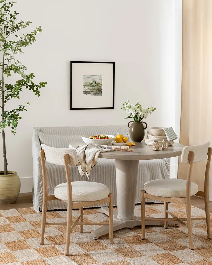 With a timeless and simple form, the Orla Dining Table brings an inviting feel to any dining space. Its white finish displays details from the rustic oak woodgrain, adding a sophisticated yet organic quality to your decor.