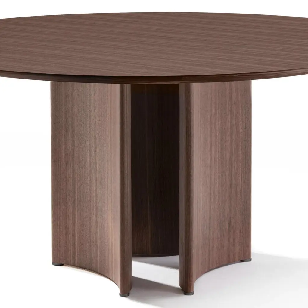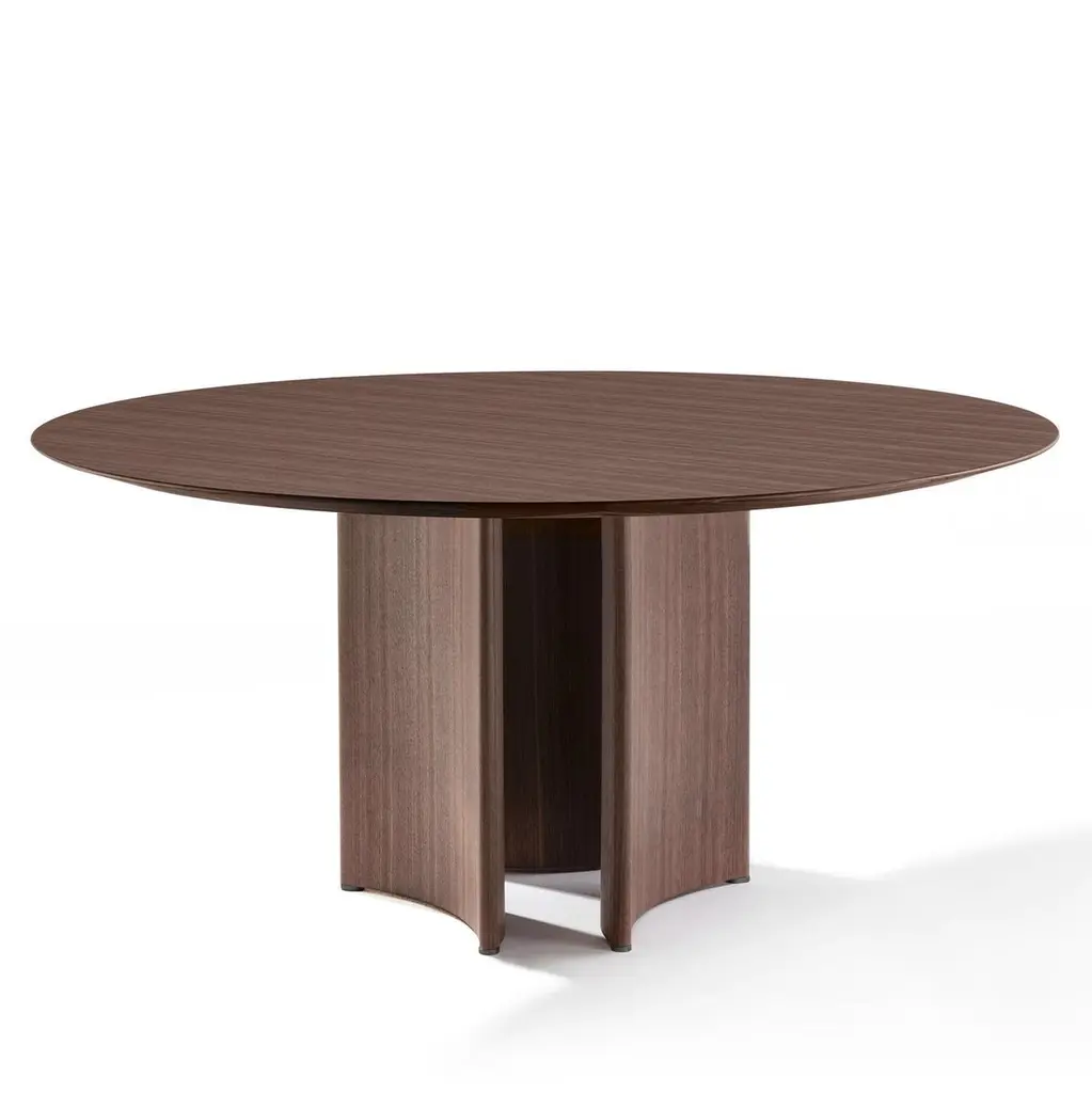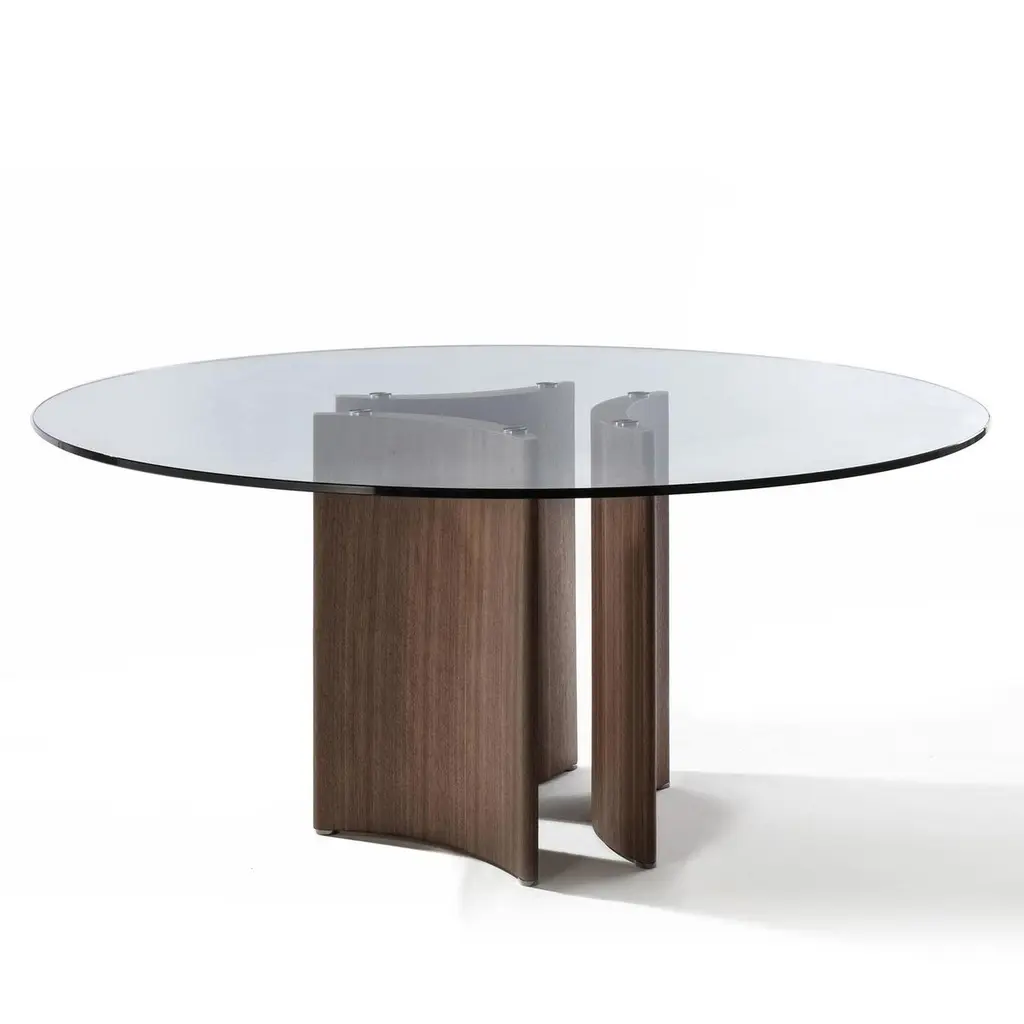 Dining table ornament with solid walnut wood beveled edge top, 40 mm thicknessand diameter 180cm. Base composed of 3 equidistant curved solid walnut wood feetwith black chromed end feet. Price: 24900,00€.Also available with clear glass top, 15mm thickness and diameter 160cm. Price: 22900,00€.Also available with other clear glass top diameters, on request.