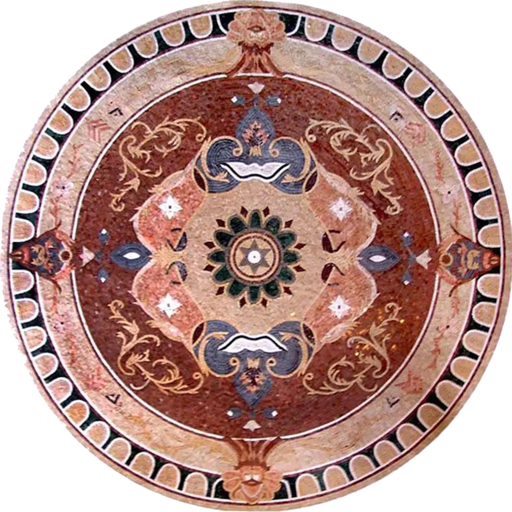 Introducing the Ornamental Floral Medallion - Nalini Mosaic, a breathtaking piece that seamlessly combines art and functionality to elevate your space. This exquisite mosaic serves as a vibrant focal point for your walls and decorative tile floors, infusing your home with a touch of elegance and charm. At the heart of the design is a striking center fan motif that captivates the eye. It features a rich palette of deep reds and burgundies, which beautifully harmonizes with delicate red and yellow flowers that appear to burst forth from intricately designed decorative urns. This ornate floral arrangement not only draws attention but also exudes a sense of warmth and sophistication.Crafted with meticulous attention to detail, the Nalini Mosaic is perfect for a variety of applications. Whether you envision it as a stunning piece of wall art or as a decorative inlay for your tabletop or countertop, this medallion enhances both traditional and contemporary interiors. Its versatility makes it an ideal choice for living rooms, dining areas, entryways, or even as a captivating kitchen centerpiece.Available in both standard and custom sizes, the Ornamental Floral Medallion can be tailored to fit your specific needs, ensuring that it complements your décor perfectly. Its high-quality craftsmanship guarantees durability and longevity, allowing you to cherish this beautiful piece for years to come.Transform your space with the Ornamental Floral Medallion - Nalini Mosaic, where artistic beauty meets functional design, making every glance a celebration of style and elegance.