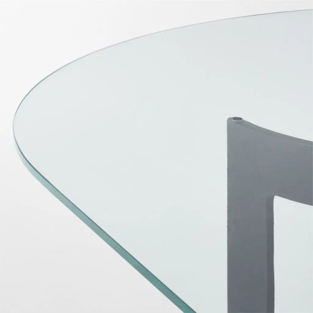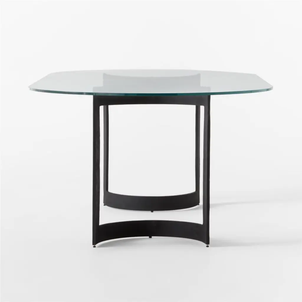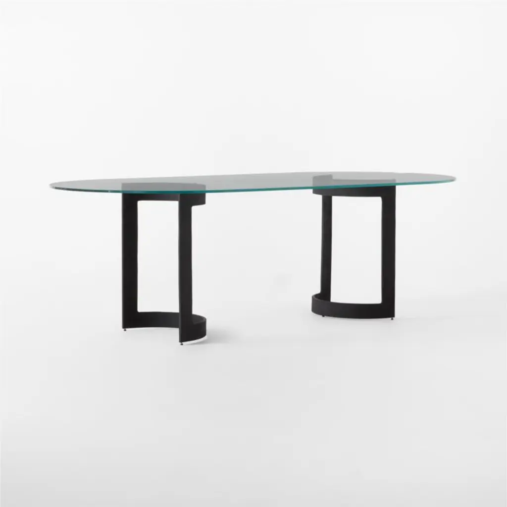 Black plaster-like bases anchor an oval glass top on this dining table designed by Mermelada Estudio. Ultra-clear glass is heat-treated for strength, minus the green edging often seen in tempered designs—it's a crisp, more high-end look. CB2 exclusive.