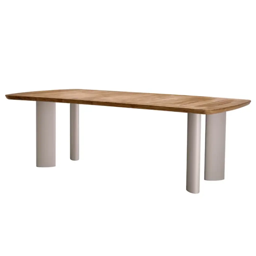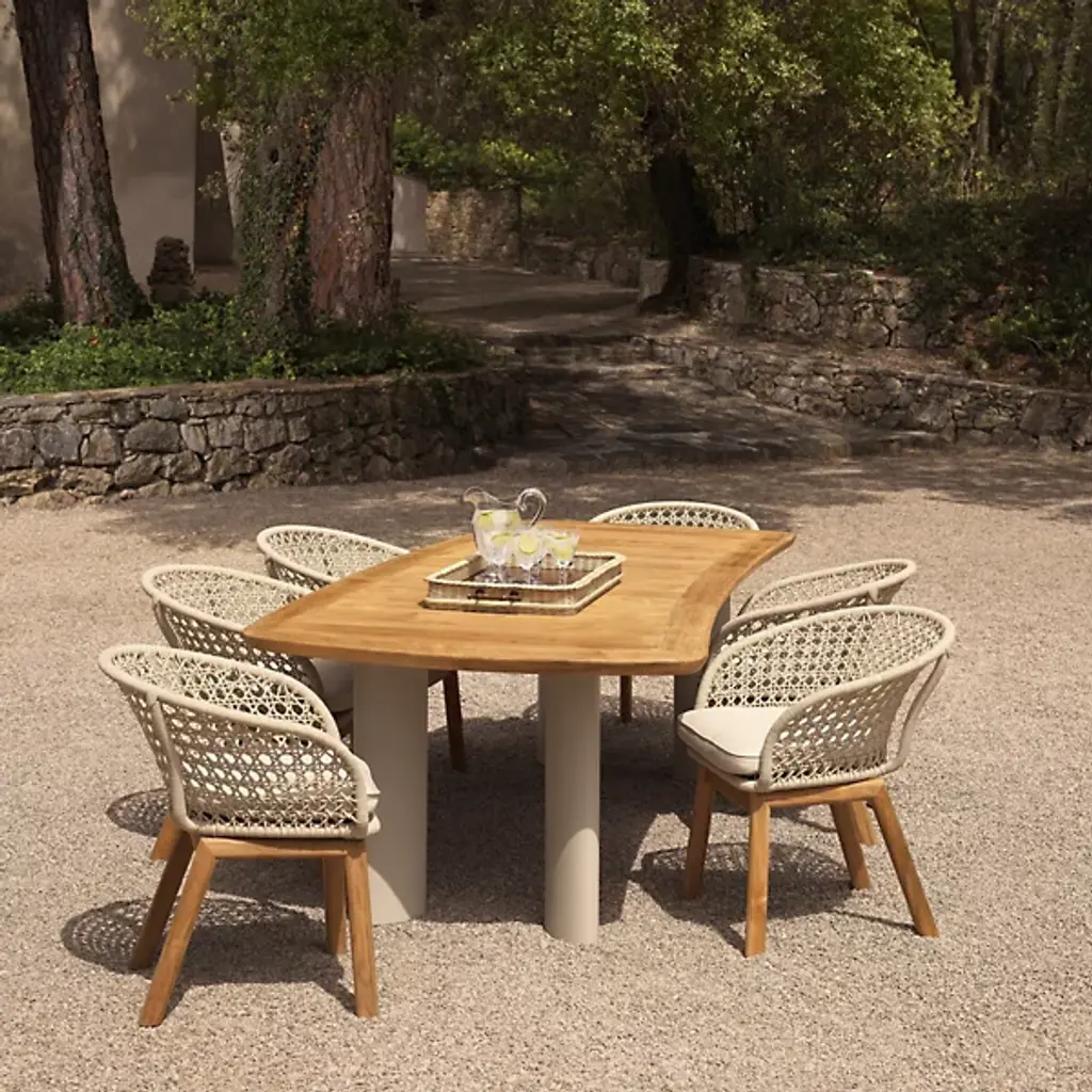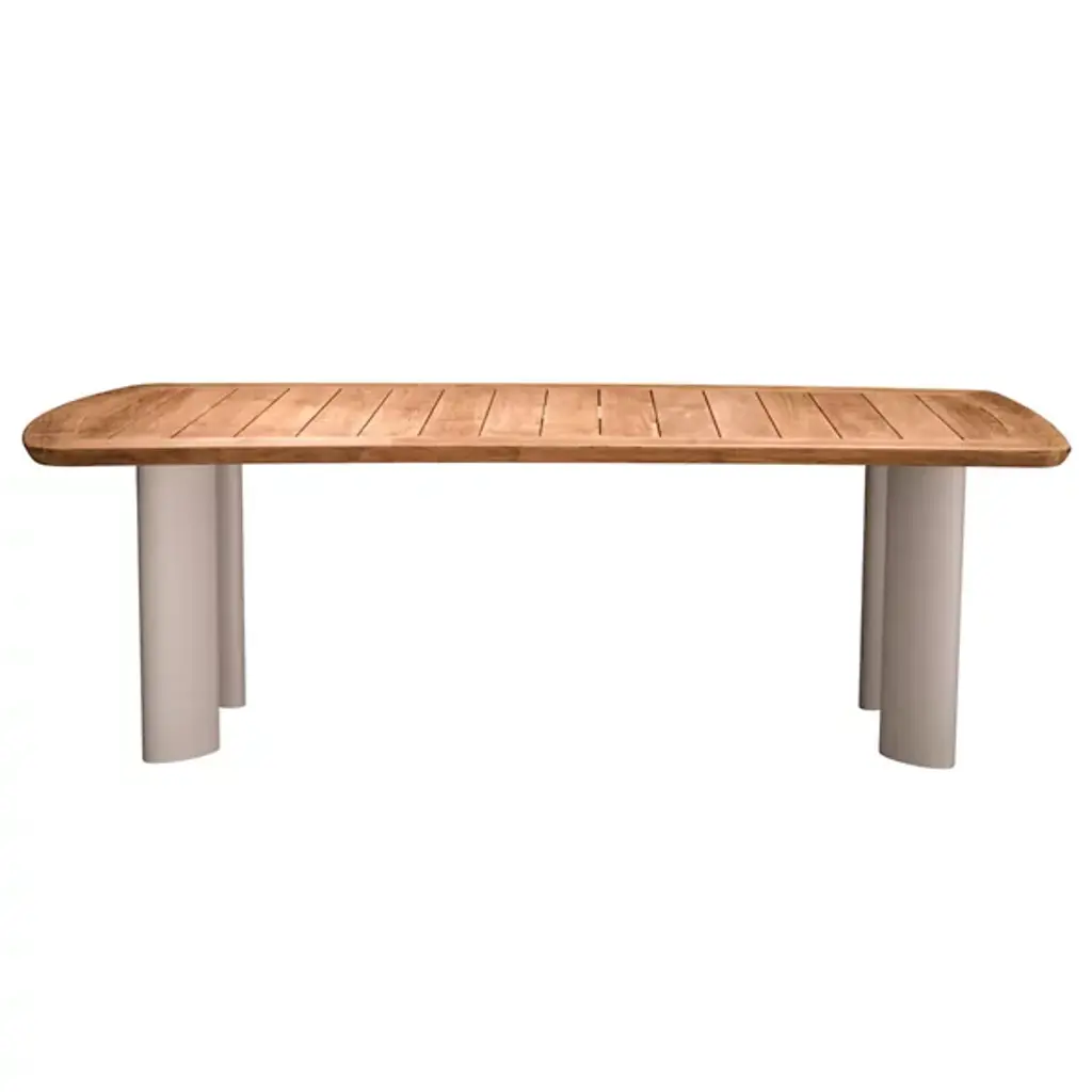 The Osario Outdoor Dining Table from Eichholtz blends elegance with contemporary style. Its tabletop is crafted from responsibly sourced Grade A teak wood, with a natural finish highlighting its unique nature and beauty. The table is supported by tall ellipse-shaped legs made from powder-coated aluminum, its textured finish ensuring durability and modern appeal. Each piece is made by skilled Indonesian artisans and designed to be a sophisticated centerpiece for any outdoor dining setting, combining airy style with sustainable manufacturing practices.