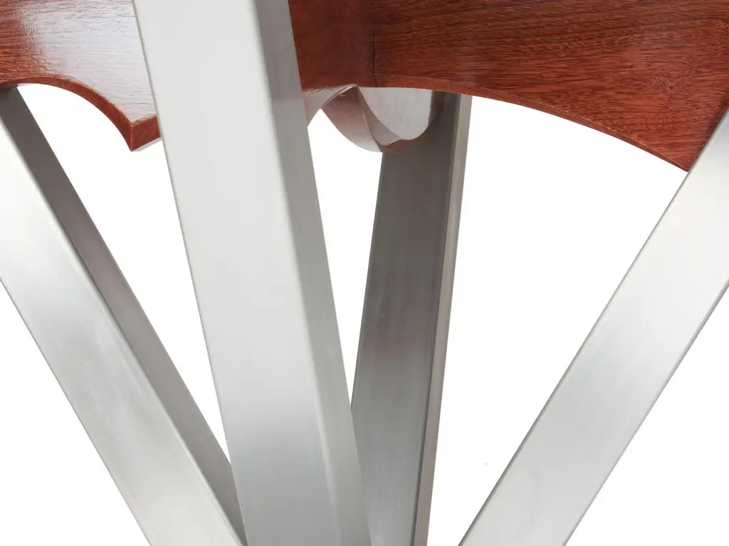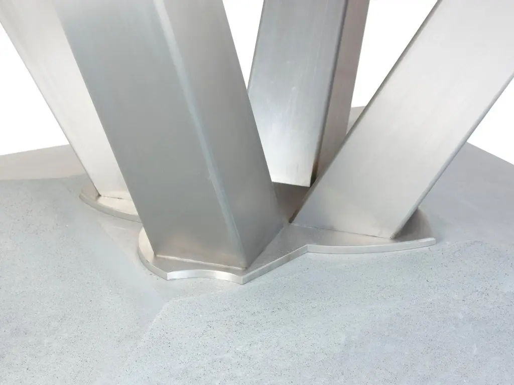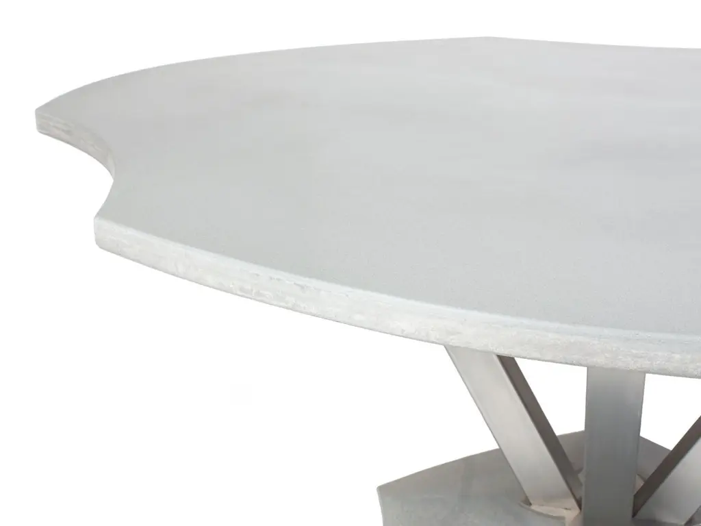 The Shore dining table was born of a desire to design a concrete outdoor table that was unlike anything I had seen. I wanted to find a way to introduce some freedom and spontaneity into the composition of the cast concrete top. I found a way to pinch and push what could have been a perfect circle into an expressive organic experience. The inns and outs of the table tops suggest places where people can comfortably sit. They also give people an excuse to caress the edge of the table as they circulate experiencing these movements. I did not want the experience to stop at the table top so I designed the base to mimic that freedom in terms of the word and the cast concrete of the foot. Those two elements are bridged with stainless steel members that meet to and equally complex stainless plateThe concrete table top is finished with an industrial finish that resists staining and etching.