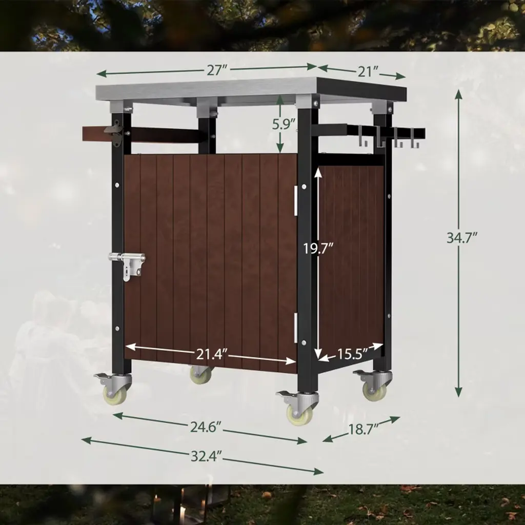 Name: Grill Cart Main Material: Metal + Wood Main Color: Brown Packing list: Grill Cart x 1 This BBQ grill cart serves not just as a grill station, but also functions as an outdoor bar, dining table, or mobile kitchen island. Whether you're cooking, mixing drinks, or hosting guests, it's an ideal outdoor accessory.