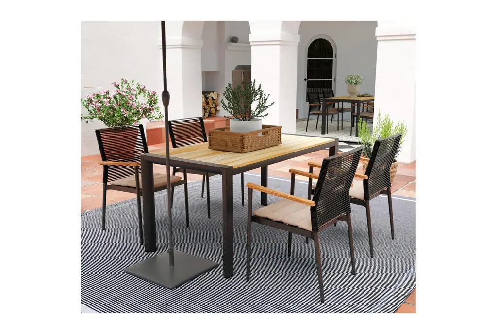 Elevate your outdoor dining with the Outdoor Modern Black Natural 65" Rectangle Metal Dining Table. Designed with both style and durability in mind, this table is perfect for any outdoor setting. Its sleek modern design and natural color will complement your outdoor decor beautifully.