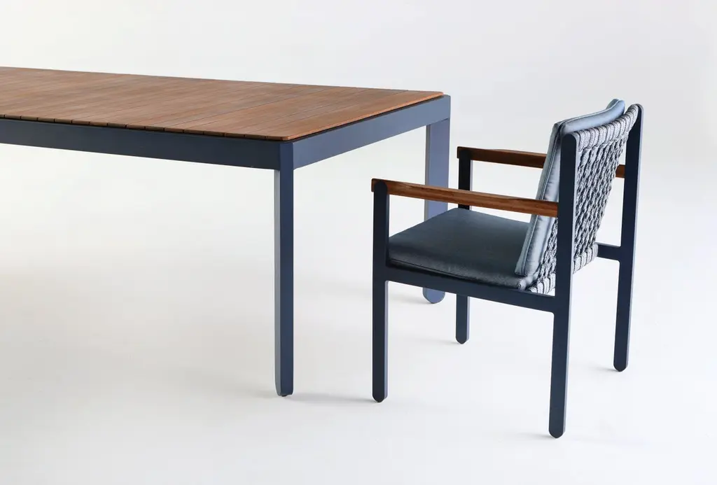 Fence collection concept The “Fence” collection concept is inspired by the countryside elements that are part of the daily life, to create this premium outdoor collection the main question asked was how to translate this basic elements in to interesting design solutions. In the project development journey we have chosen the silhouette from a regular fence object and started modelling the metal structure to hold a solid wood, outdoor ready arm. This union of “high low” is made possible using military grade aluminum that is milled from a solid block to obtain a seamless union, a breathing room for the wood is left, so it can adapt to most variety kinds of climates.The metal and solid wood structure are used together with a unique nautical hope that combines two types of sections to create a unique detail that is tangled together, and mounted in the structure to hold the upholstery. On the proportion side the objective was to use abundant upholstery elements studied in detail to have well-defined ergonomics that are a joy to use and invite users to experience pleasure and hours of use without compromises, balancing design and function to obtain a unique collection that uses premium material for the outdoors or an alternative to indoors.As most of our collection this line accepts COM, and we offer a wide variety of textiles, metal finishes, colors of rope and two woods, the sofas and tables may be customized in size, and we offer all modules to layout so it fits your next high-end project.In the case of COM we need to receive the materials in our facility.This collection is composed of, armchairs, sofas that may be customized in sizes, and its modules, coffee / center tables, dining chairs and dining tables.Dining tables design conceptIn the collection dining table we followed key elements that bring to life the aesthetics concept, combined with great stability, the surface top is made with solid wood combined with a solid metal frame to support it, it is a sturdy combination. To create the legs shape we use military grade aluminum blocks that are sculpted to create the full round shapes that work in synergy with the solid wood top. All materials used are outdoor ready and may be used indoors as well. The piece dimensions are customizable.