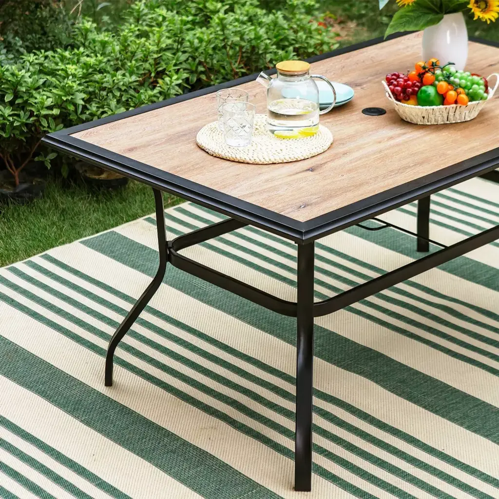 [CAPTIVA DESIGNS] Upgrade your outdoor dining with our 7pc Patio Dining Set. The black steel table seats 6, and the wood-like top adds indoor and outdoor elegance. Crafted from E-coating and powder-coated steel frame, this durable table seamlessly blends style, function and durability, making it the perfect choice for your outdoor dining needs. Elevate your outdoor space effortlessly with this stylish, comfortable, and durable dining set.FEATURES1.57" Dia umbrella hole for most market umbrellas.Wood-like table top with Elegant and natural appearance.Generously Spacious Design: Accommodates up to 6 peopleE-coating and powder-coated steel frame for a sturdy centerpiece.SPECIFICATIONDining Table: 28.7"H x 37.2"W x 59.6 "L, 27" (floor to apron height)Package Includes1 x dining table (1 box)Instruction Manual (come with the box)(Decorations on the table are not included)Tips: Allow all the holes in the section to line up correctly and then tighten the screws. Assembly: About 30 minutes to set up the table.