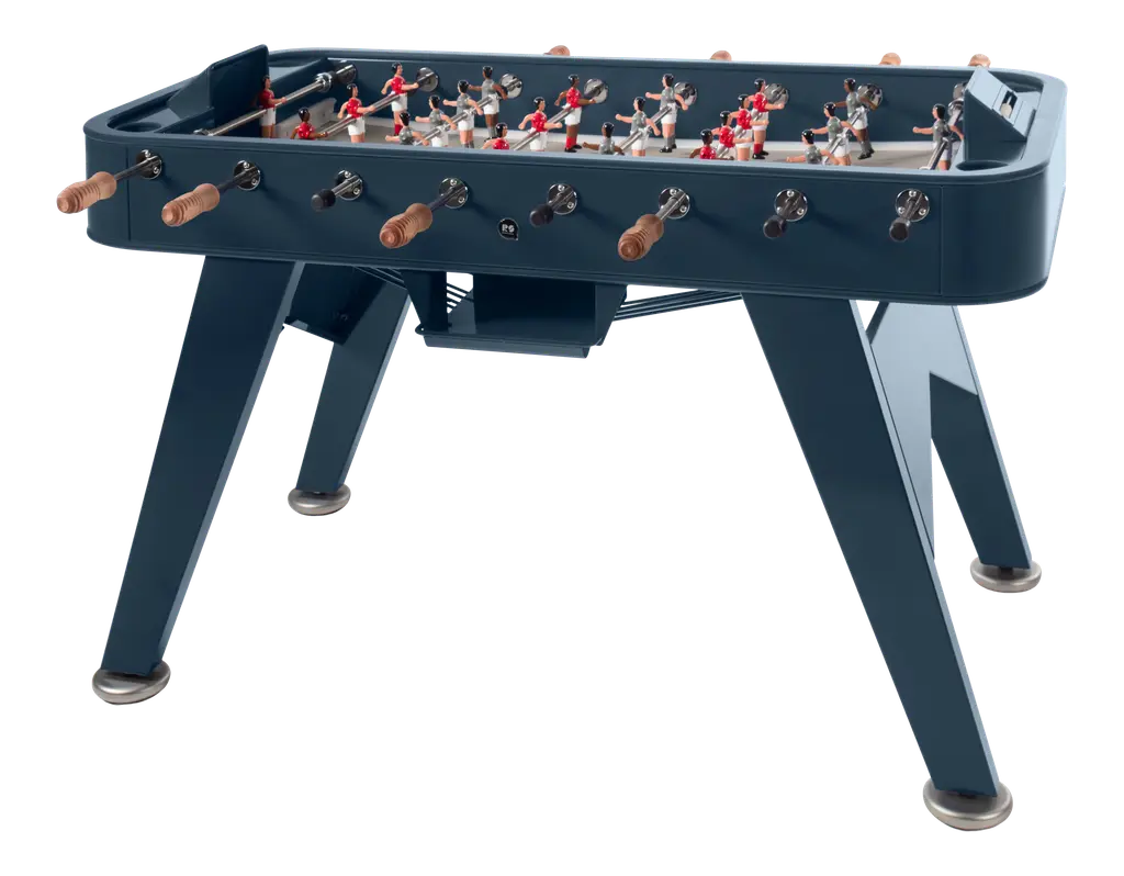 FOOSBALL TABLE RS2DESIGNED BY RAFAEL RODRÍGUEZ for RS BarcelonaRS2 is a design football table, a spectacular reinterpretation of one of the all time classics of Spanish game culture, specially dedicated to all those children who at one time or another said that “Adults don’t play, just work”For Residential Offices HospitalityIntense useIndoor & OutdoorCustomisation optionsAlmost assembledDesigned & Manufactured in SpainYes. The RS2 is a spectacular reinterpretation of one of our game cultural classics. It’s a metal Foosball table manufactured with high-quality materials and with very elegant colors. Its timeless design fits into any environment and space and its hardy structure makes it very resistant, stable and long-lasting piece. To play to the highest level and enjoy it fr all your life.The RS2 is an indoor and outdoor Foosball table, so you can have it both in the dining room or in the game room, as well as on the terrace or in the garden.The RS2 also makes the difference in the details, like the four glass-holders (one for each player) or the rubber-based levelers. Each color (white, black, red, blue, green, light-grey, and pink) comes with standard team kits. But the RS2 is also a customizable Foosball table and you can play with your favorite teams.You can choose the line-up (3-3-4 or 2-5-3), the color of the field, if the players are 1 or 2 feet or if you want them to be boys, girls or mixed teams and even the skin color. So you can design your own RS2 and make it a unique piece.The RS2 is an RS Barcelona Foosball table, a brand of intense living products. Products which, with a high design value, high-quality materials, and functionality, offer innovative solutions through a combination of the fine details of craftsmanship and the precision of industrial manufacturing.RS Barcelona’s products are much more than products. They’re experiences. They’re unforgettable and unique moments. They’re a way of understanding and approaching life that can be summed up in one pledge: intense living.It comes with the field a little bit concave, so the ball doesn't stop moving, this way the game is more dynamic.Colors: Inox, white, black, red, blue, greenFavorite teams. Line-up (3-3-4 or 2-5-3)Color of the fieldPlayers: 1 or 2 feet; boys, girls or mixed teams, skin colorQuick Ship (2-3 weeks) inox metal color. Standard team kitsEstimated Delivery time: 9-10 weeks for custom ordersStructureIndoor version: Steel structure and micro textured powder coated polyester paint. Outdoor version: Shot blasted stainless steel lacquered. Inox color: Sand blasted stainless steel and metal varnished.FieldHPL.PlayersCast aluminium.HandlesWood.Measures (LxWxH)150x128x96,5 cm / 59x51x38 inWeight89 kg / 196.2 lbIncludes:Ball set7 units (5 standard balls and 2 silent balls)2 extra players1 per team.