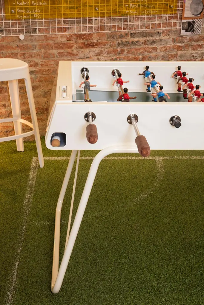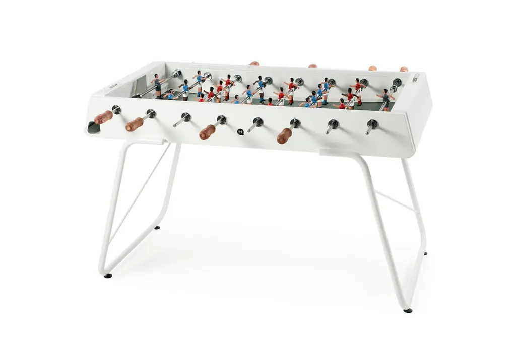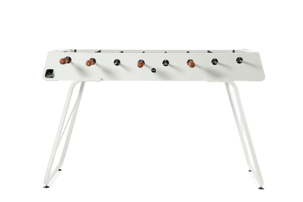 FOOSBALL TABLE RS3 in WhiteDESIGNED BY RAFAEL RODRÍGUEZ for RS BarcelonaIt all begins with “Shall we have a game?” The RS3 football table injects colour into the game. There are winners and losers, but everyone has a great time. Because playing is all about having fun and sharing time together.For Residential Offices HospitalityIntense useIndoor & OutdoorCustomisation optionsAlmost assembledDesigned & Manufactured in SpainThe RS3 is a spectacular reinterpretation of one of our game cultural classics. It’s a metal Foosball table manufactured with high-quality materials and with flashy colors that it doesn’t go unnoticed and fills with color each game.Its design fits into any environment and space and its steel structure makes it very resistant, stable and long-lasting piece.To play to the highest level and enjoy it for all your life. The RS3 is an indoor and outdoor Foosball table, so you can have it both in the dining room or in the game room, as well as on the terrace or in the garden.Each color (white, black, red, blue, green and yellow) comes with standard team kits. But the RS3 is also a customizable Foosball table and you can play with your favorite teams.You can choose the line-up (3-3-4 or 2-5-3), the color of the field, if the players are 1 or 2 feet or if you want them to be boys, girls or mixed teams and even the skin color. So you can design your own RS3 and make it a unique piece.It comes with the field a little bit concave, so the ball doesn't stop moving. This way the game is more dynamic.The RS3 is an RS Barcelona Foosball table, a brand of intense living products. Products which, with a high design value, high-quality materials and functionality, offer innovative solutions through a combination of the fine details of craftsmanship and the precision of industrial manufacturing.RS Barcelona’s products are much more than products. They’re experiences. They’re unforgettable and unique moments. They’re a way of understanding and approaching life that can be summed up in one pledge: intense living.StructureSteel with cataphoretic coating process and micro textured powder coated polyester paint.FieldHPL.PlayersCast aluminium.HandlesWoodMeasures (LxWxH)151x128x92 cm / 59.5x51x36 inWeight66 kg / 145.5 lbIncludes:Ball set7 units (5 standard balls and 2 silent balls)2 extra players1 per teamQuick Ship (2-3 weeks) White and black colors.Estimated Delivery time: 9-10 weeks for the rest of the colors and Custom orders.