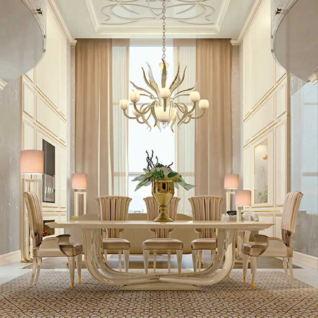 Elevate your dining experience with our elegant Oval Dining Table from the Redeco Trilogy collection. Crafted with a wooden structure and adorned with a handcrafted striped design, this table exudes luxury. The glossy Pearl Cappuccino finish, accented with gold metal details, adds a touch of sophistication to your home.