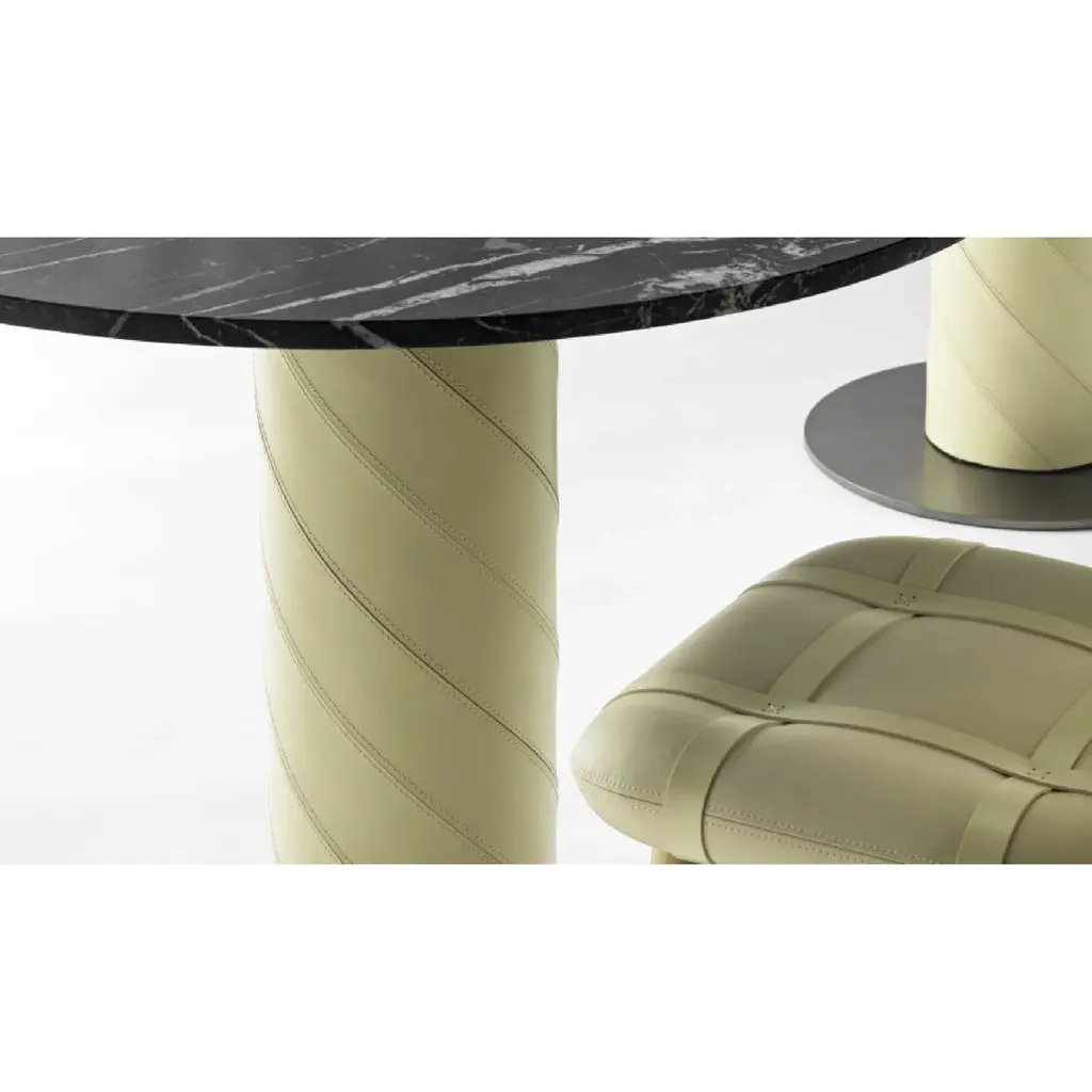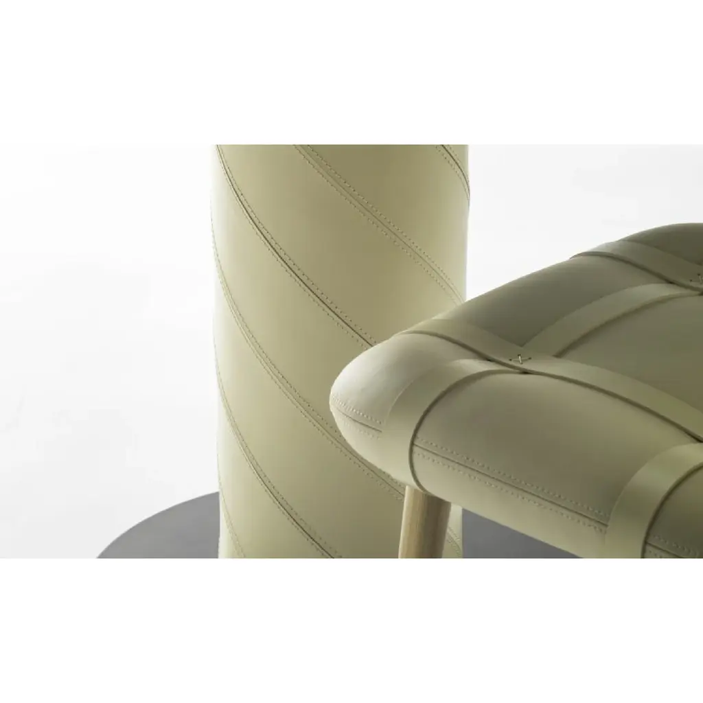 Rolling 2B is an oval table featuring two columns made of steel wrapped in full-grain leather by Fasem, crafted in a spiral design with visible stitching. The base is made of steel and is available in various finishes by Fasem. The top of the column is exposed to stainless steel. The tabletop is made of transparent or smoked tempered glass. It is ideal for residential and representative meeting environments or as an executive desk.