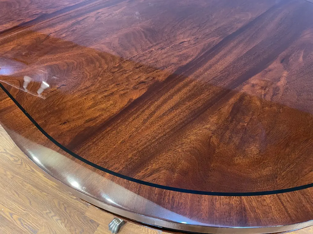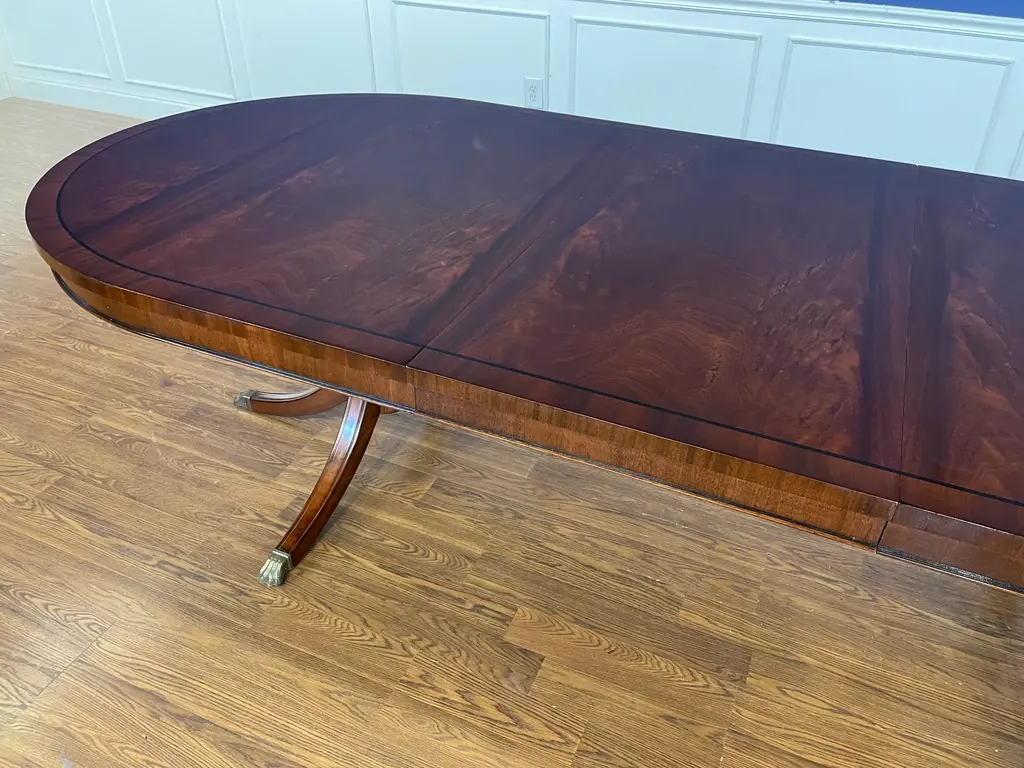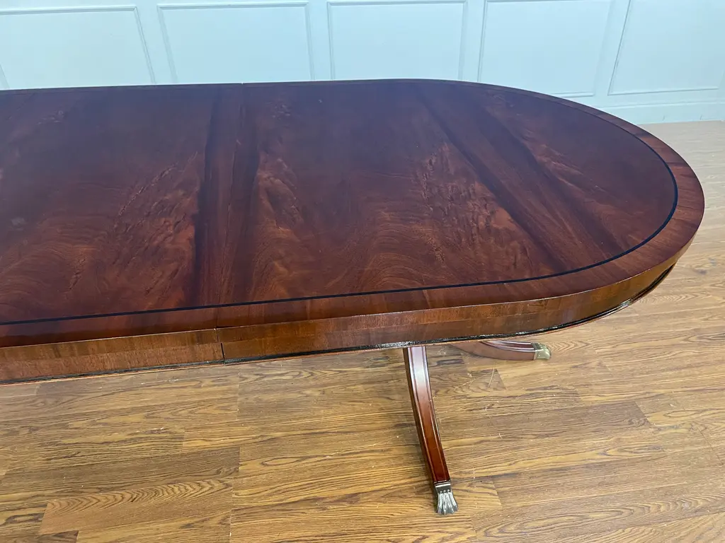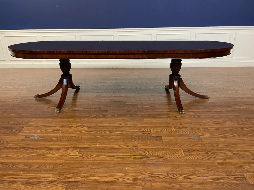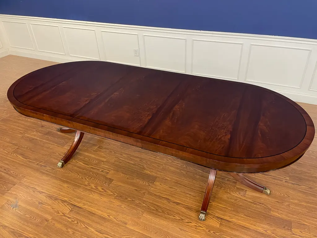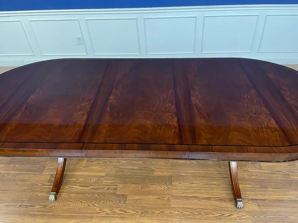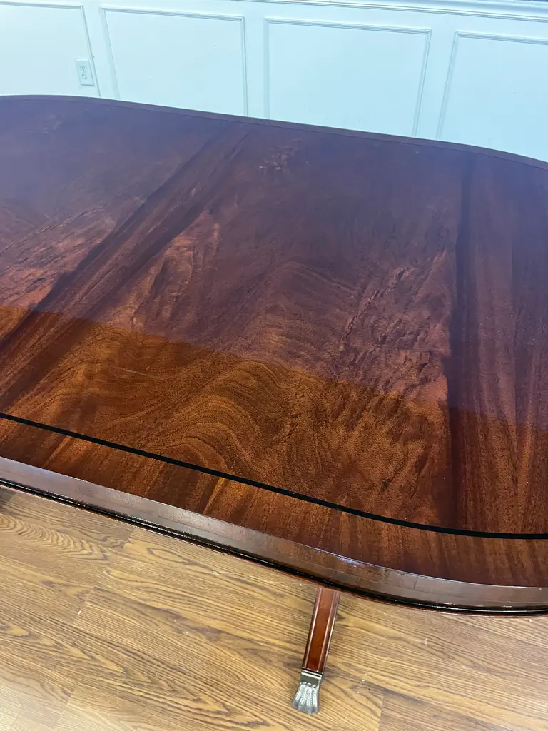 This is an oval mahogany double pedestal dining table that is made-to-order in the Leighton Hall shop in Suwanee, Georgia. It features a field of swirly crotch mahogany with a straight grain border. The pedestals have fluted legs which terminate with antique brass lion’s paw feet. The finish is a medium brown mahogany color with a hand rubbed and polished semigloss sheen. Dimensions: Length: 85”; Width: 48”; One 24” leaf; Total length with leaf inserted: 109”; Height: 30” Estimated production time is 12 weeks.