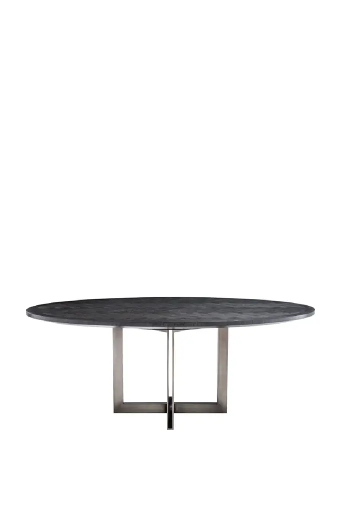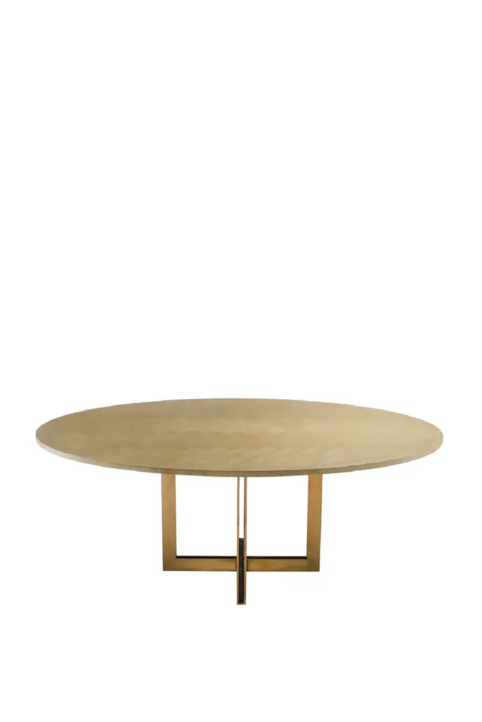 Give your decor a Mid-Century Modern appeal with the stunning oak veneered Melchior Dining Table that features a sturdy base with a brass finish. As the beautiful herringbone pattern of this oval dining table shows, veneers are very suitable for marquetry. High-quality veneer lasts longer than solid wood, which warps or cracks over time.