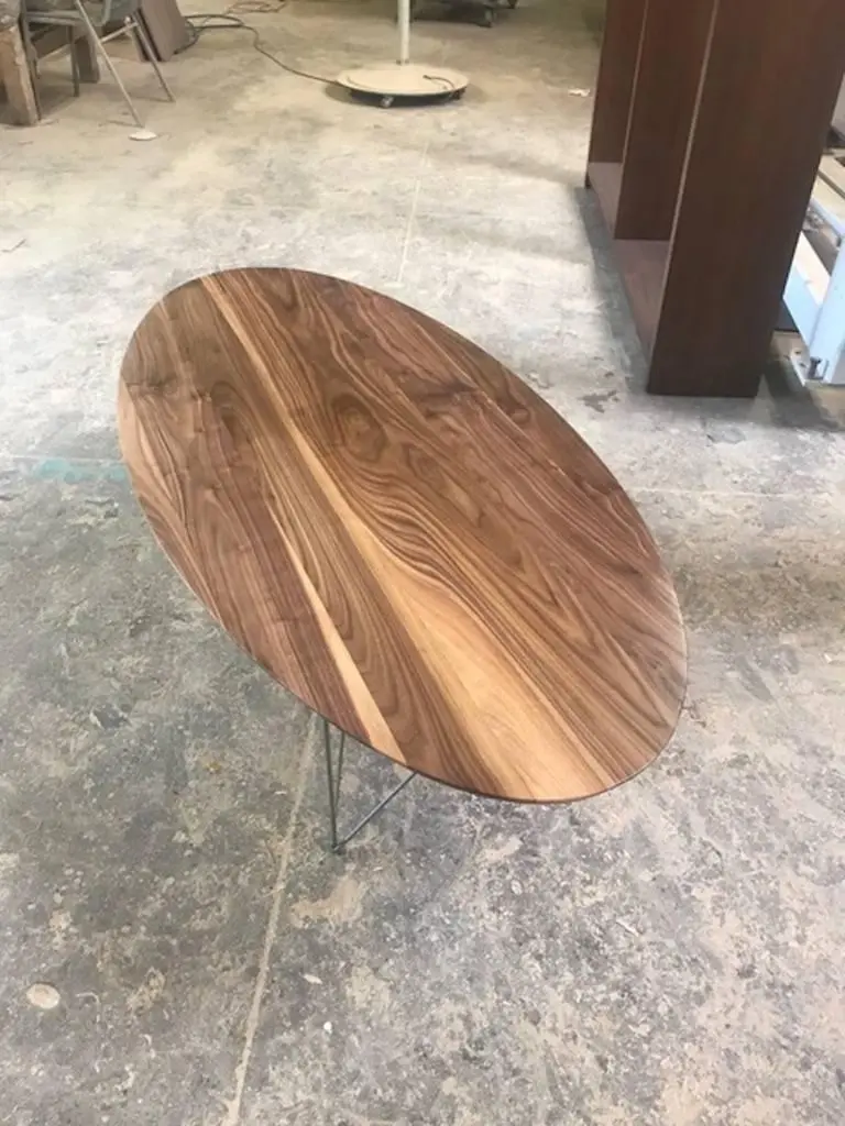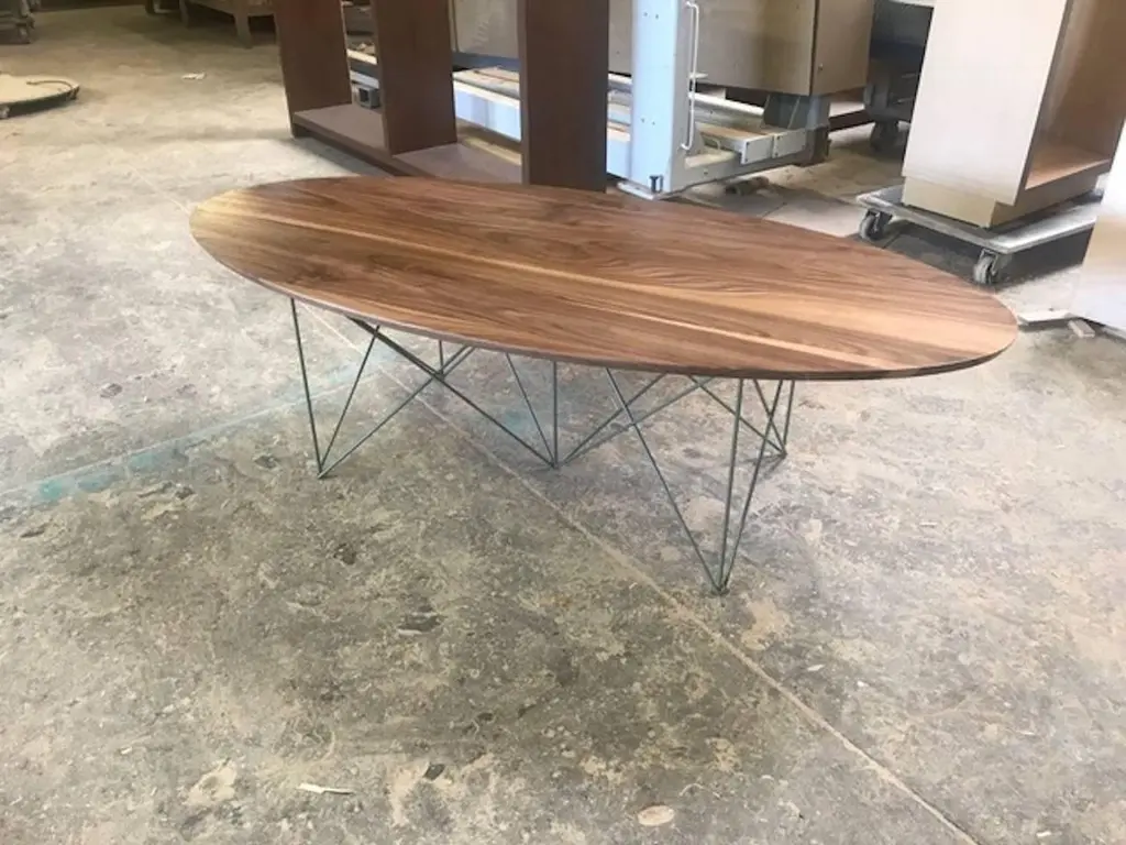 Inspired by the simplicity of midcentury design, the McManus dining table feels light and airy. The base is created using a stainless steel, power coated frame. The top shown is solid walnut in an oval surfboard shape with a bevelled edge. The top can be customizable with regard to wood species, finishing and shape. Made in California.