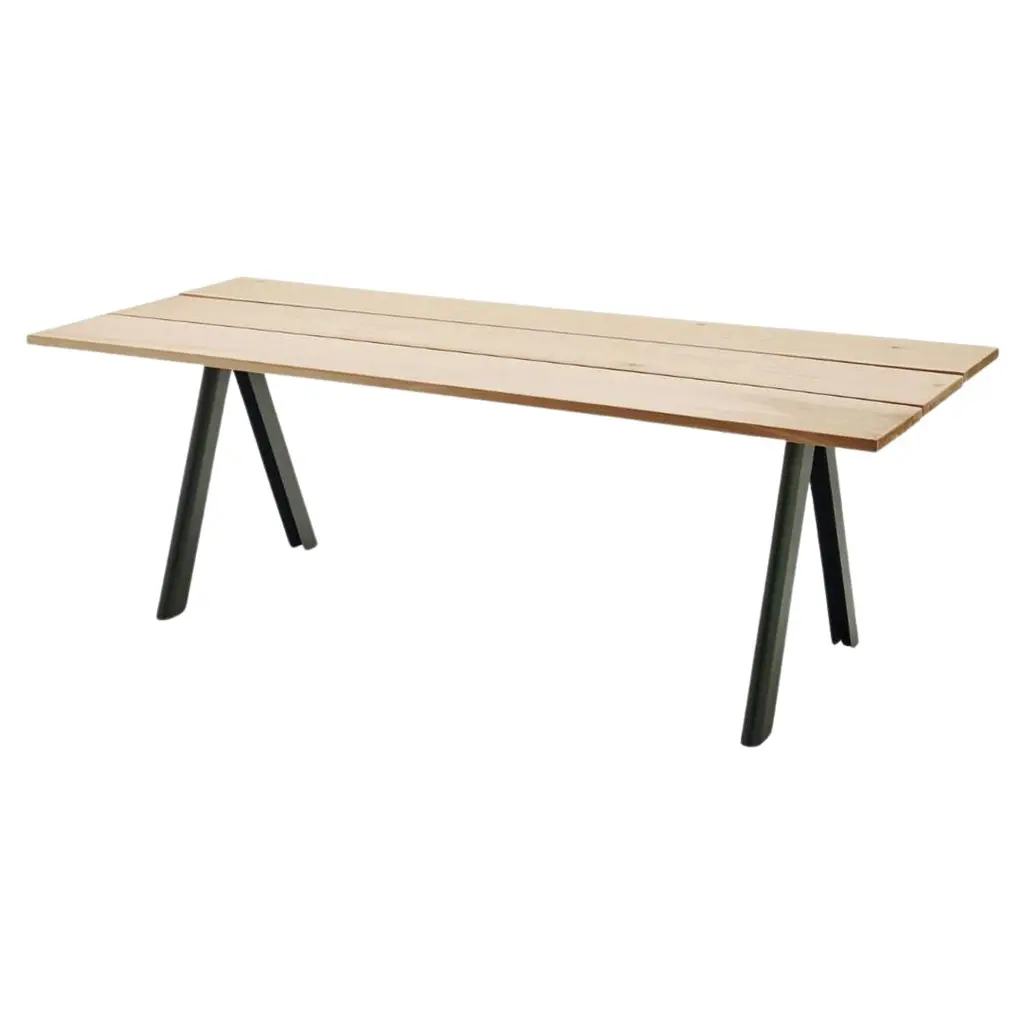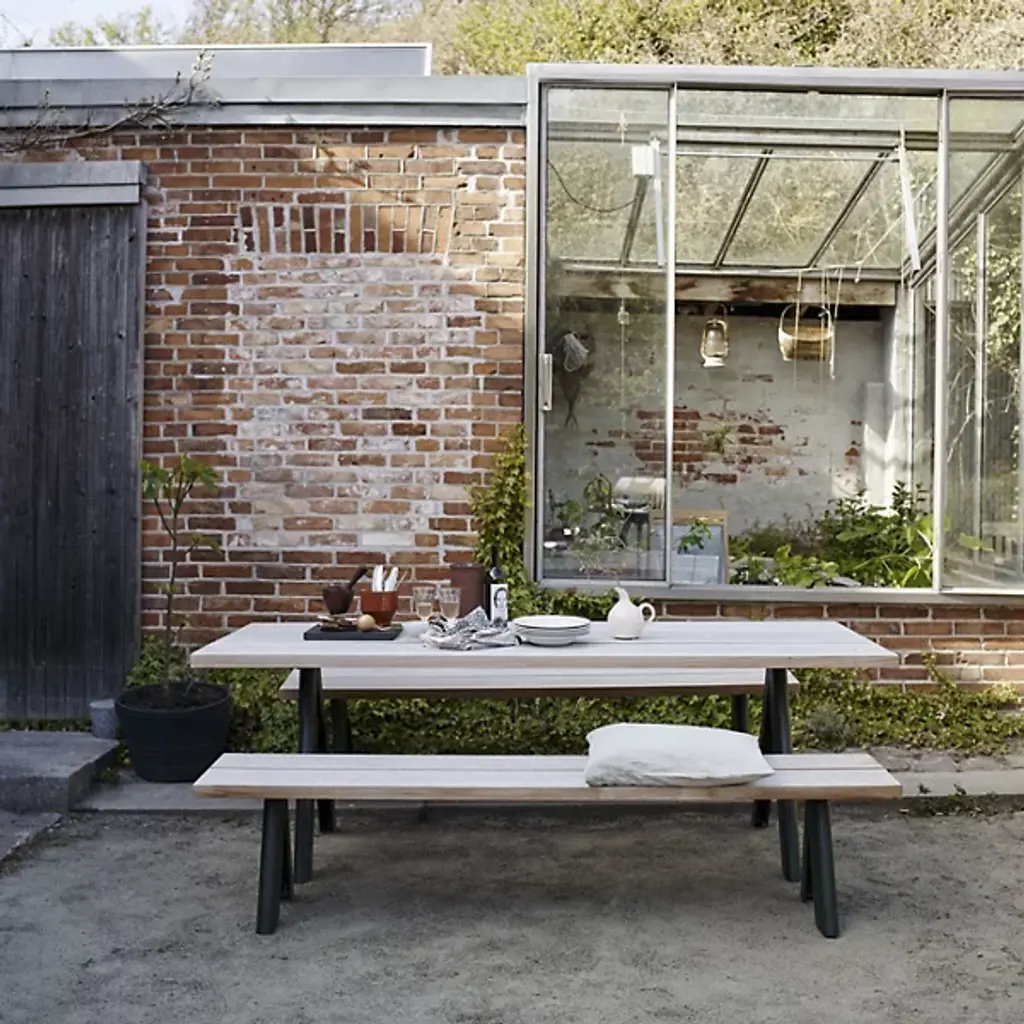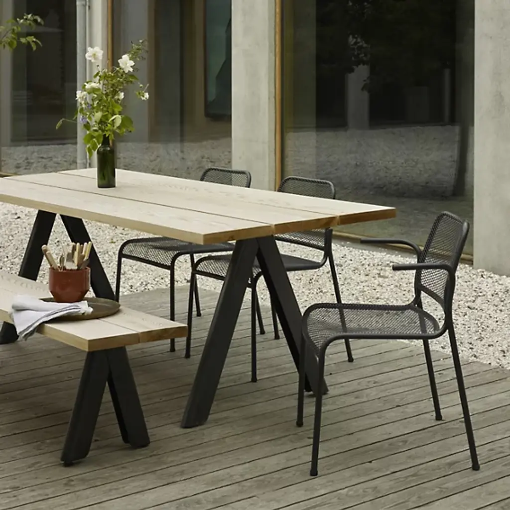 Strong materials balance on top of each other to create the visually light yet structurally sound Overlap Outdoor Dining Table from Fritz Hansen. Designer TAF Architects’ work is based on a collaborative design approach. This TAF Architects piece highlights the contrast of wood and metal. These materials are paired with simple shapes that appeal to modern and contemporary tastes. The powder-coated steel base stands with bold angles covered in a uniform finish. This even finish showcases the distinct grain and organic hues of the patinating wood placed on top. The wood tabletop is arranged in a familiar slatted design for a warm, inviting feel.