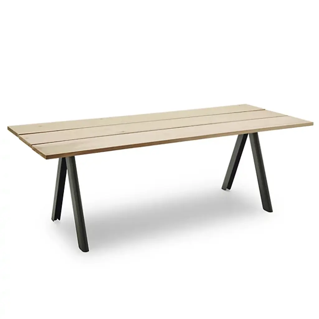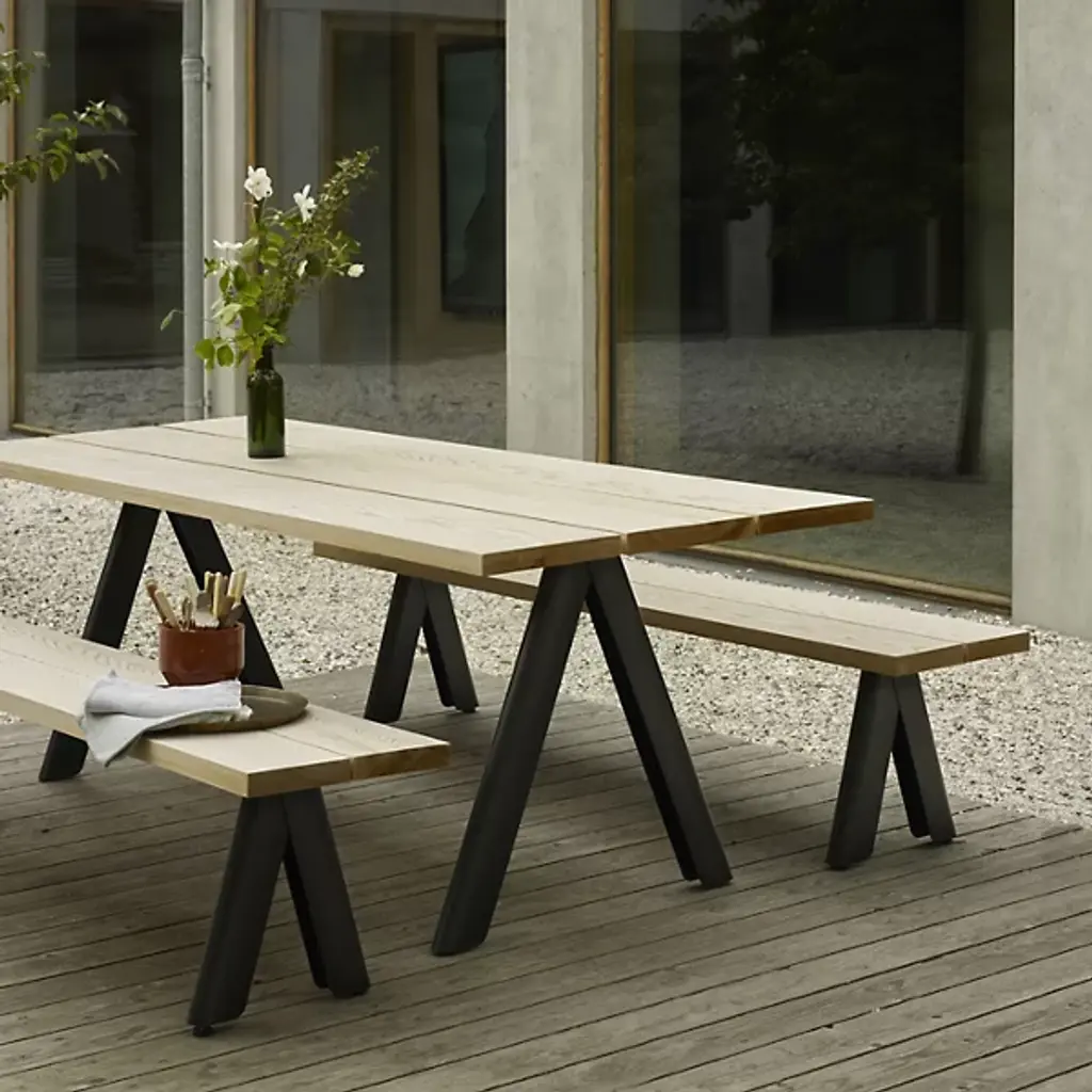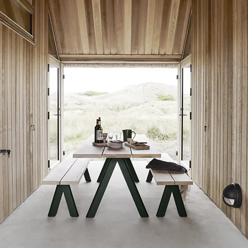 Strong materials balance on top of each other to create the visually light yet structurally sound Overlap Outdoor Dining Table from Fritz Hansen. Designer TAF Architects’ work is based on a collaborative design approach. This TAF Architects piece highlights the contrast of wood and metal. These materials are paired with simple shapes that appeal to modern and contemporary tastes. The powder-coated steel base stands with bold angles covered in a uniform finish. This even finish showcases the distinct grain and organic hues of the patinating wood placed on top. The wood tabletop is arranged in a familiar slatted design for a warm, inviting feel.