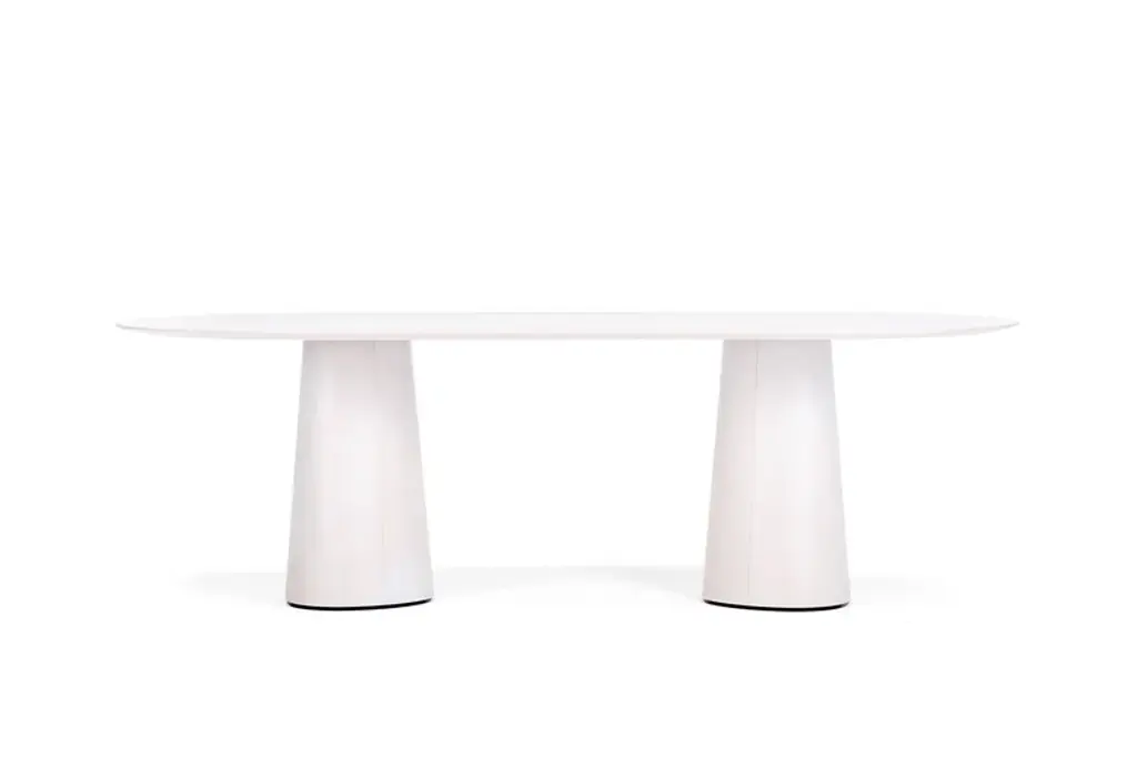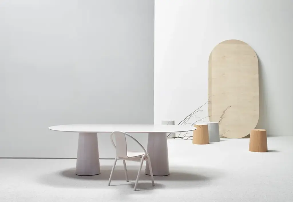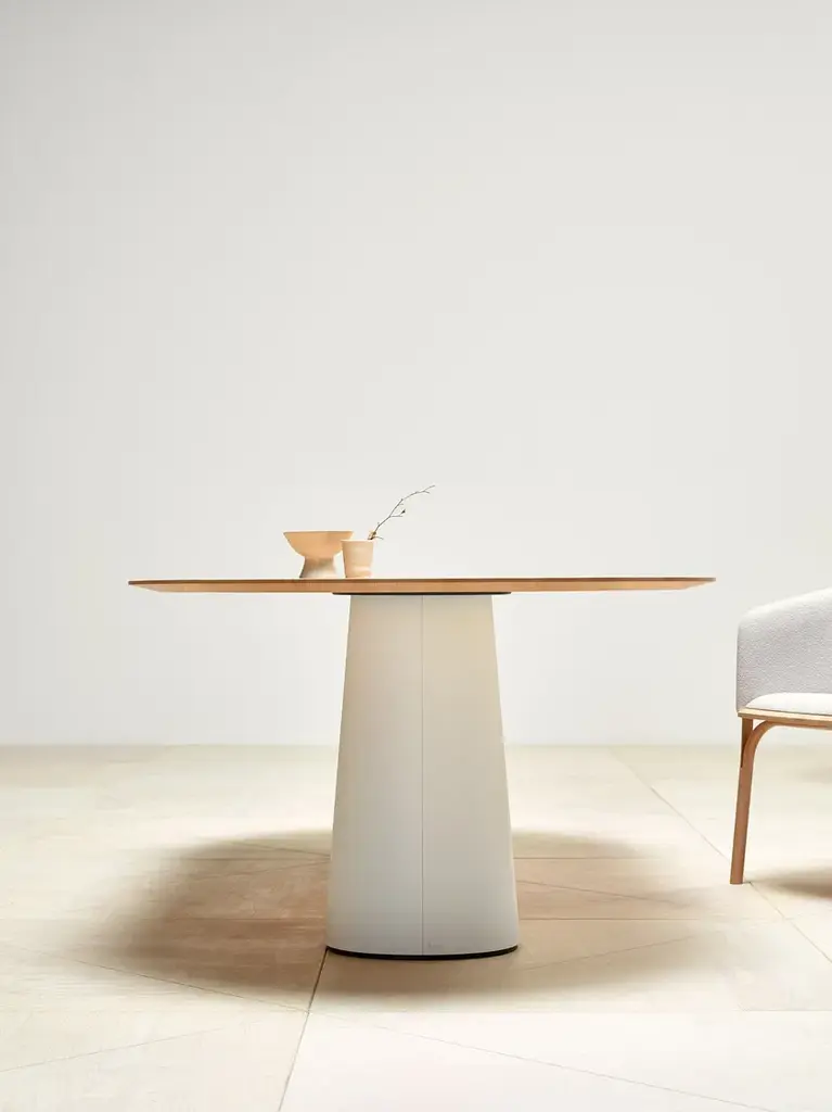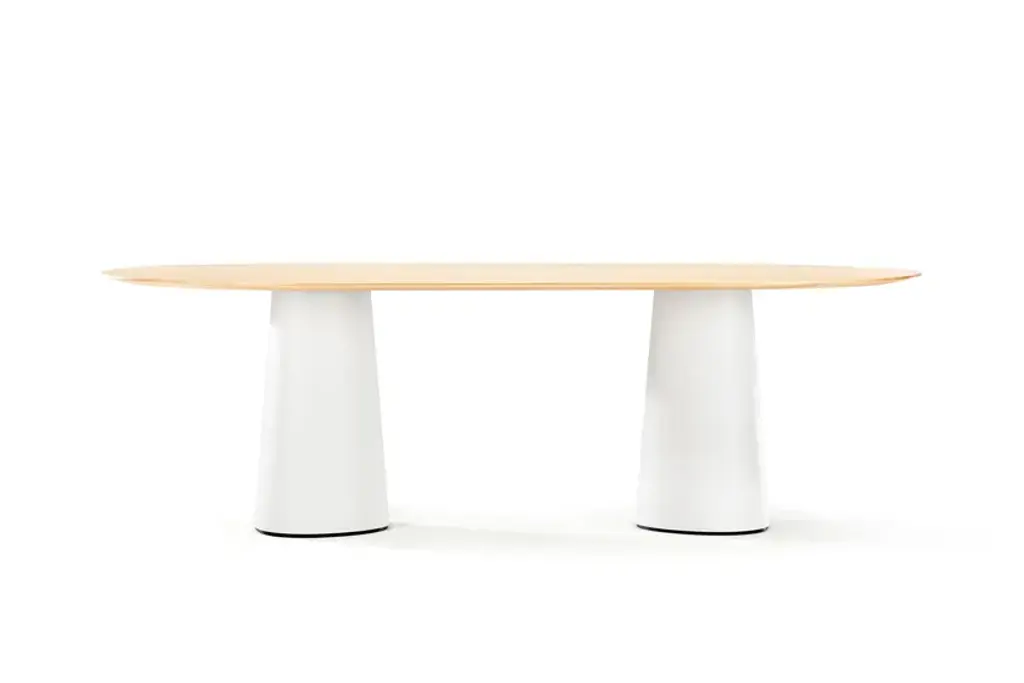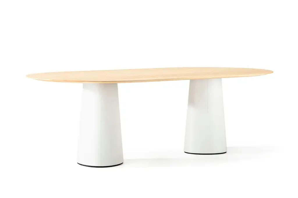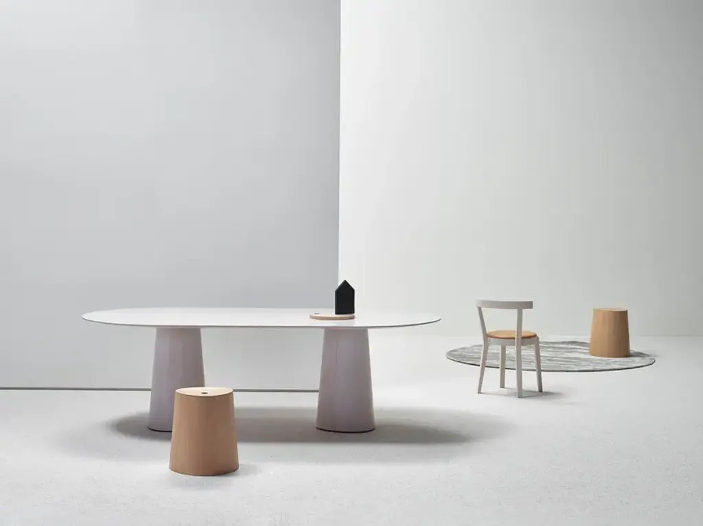 P.O.V. 464 is a wooden table. While it may look discreet, this P.O.V. table has the potential to command a room – it all depends on your point of view. At 73 cm high and 40 cm wide, the two bases provide complete stability and support for a large tabletop. This version can be paired with three different tabletop shapes.The P.O.V. collection features a modular design and an organically shaped table base. While it may look discreet, a P.O.V. table has the potential to command a room – it all depends on your point of view. P.O.V. tables come in two heights, three base types and six tabletop shapes. The modular system boasts nearly 70 variations, making it suitable for almost any interior – an office, dining hall, cafe or restaurant. The collection includes a stackable dining stool of the same name, which serves both a functional as well as a playful role. The collection is available in three types of wood – beech, oak and American walnut – and finished in various colours.