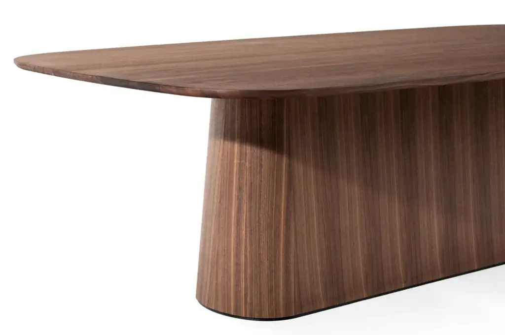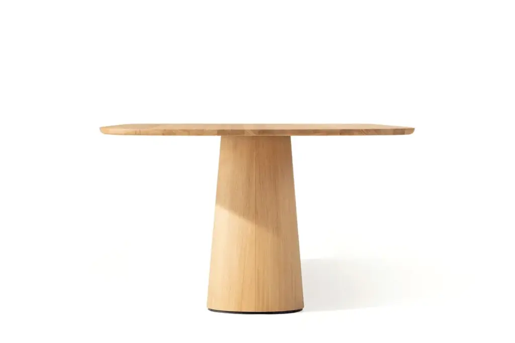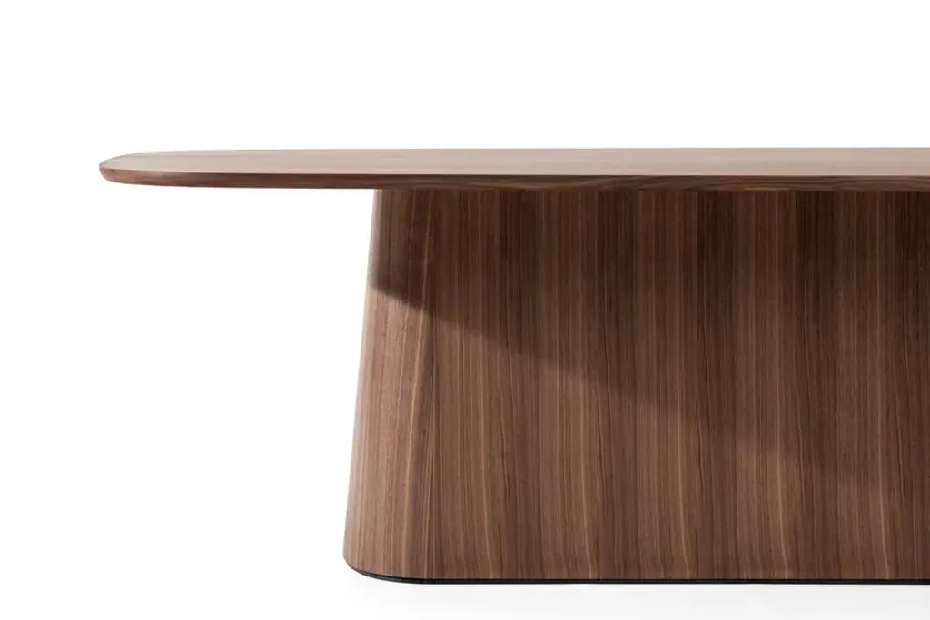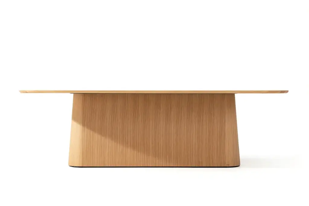 The P.O.V. collection features a modular design and an organically shaped table base. While it may look discreet, this P.O.V. table has the potential to command a room – it all depends on your point of view. At 73 cm high, 40 cm wide, and 172.5 cm long, the elongated central base provides complete stability and support for a large tabletop. This version can be paired with three different tabletop shapes.The P.O.V. collection features a modular design and an organically shaped table base. While it may look discreet, a P.O.V. table has the potential to command a room – it all depends on your point of view. P.O.V. tables come in two heights, three base types and six tabletop shapes. The modular system boasts nearly 70 variations, making it suitable for almost any interior – an office, dining hall, cafe or restaurant. The collection includes a stackable dining stool of the same name, which serves both a functional as well as a playful role. The collection is available in three types of wood – beech, oak and American walnut – and finished in various colours.