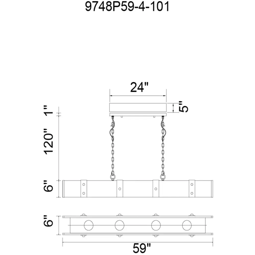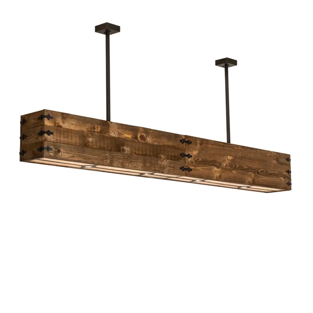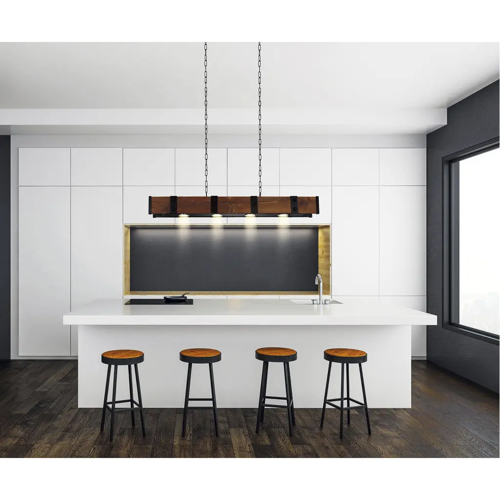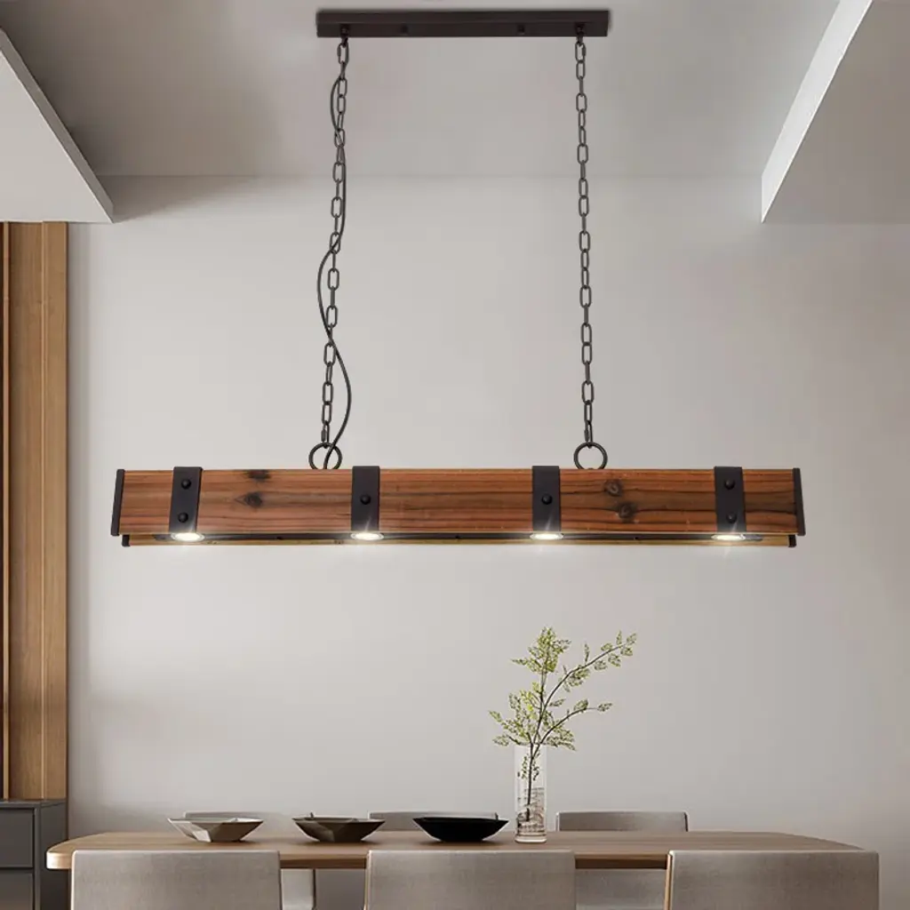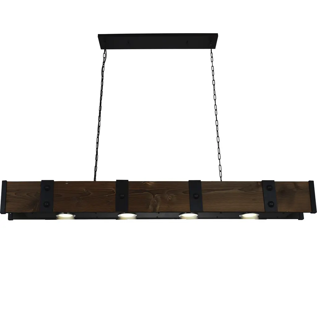 The Pago 4 Light Chandelier offers a stylish and practical alternative to an exposed wood beam ceiling. Featuring a 59-inch linear design with a wood and metal shade in black and wood grain brown, this fixture adds rustic-industrial charm to any space. Compatible with twist-and-lock LED GU10 bulbs (sold separately), its perfect for illuminating dining tables or kitchen islands. Elevate your decor with this chic, oversized lighting solution.