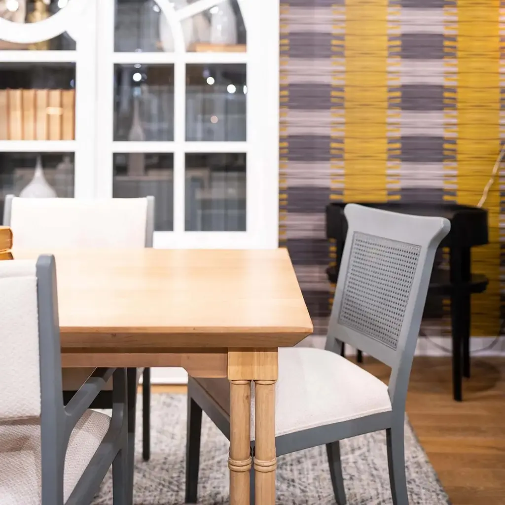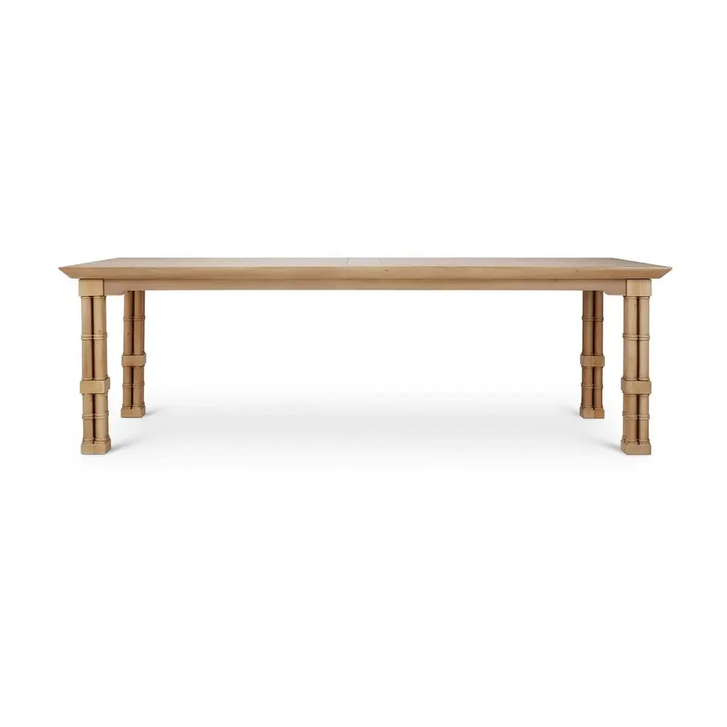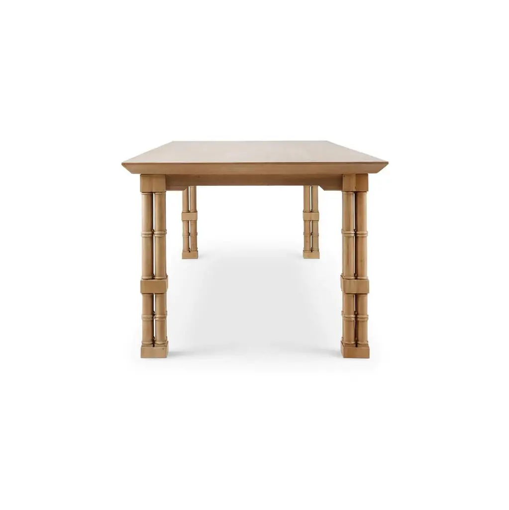 Hand-carved from mahogany and shown in our light fruitwood finish, this statement table features faux bamboo legs in the form of classic English cluster columns, joined by an X-form stretcher that adds both stability and architectural flair.The round top rests on a beautifully sculpted base that evokes the graceful tropical luxury of vintage Palm Beach interiors. Designed to bring charm and character to coastal, regency, or transitional spaces, it serves as an inviting centerpiece for casual meals and formal gatherings alike. This piece reflects elevated craftsmanship while exuding warmth, ease, and historic detail.Dimensions: 96" W x 40" D x 30" HThis finish requires bleaching, which often leads to variation in wood color.Custom finish options are also available. Contact us to learn more.Lead time 20 - 24 weeks.