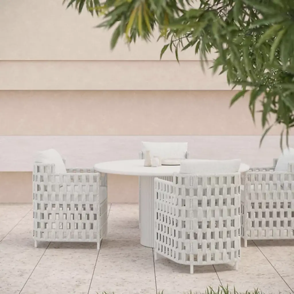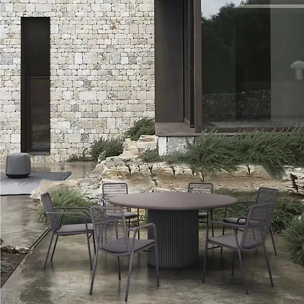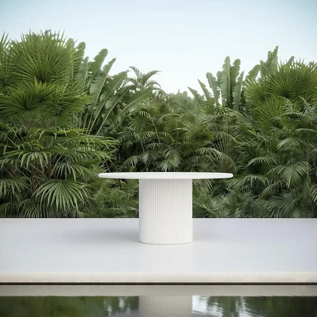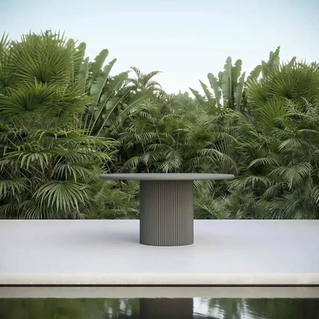The Palma Outdoor Dining Table from Azzurro Living showcases fluted tambour construction that creates rhythmic vertical lines around its substantial cylindrical base. The table's aluminum construction achieves both durability and refined detailing through precision powder coating techniques that resist weathering and wear. Its circular top provides generous surface area while the base's fluted pattern adds textural interest without overwhelming the design's clean geometry. The table's coastal modern aesthetic emerges through careful attention to proportion and finishing techniques, demonstrating refined outdoor dining solutions.