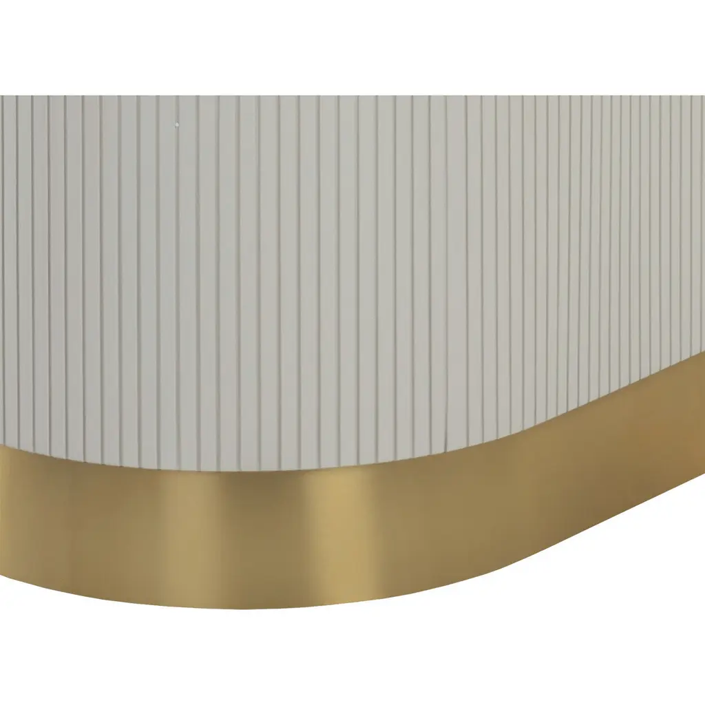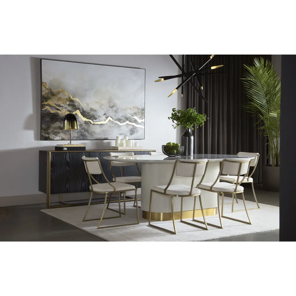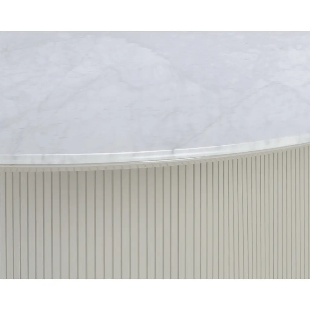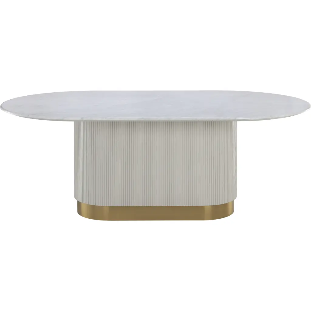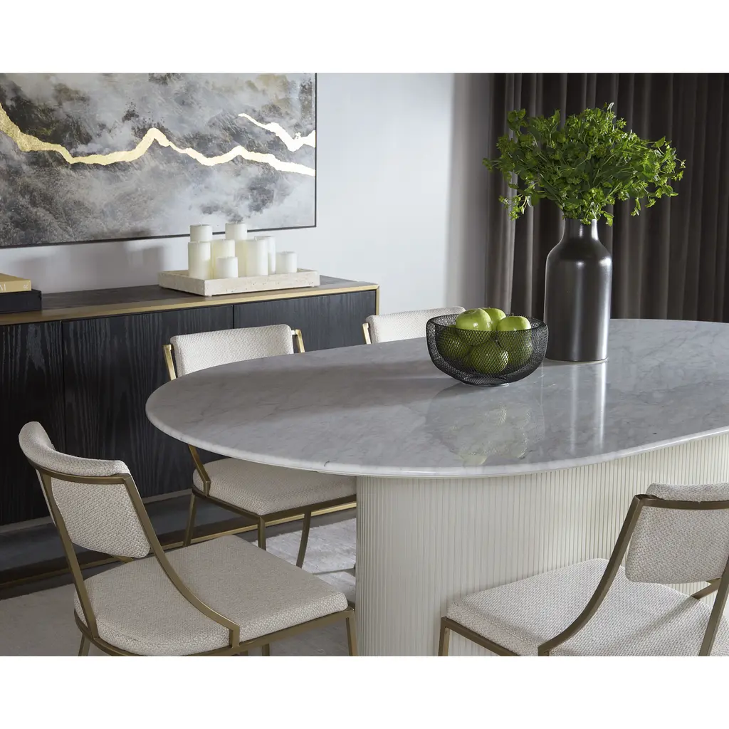 The Paloma Dining Table brings a sculptural spirit to any dining space. The smooth white marble tabletop contrasts with a textured high gloss cream base that features intricate vertical reeding. A gold stainless inlay at the bottom creates added definition. As marble is a natural material, unique veining, pitting, fissures, micro-cracks and colour variations are all characteristics that add to the uniqueness and beauty of each piece.