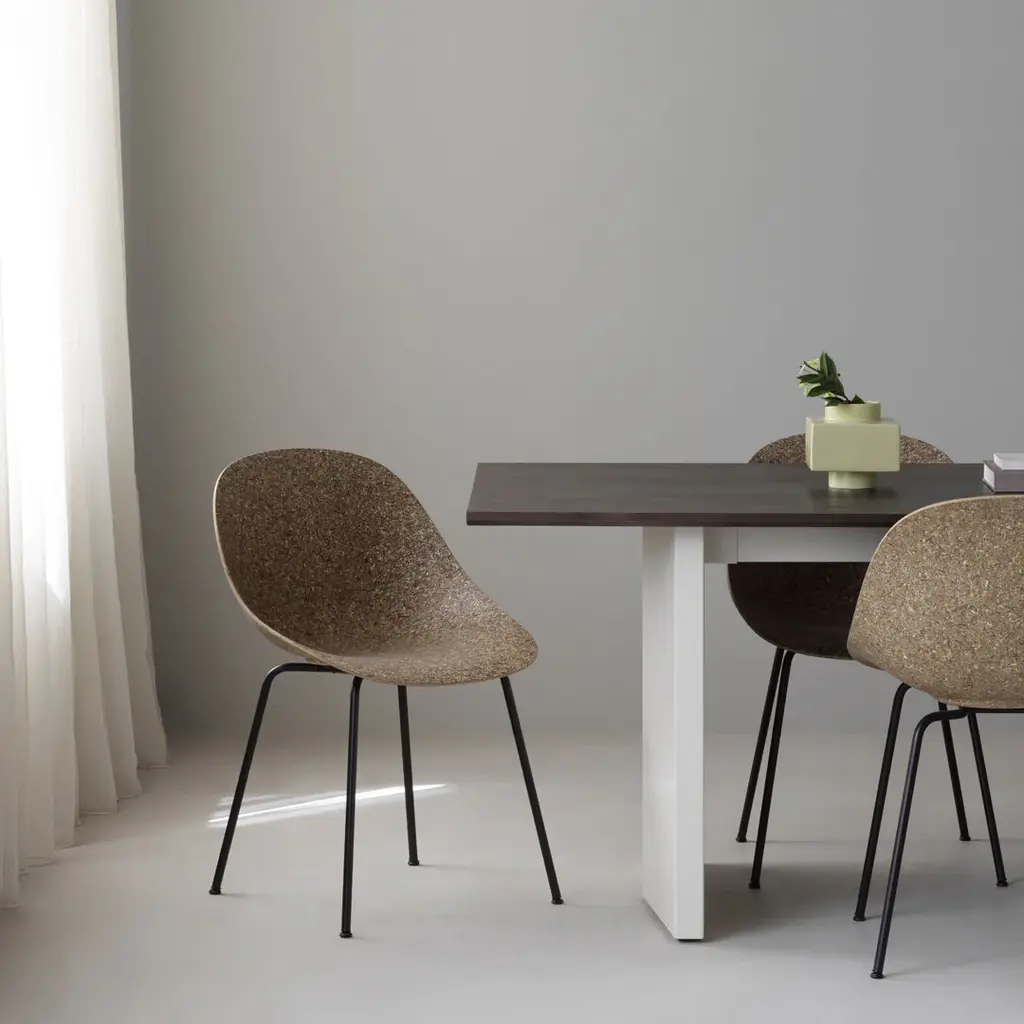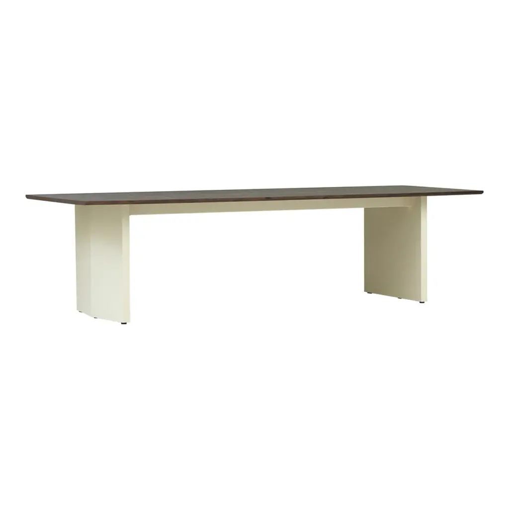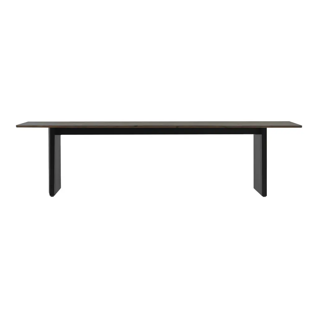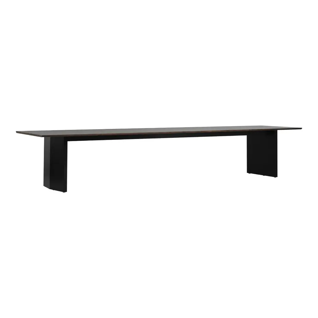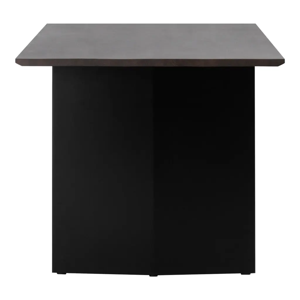 Using three visual elements reminiscent of three separate panels, Panel Table discards the archetypical notion of a dining table with four legs, once in each corner. Instead, the flat-packed design features a well-balanced, robust construction crafted using materials that offer a beautiful interplay and timeless relevance. The tabletop for Panel Table is crafted from FSC️ certified pine (FSC-C163461) and pine from other controlled sources, finished with a Dark Brown stain and protective, matt lacquer. The tabletop rests atop two powder coated steel bases connected with a steel beam. The wooden tabletop as well as the two metal legs are cut in a slight angle, an elegant detail that infuses the design with an airy, sophisticated expression despite its innate robustness.