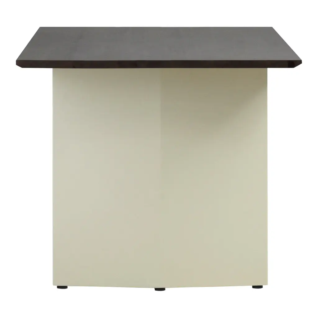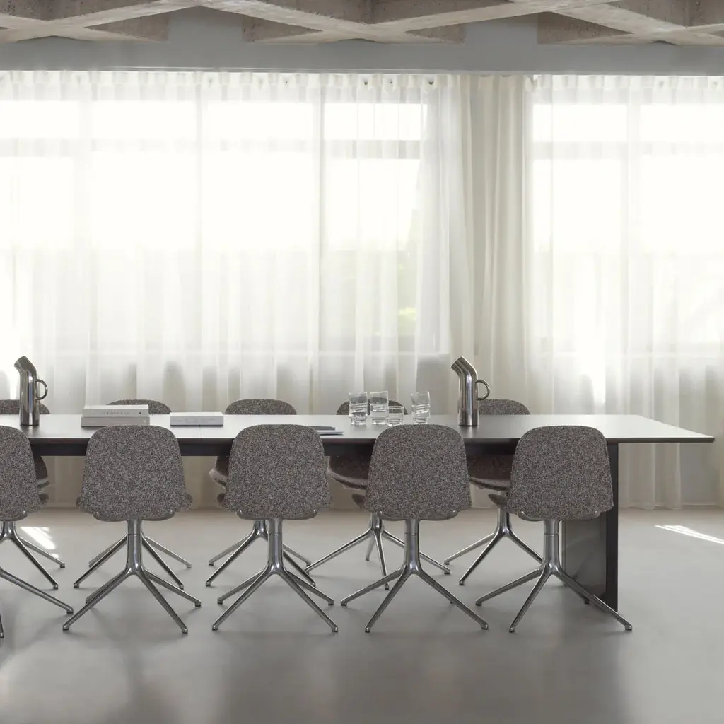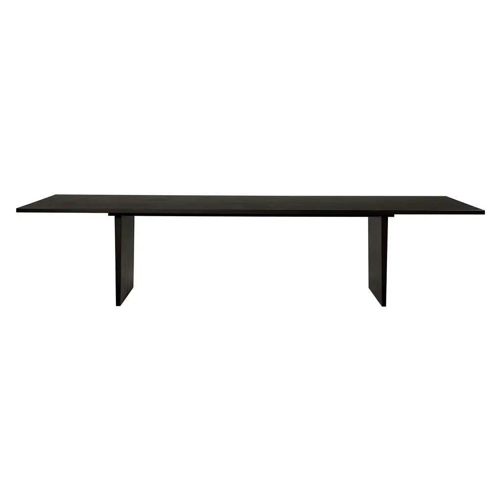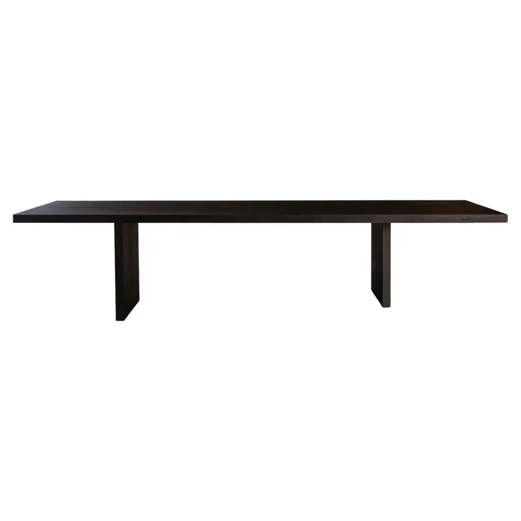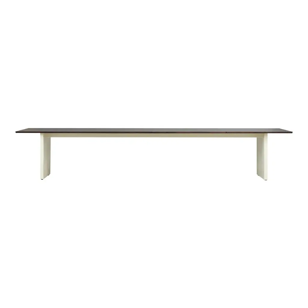 Using three visual elements reminiscent of three separate panels, Panel Table discards the archetypical notion of a dining table with four legs, once in each corner. Instead, the flat-packed design features a well-balanced, robust construction crafted using materials that offer a beautiful interplay and timeless relevance. The tabletop for Panel Table is crafted from FSC️ certified pine (FSC-C163461) and pine from other controlled sources, finished with a Dark Brown stain and protective, matt lacquer. The tabletop rests atop two powder coated steel bases connected with a steel beam. The wooden tabletop as well as the two metal legs are cut in a slight angle, an elegant detail that infuses the design with an airy, sophisticated expression despite its innate robustness.
