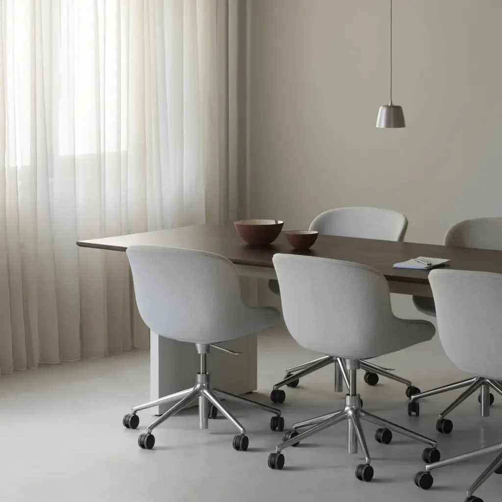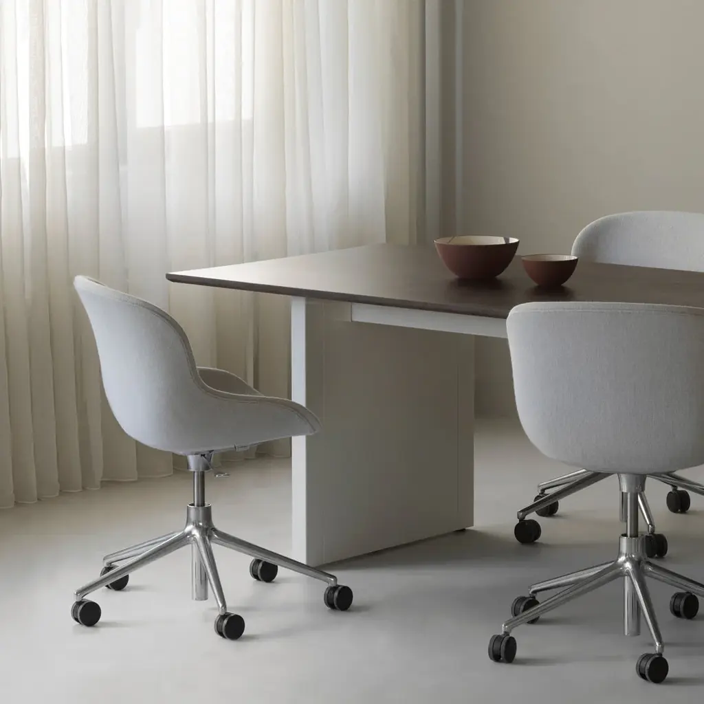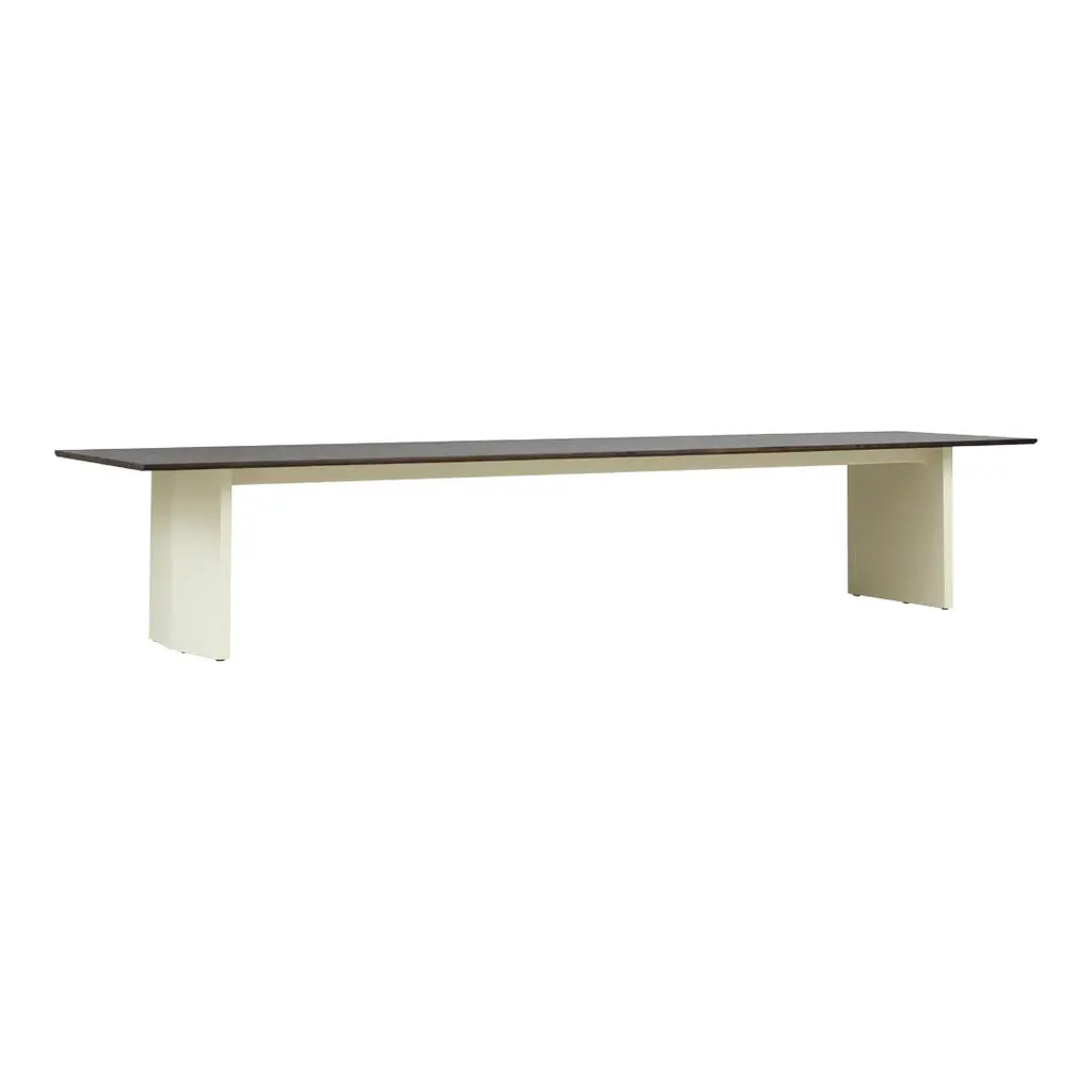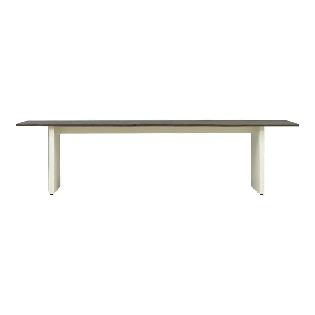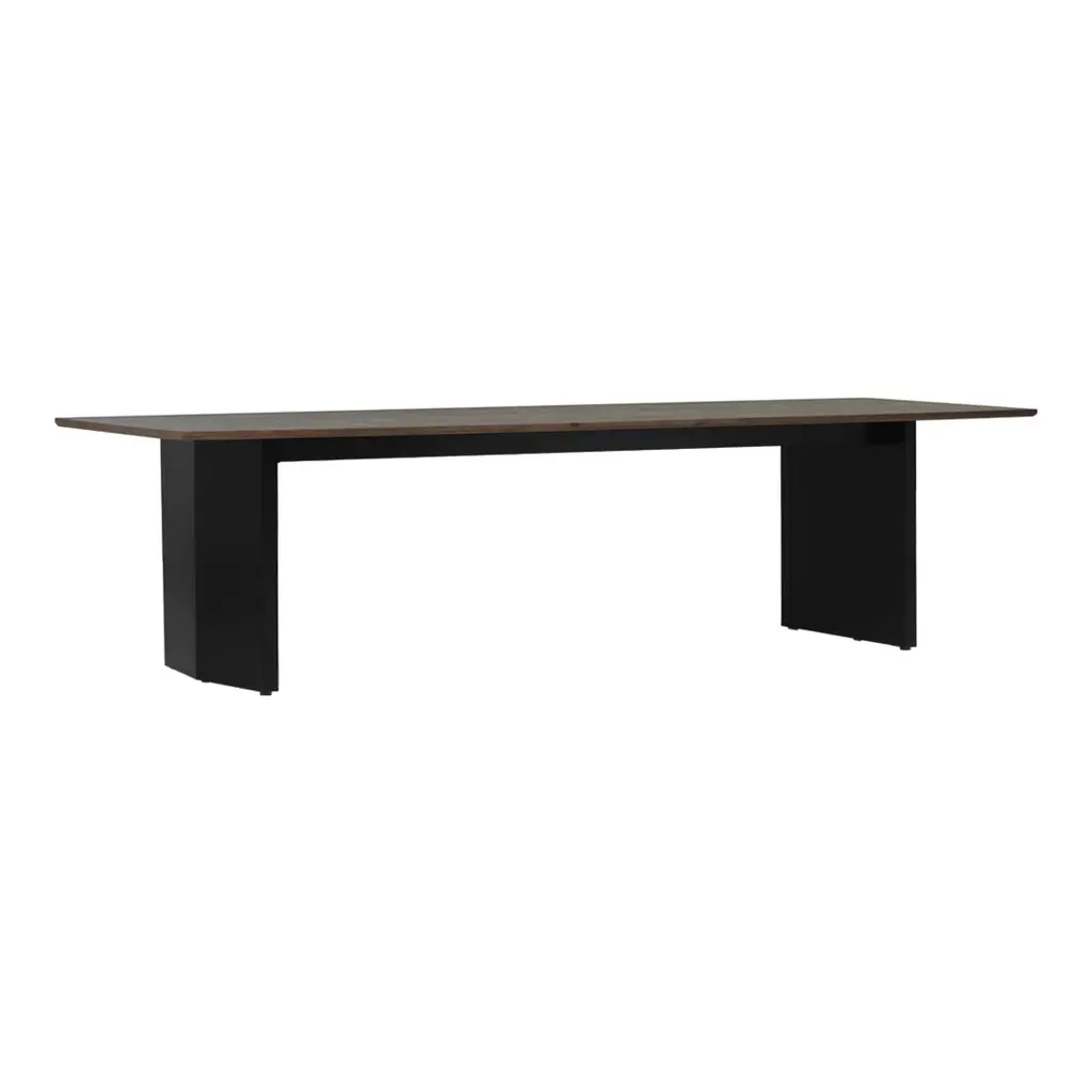 Using three visual elements reminiscent of three separate panels, Panel Table discards the archetypical notion of a dining table with four legs, once in each corner. Instead, the flat-packed design features a well-balanced, robust construction crafted using materials that offer a beautiful interplay and timeless relevance. The tabletop for Panel Table is crafted from FSC️ certified pine (FSC-C163461) and pine from other controlled sources, finished with a Dark Brown stain and protective, matt lacquer. The tabletop rests atop two powder coated steel bases connected with a steel beam. The wooden tabletop as well as the two metal legs are cut in a slight angle, an elegant detail that infuses the design with an airy, sophisticated expression despite its innate robustness.