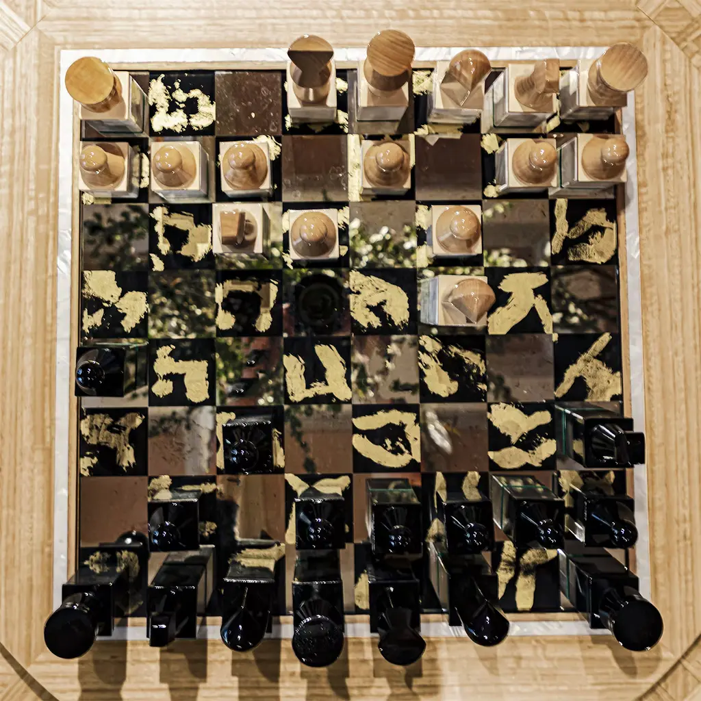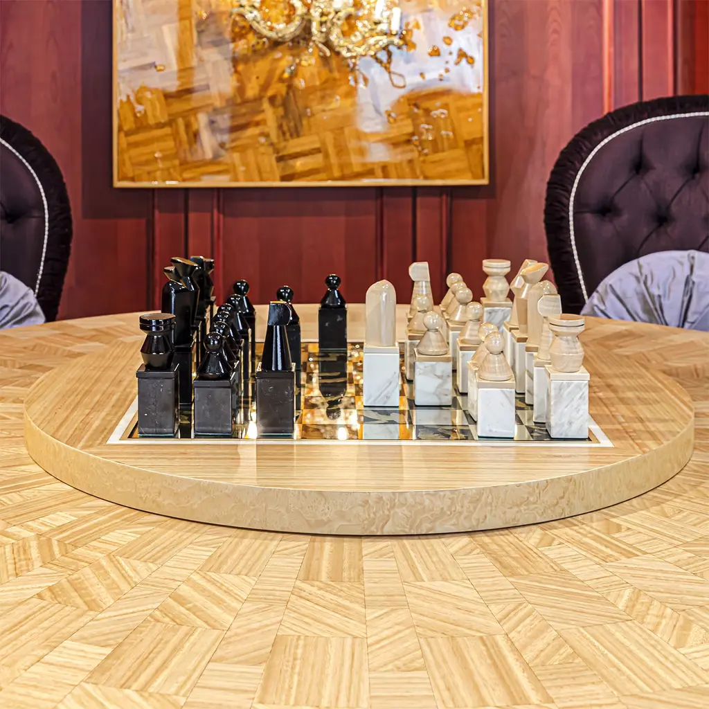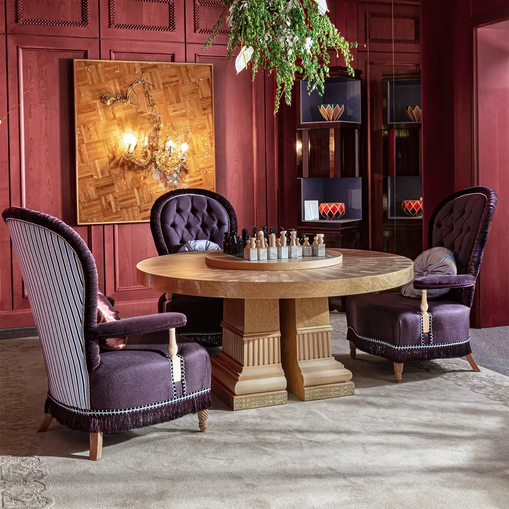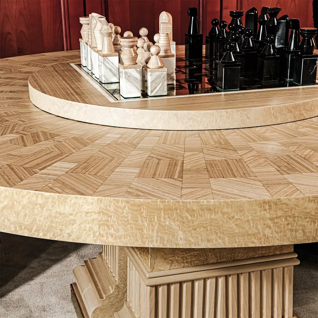 Versatile and elegant, this round table features an inlaid eucalyptus top and pedestals crafted from Madrona burl. It is also available without Lazy Susan rotating tray, making it a stylish and functional addition to any dining area. Please contact the concierge for more information. The price refers to the product complete with Lazy Susan rotating tray and chess pawns. Upon request, it can also be purchased without them.