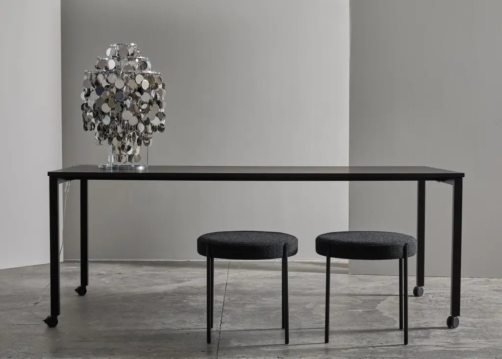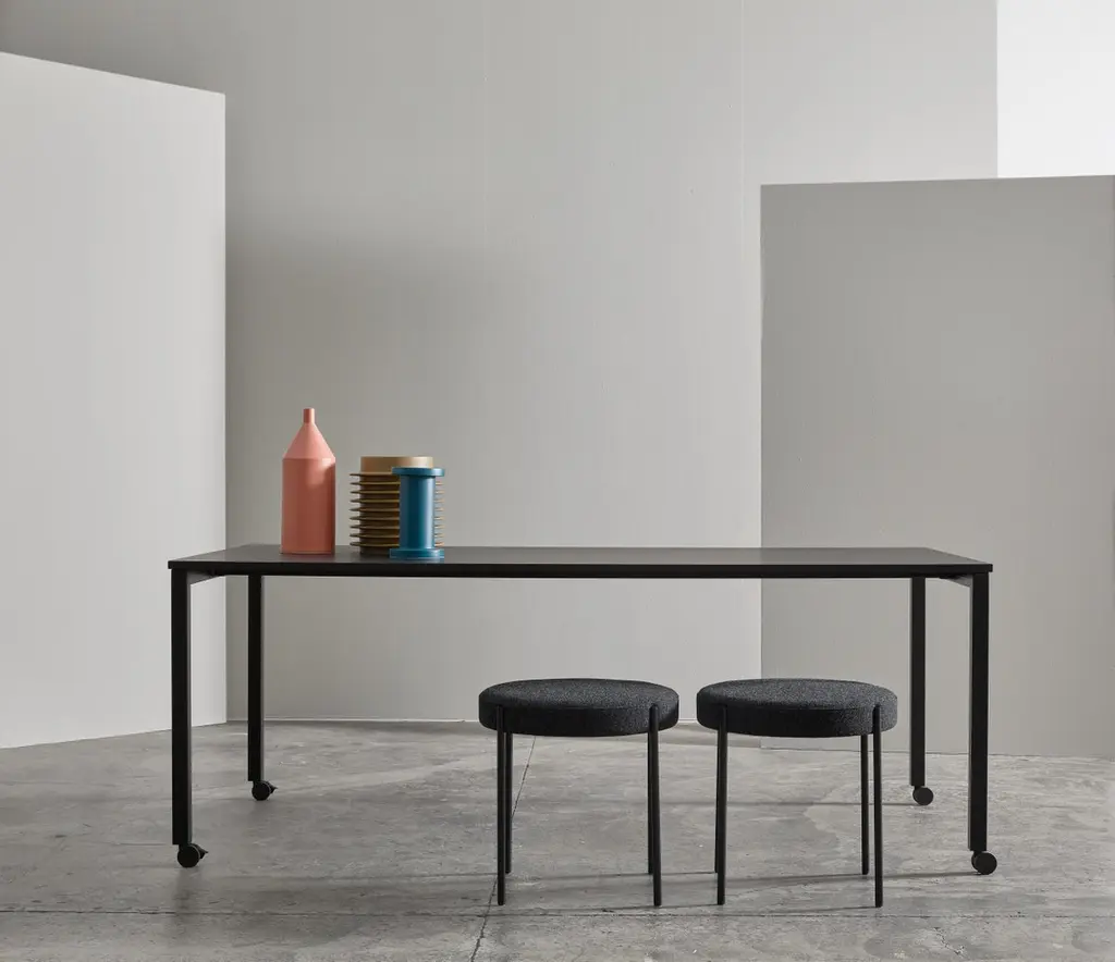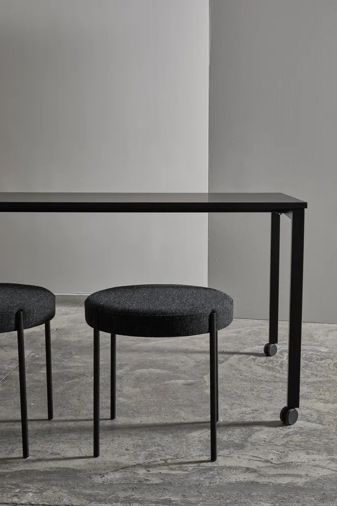 Rectangular dining table with lockable castors. The table was Verner Panton’s working table.Material:Tabletop is made of MDF with Fenix nanotech material on top and lacquered edgeFrame made of powder coated square steel tube.Mounted with lockable TENTE wheelsColor and fabric:Black Frame RAL 9005tabletop Fenix 0720Black wheels.