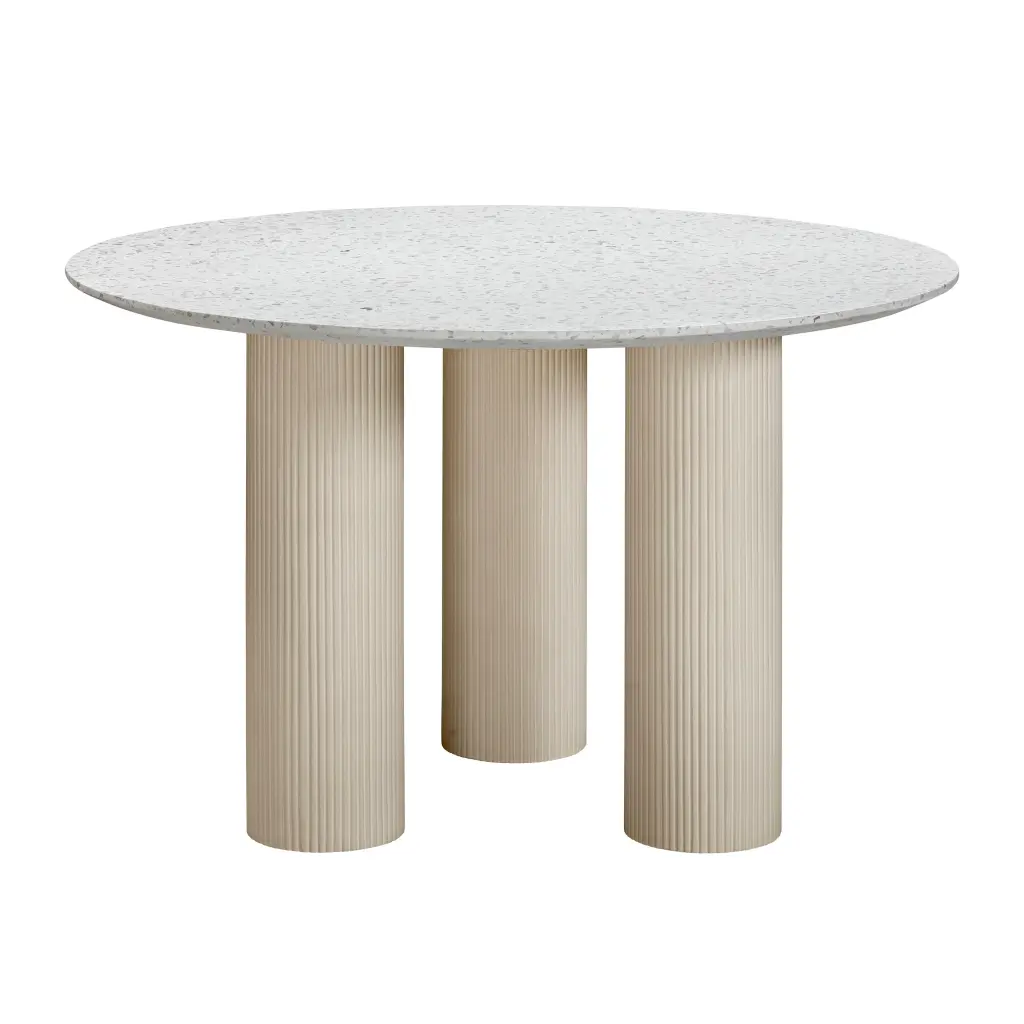 Transform your dining space with the Parcino Terrazzo Concrete Indoor/Outdoor Dining Table, an absolute showstopper that refuses to blend in. Its expansive pebble-polished terrazzo top of muted-colored stones is a bold statement of personality and style. Supported by fluted and channeled legs in an elevated faded taupe, this table effortlessly blurs the lines between indoor and outdoor living, making it the ultimate host for intimate gatherings.