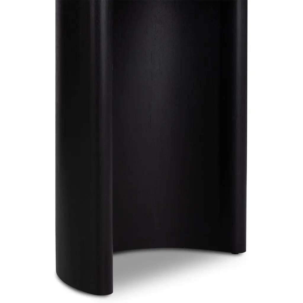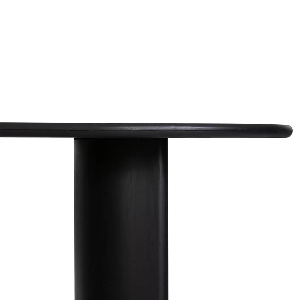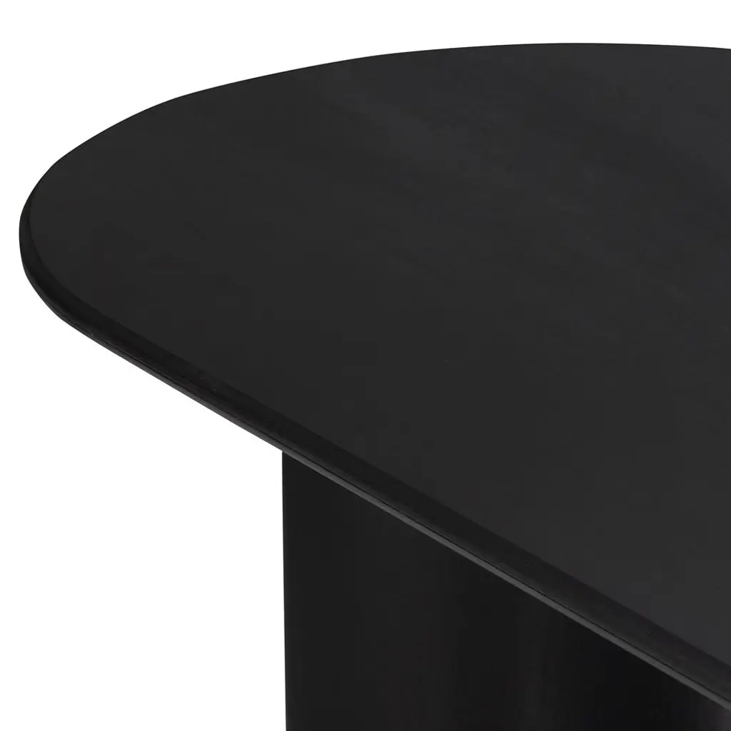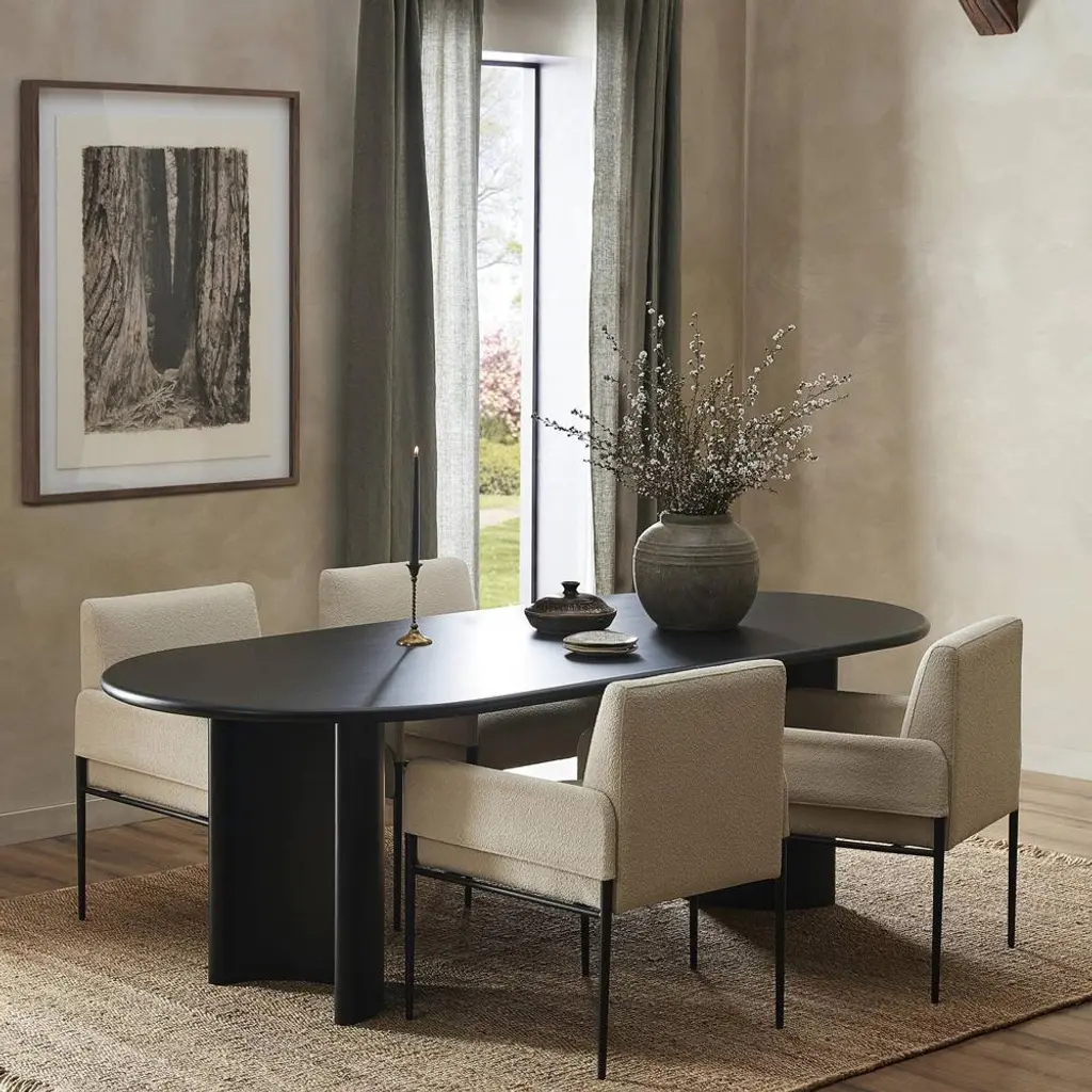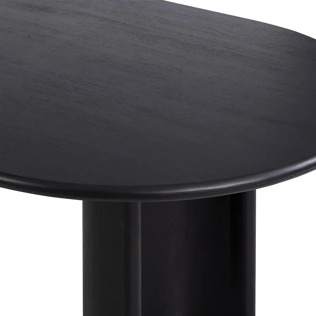 Curved lines and natural materials create an elegant silhouette on the Paris dining table. Acacia wood is finished in an aged black hue, forming an elegant oval tabletop and two crescent-shaped legs. This roomy table seats up to ten people, making it the perfect place to gather for many a dinner party to come.