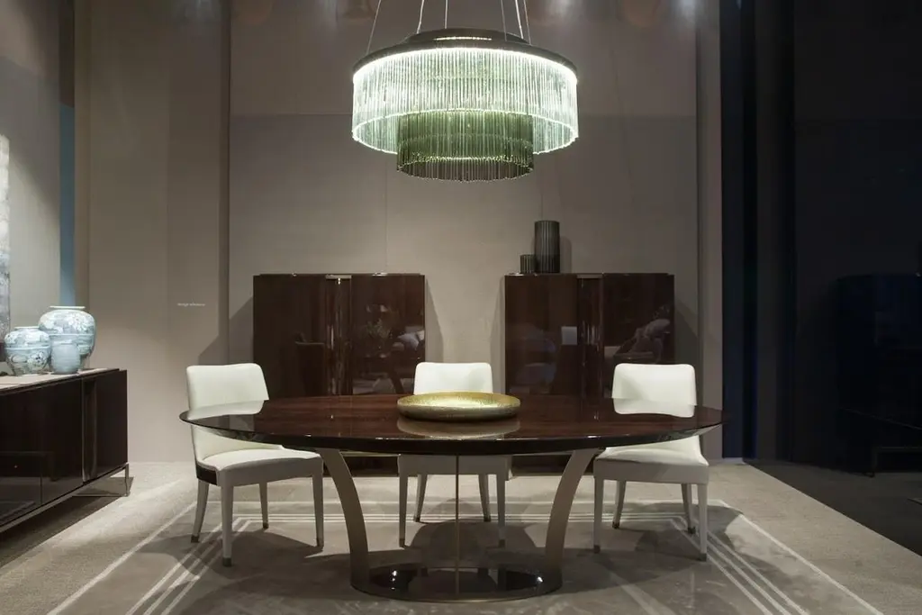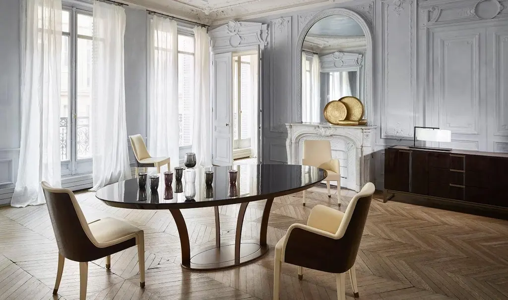 The Paris Dining Table is a masterpiece of elegance and versatility, available in round, oval, or rectangular shapes, with an option for integrated extension leaves. Designed to suit a variety of interiors, the table features a refined wooden top, offered in high-gloss, matte, or semi-gloss oak finishes.Its sturdy metal base, available in luxurious bronze or sleek chrome, adds a touch of sophistication while ensuring stability. The Paris Dining Table effortlessly combines timeless style with modern craftsmanship, making it a perfect centerpiece for any dining space.Whether hosting an intimate dinner or a grand gathering, this table adapts to your needs, offering both aesthetic appeal and practical functionality. Elevate your dining experience with the Paris Table—where design meets excellence in every det...