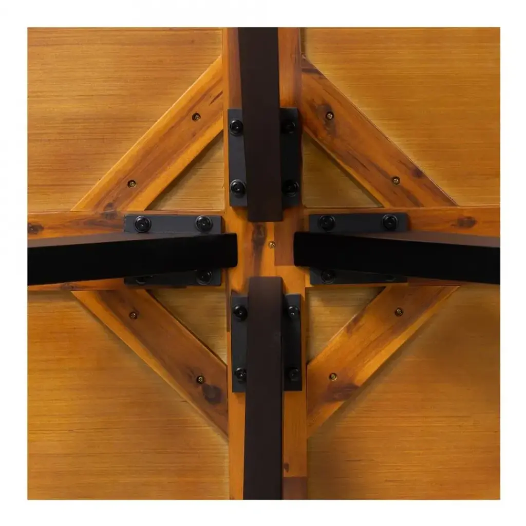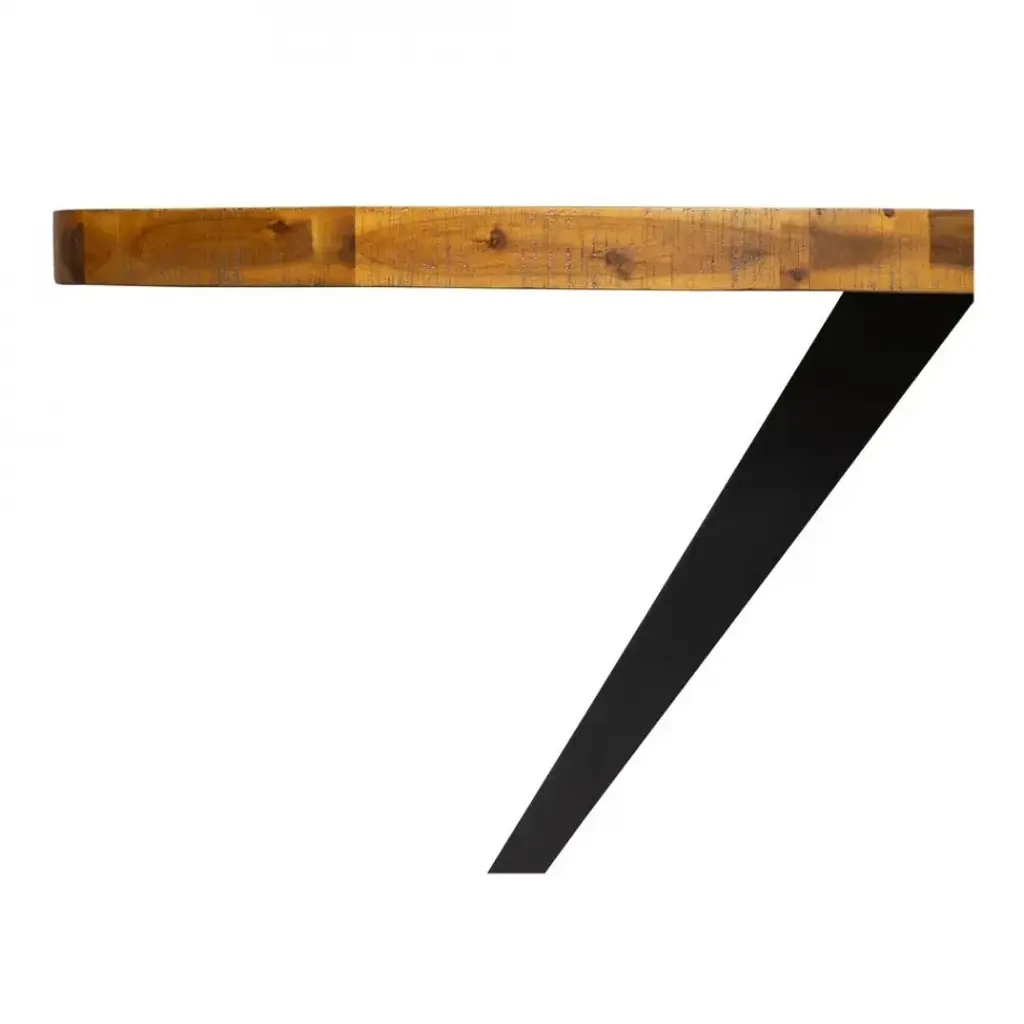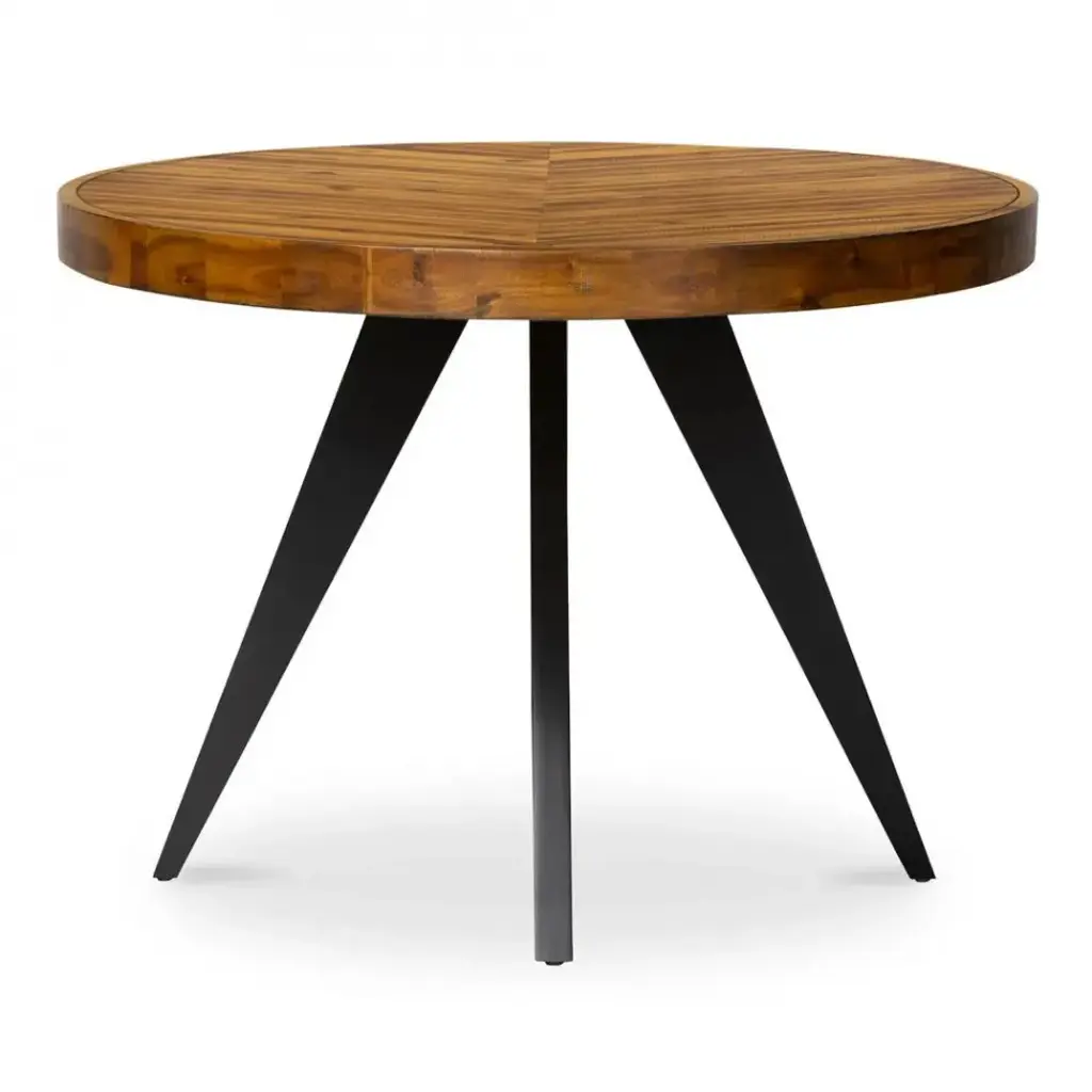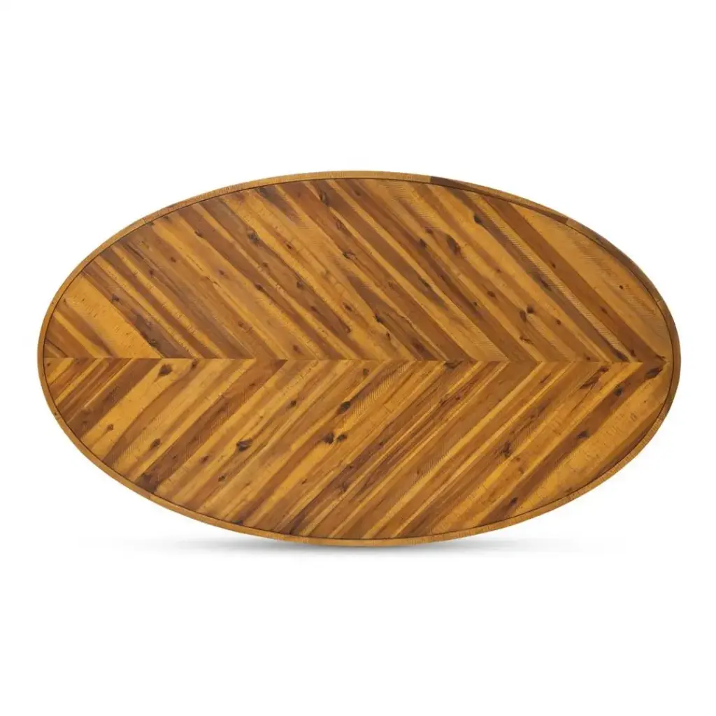 The Parq Oval dining table is a sophisticated fusion of modern design and rustic charm. Each piece of solid Acacia is meticulously hand-selected to create a visually interesting tabletop, with careful consideration given to the natural variations and final appearance of each individual piece. The table's parquet-patterned top is complemented by elegant, black-painted legs, the robust industrial metal base providing a striking contrast.