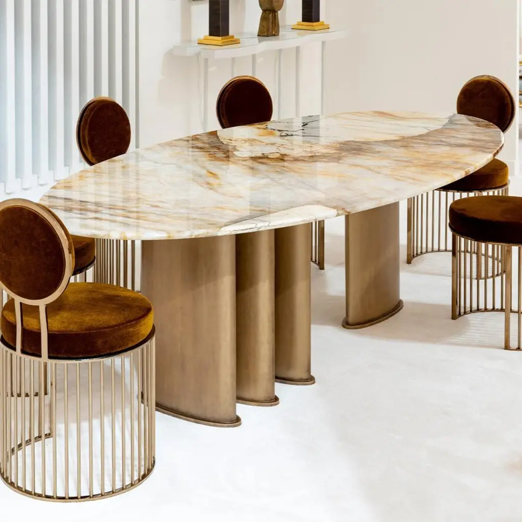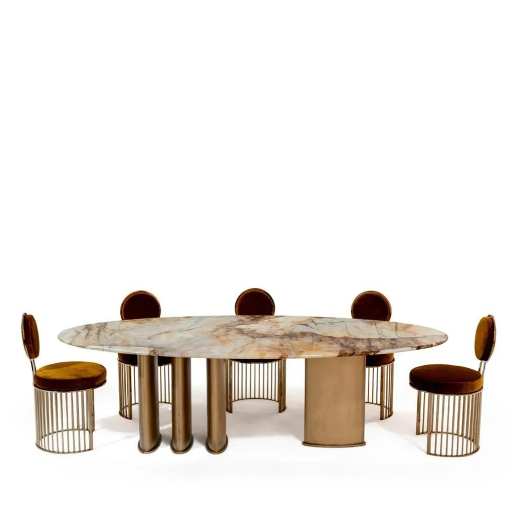 A sublime and majestic design of timeless sophistication, this oval dining table will imbue a refined interior setting with unparalleled charm. It boasts a Patagonia marble top displaying warm, earth-toned traceries contrasted by the four aluminum cylindrical legs finished in a satin bronze hue. Please inquire with the Concierge for further details.
