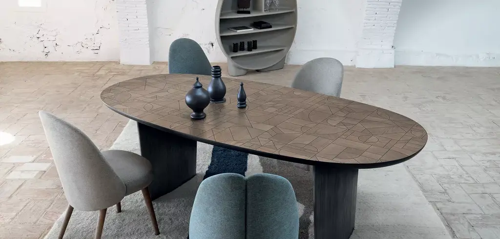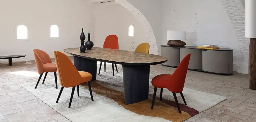 With NATIV, Raphael Navot has created for Roche Bobois a collection with natural and organic lines: a dialogue between nature and culture, marked by geometric mastery and spontaneous forms, using noble materials and crafted in an artisanal manner. The Patchwork tables are a stunning example of contemporary woodworking: set within an oval, the assembly features an extremely complex arrangement of numerous wood pieces, each with a unique grain pattern, and the design never repeats. The joint that highlights the pattern can be filled in for dining tables or left open for cocktail tables and consoles. Behind these creations, one senses the skill of the artisan…