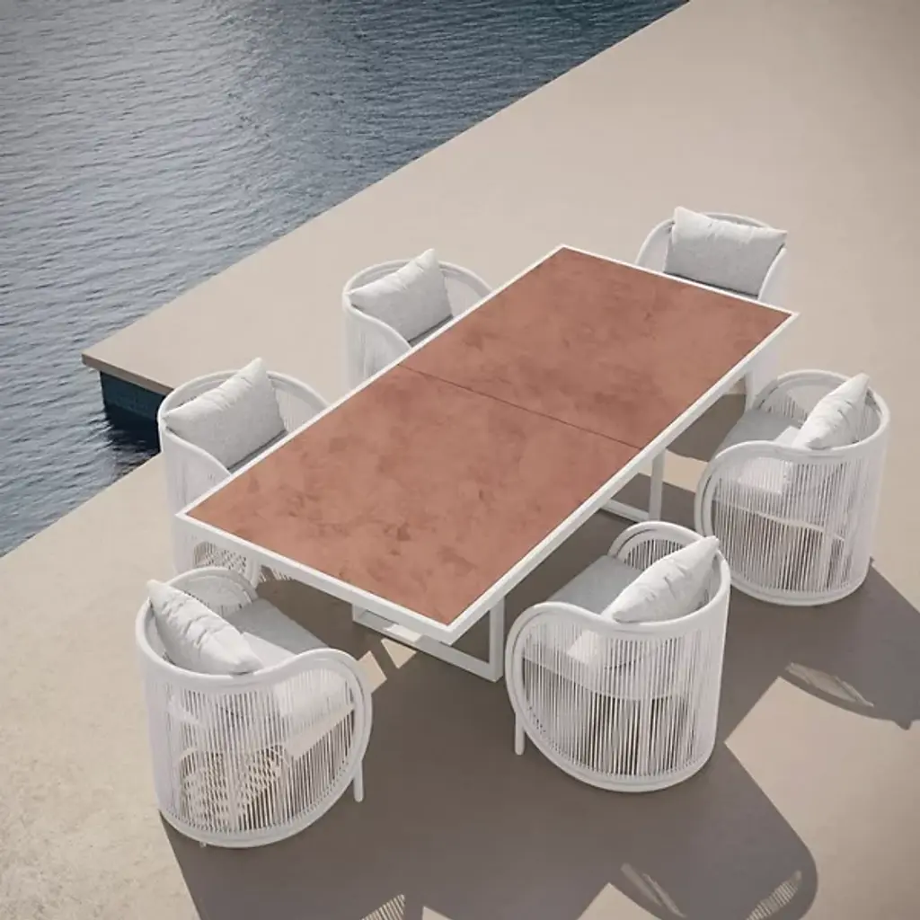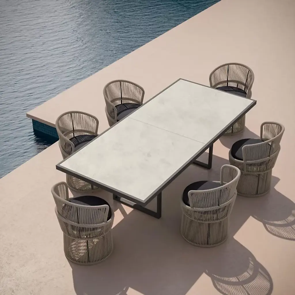 The Pavia Dekton Rectangular Outdoor Dining Table from Azzurro Living emphasizes expansive family gatherings with its generous rectangular surface and understated frame design, which maximizes seating capacity. A fully welded powder-coated aluminum construction creates the structural framework while Dekton tabletops provide exceptional durability and easy maintenance for extended outdoor use. Individual artisan craftsmanship ensures that each table receives careful attention through hand-welding, bending, and finishing processes that utilize advanced techniques. The ultra-compact stone solution offers comprehensive weather resistance for various outdoor dining applications.