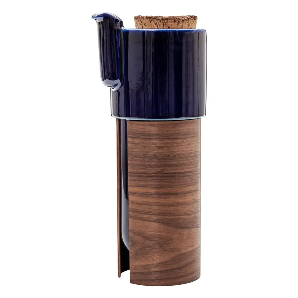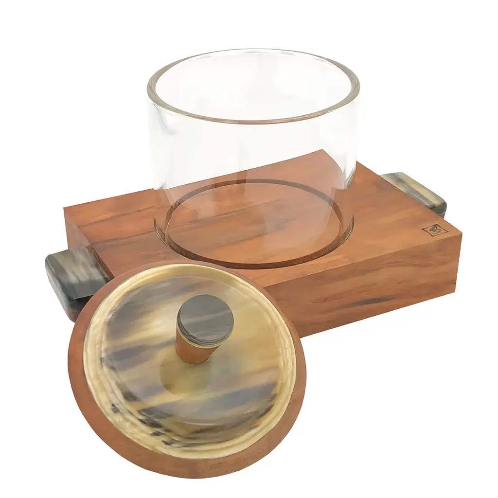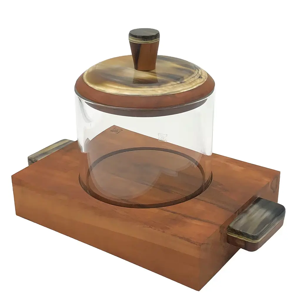 Quality, fine detailing, and passion are the characteristics that distinguish Stefano Raffa's handmade creations. This truffle holder is a simple yet entirely glamorous object of functional decor that will add a modern elegance to any dining table. Supported by a rectangular base of pear wood with cow horn handles, the borosilicate container features a round lid with a conical finial with horn details.