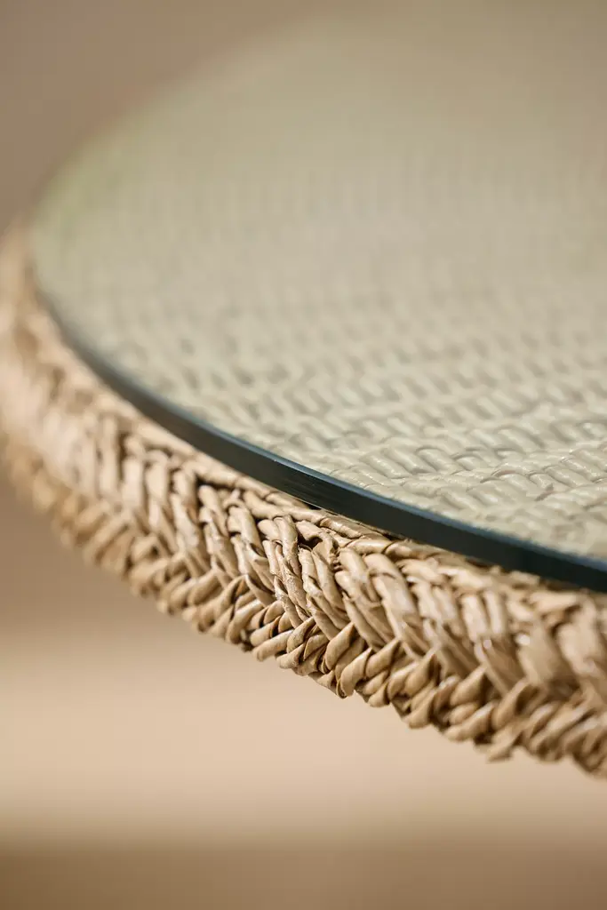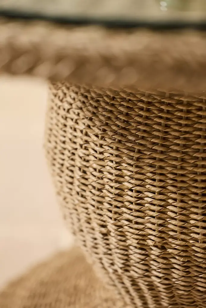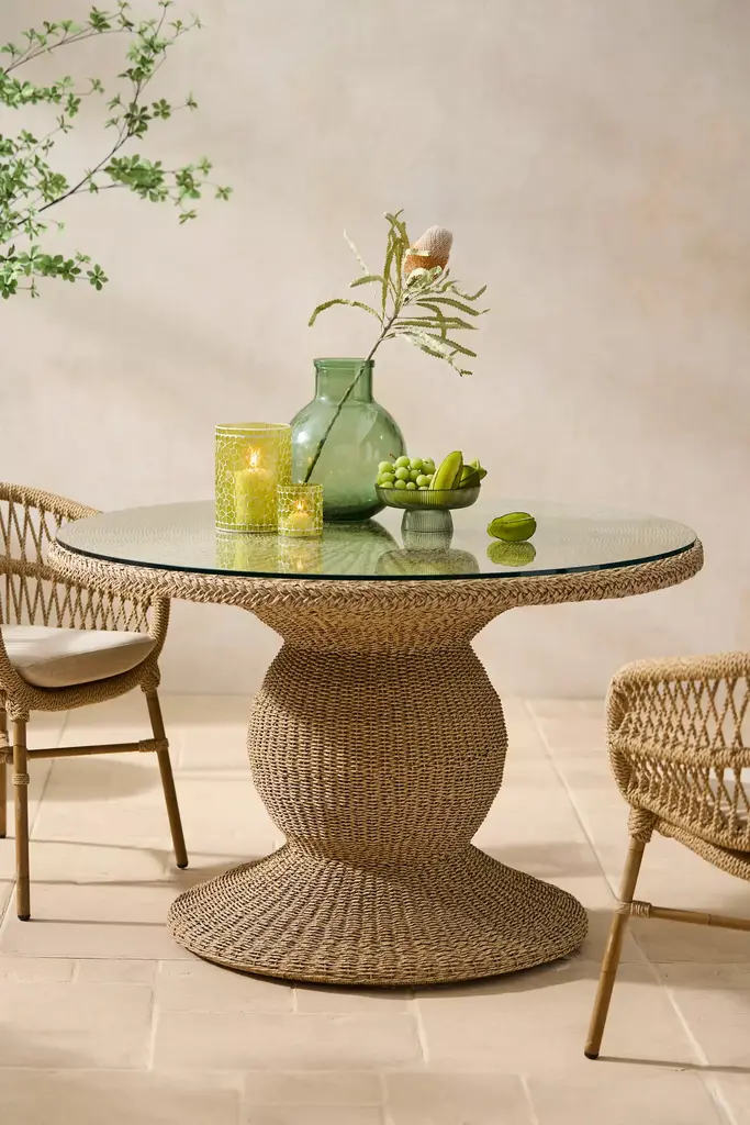 Designed and hand-crafted especially for terrain, this round dining table is made from durable and low-maintenance synthetic wicker thats perfect for use on the patio or in the garden. Each table includes a matching glass top.