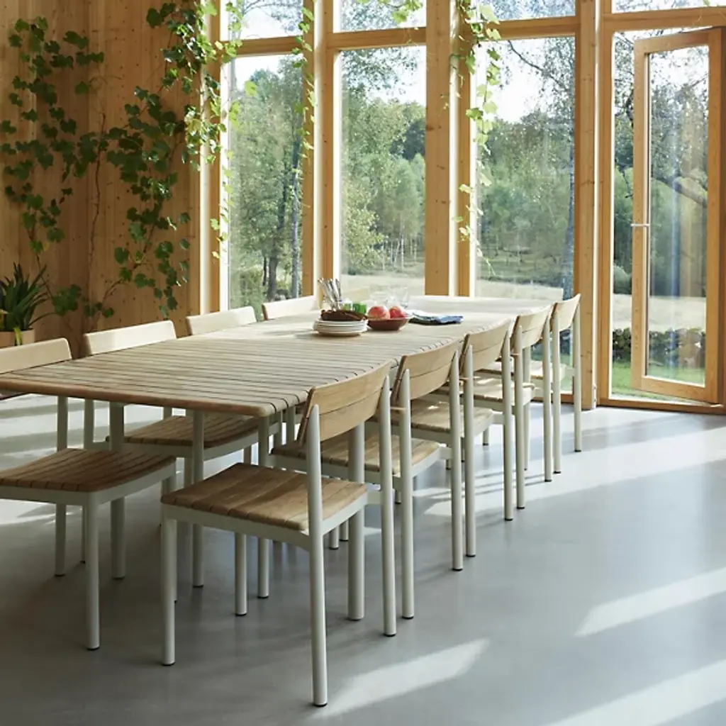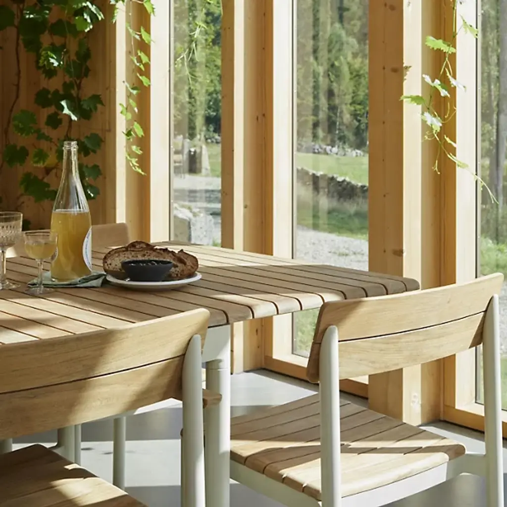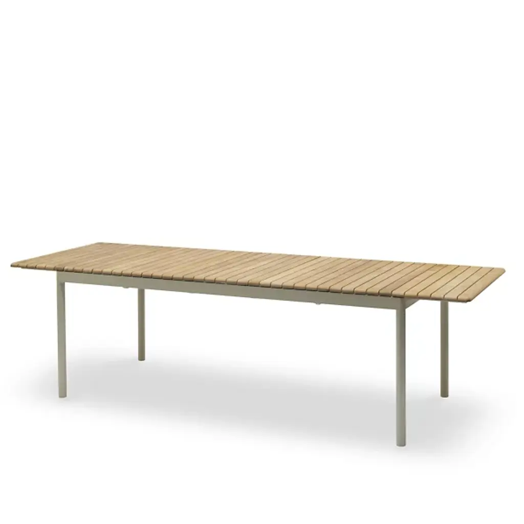 Add a welcome element of style and functionality to outdoor gathering spaces with the Pelagus Outdoor Dining Table from Fritz Hansen. Resting atop an airy, four-legged frame of durable aluminum, it can comfortably accommodate 6 to 8 people, while the teak wood is durable enough to sustain inclement weather conditions, acquiring a silver patina over time. Its capacity can be improved with one or two separately sold extension leaves that match the profile of the teak slats, able to expand and contrast at need.