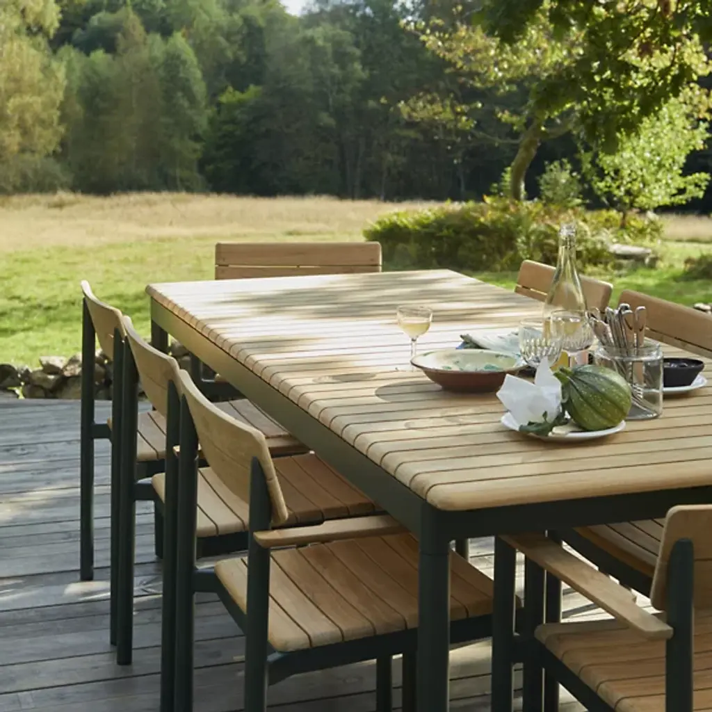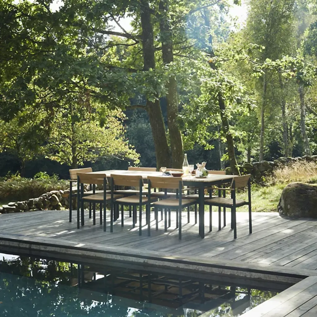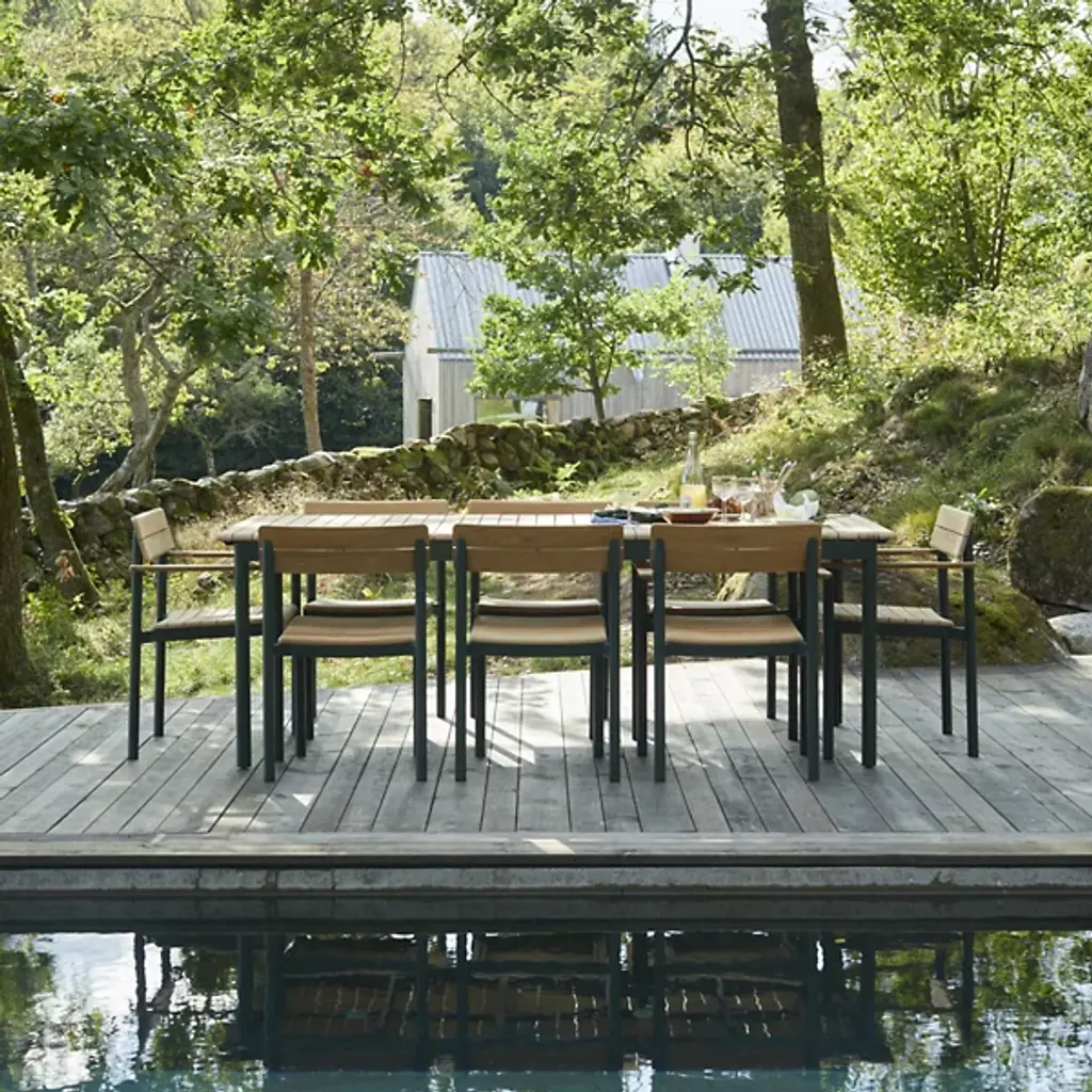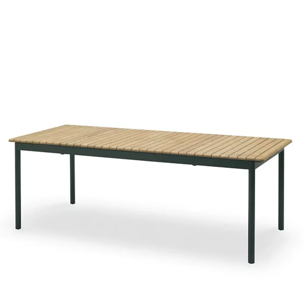 Add a welcome element of style and functionality to outdoor gathering spaces with the Pelagus Outdoor Dining Table from Fritz Hansen. Resting atop an airy, four-legged frame of durable aluminum, it can comfortably accommodate 6 to 8 people, while the teak wood is durable enough to sustain inclement weather conditions, acquiring a silver patina over time. Its capacity can be improved with one or two separately sold extension leaves that match the profile of the teak slats, able to expand and contrast at need.