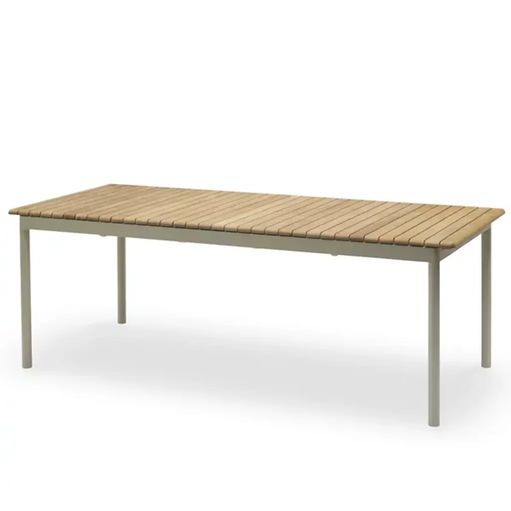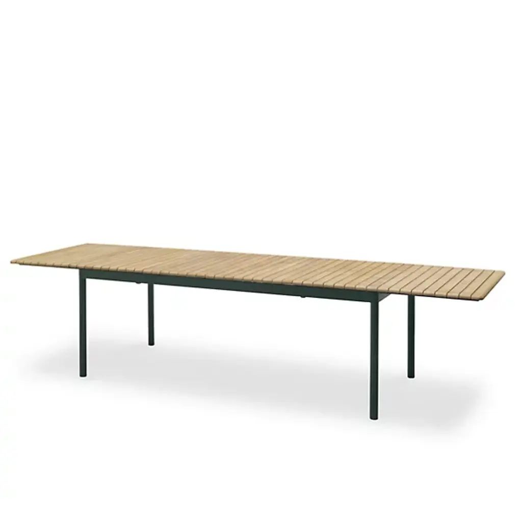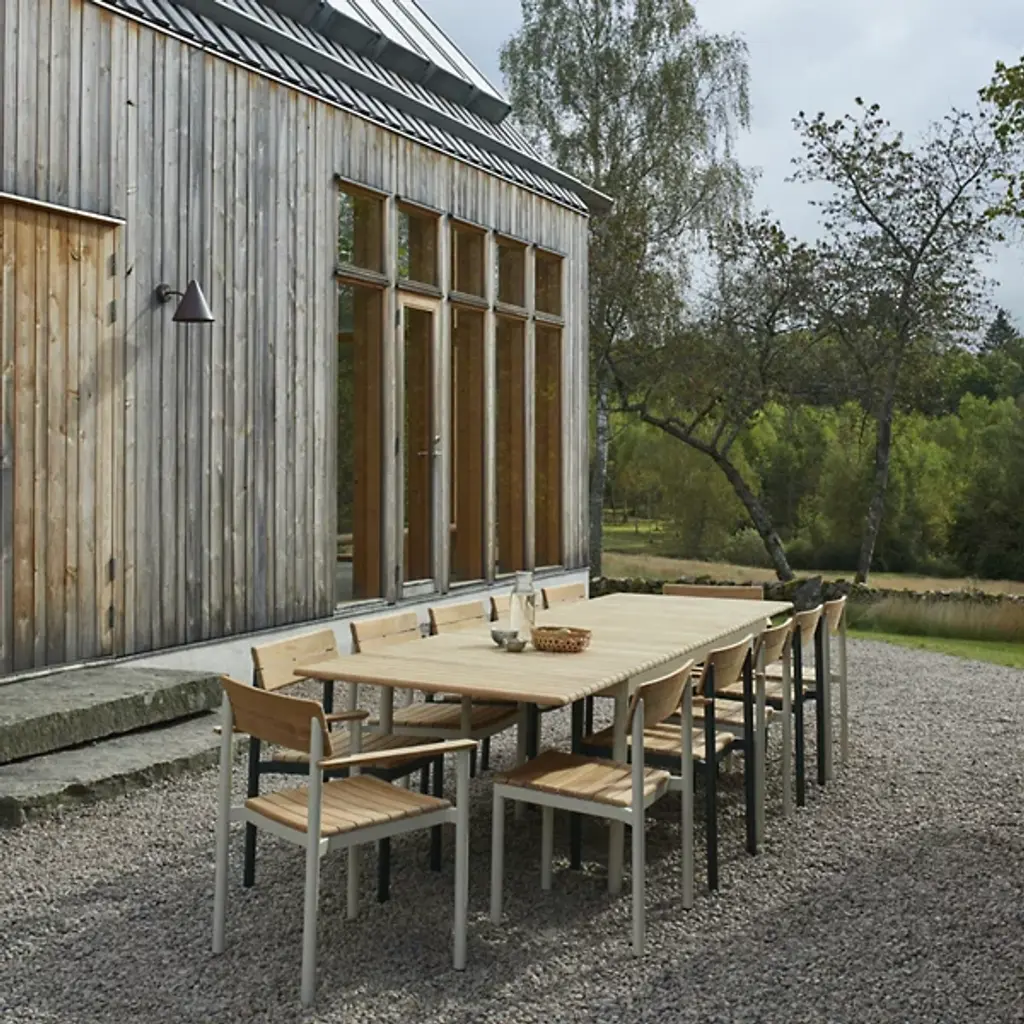Add a welcome element of style and functionality to outdoor gathering spaces with the Pelagus Outdoor Dining Table from Fritz Hansen. Resting atop an airy, four-legged frame of durable aluminum, it can comfortably accommodate 6 to 8 people, while the teak wood is durable enough to sustain inclement weather conditions, acquiring a silver patina over time. Its capacity can be improved with one or two separately sold extension leaves that match the profile of the teak slats, able to expand and contrast at need.