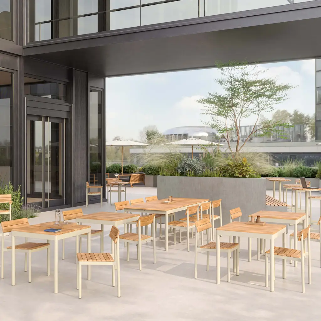 For a compact roof deck or expansive restaurant patio, elevate your outdoor dining experience with the Pelagus Square Table from Fritz Hansen. This versatile line is crafted with solid teak, powder coated aluminum, and stainless steel for exceptional durability, while its slender and contemporary design offers a traditional-meets-modern feel perfect for a range of outdoor spaces. Highlights