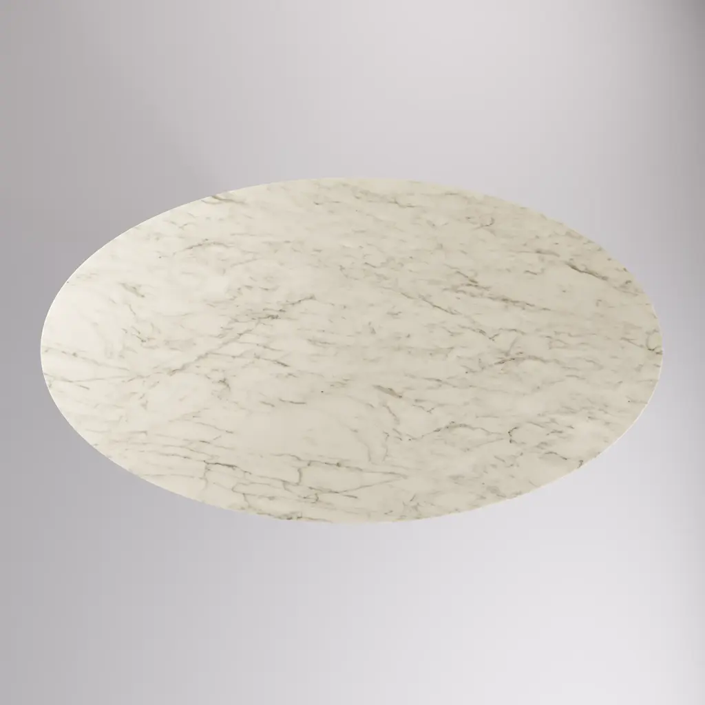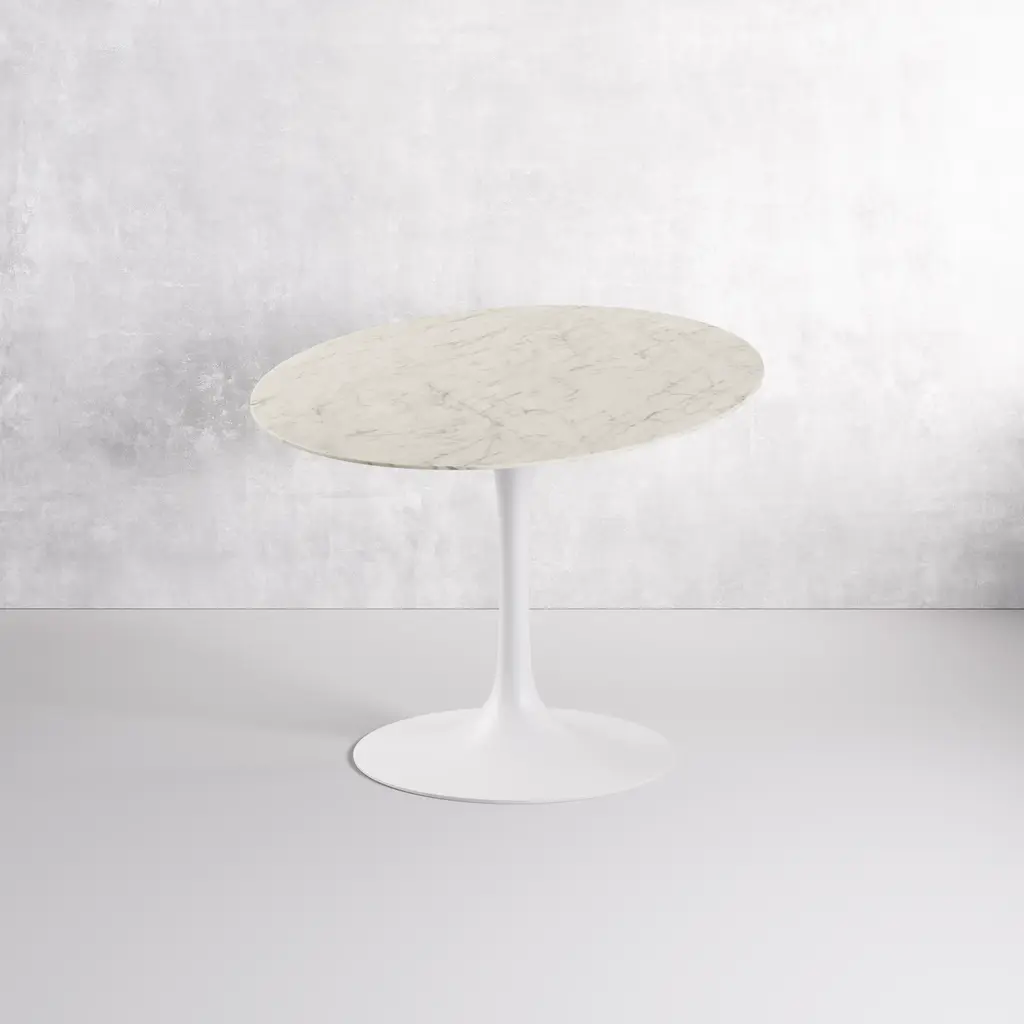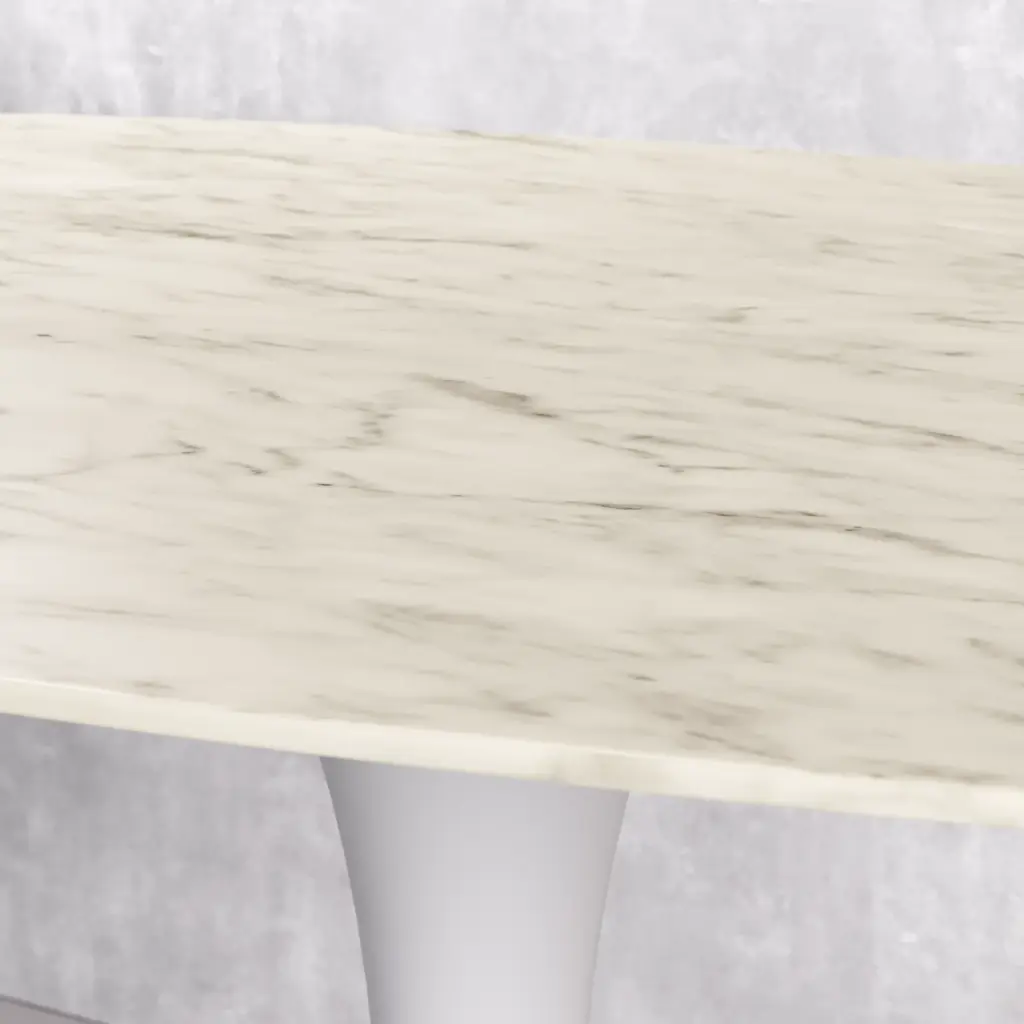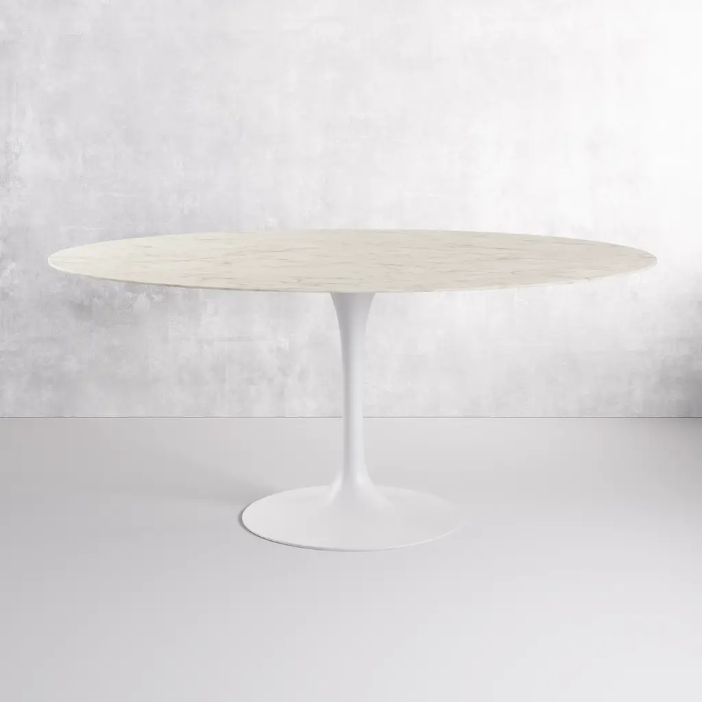 Our mod Pescara dining table has a luxurious marble top. This tulip table-style piece is a contemporary take on a retro classic. The stone-inspired surface puts a modern twist on this iconic oval table. Suitable for your formal or casual dining space, our Pescara dining table excels in versatility. Dimensions: 72.0''W x 39.0''D x 30.0''H Tear Sheet