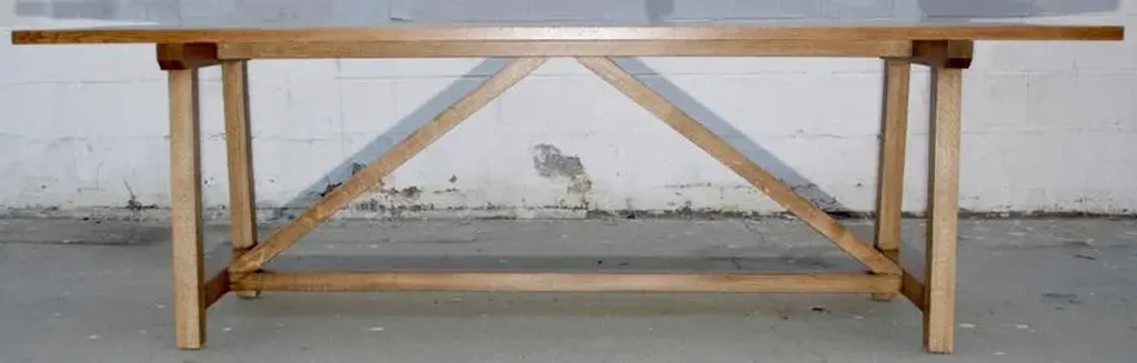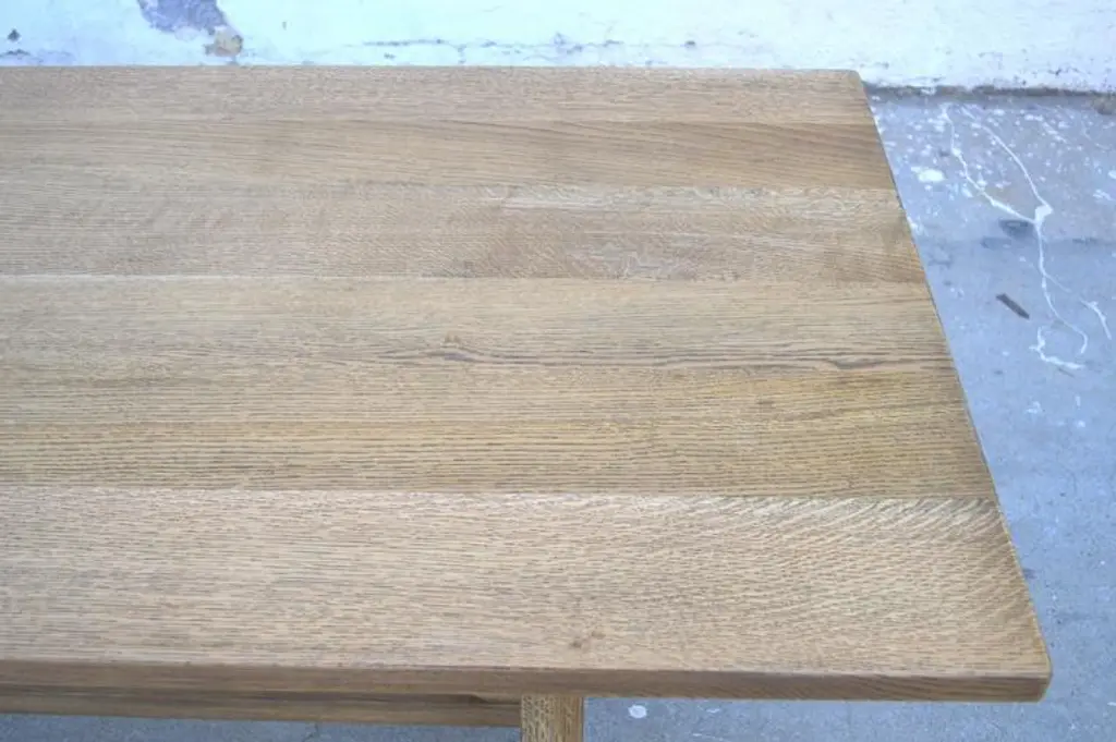 Dining table in distressed, rift-sawn, white oak. Each table is bench-made in our own Los Angeles workshop. We use only traditional carpentry techniques, no nails or metal fasteners of any kind. Just mortise and tenon construction reinforced with hand-cut wooden dowels.