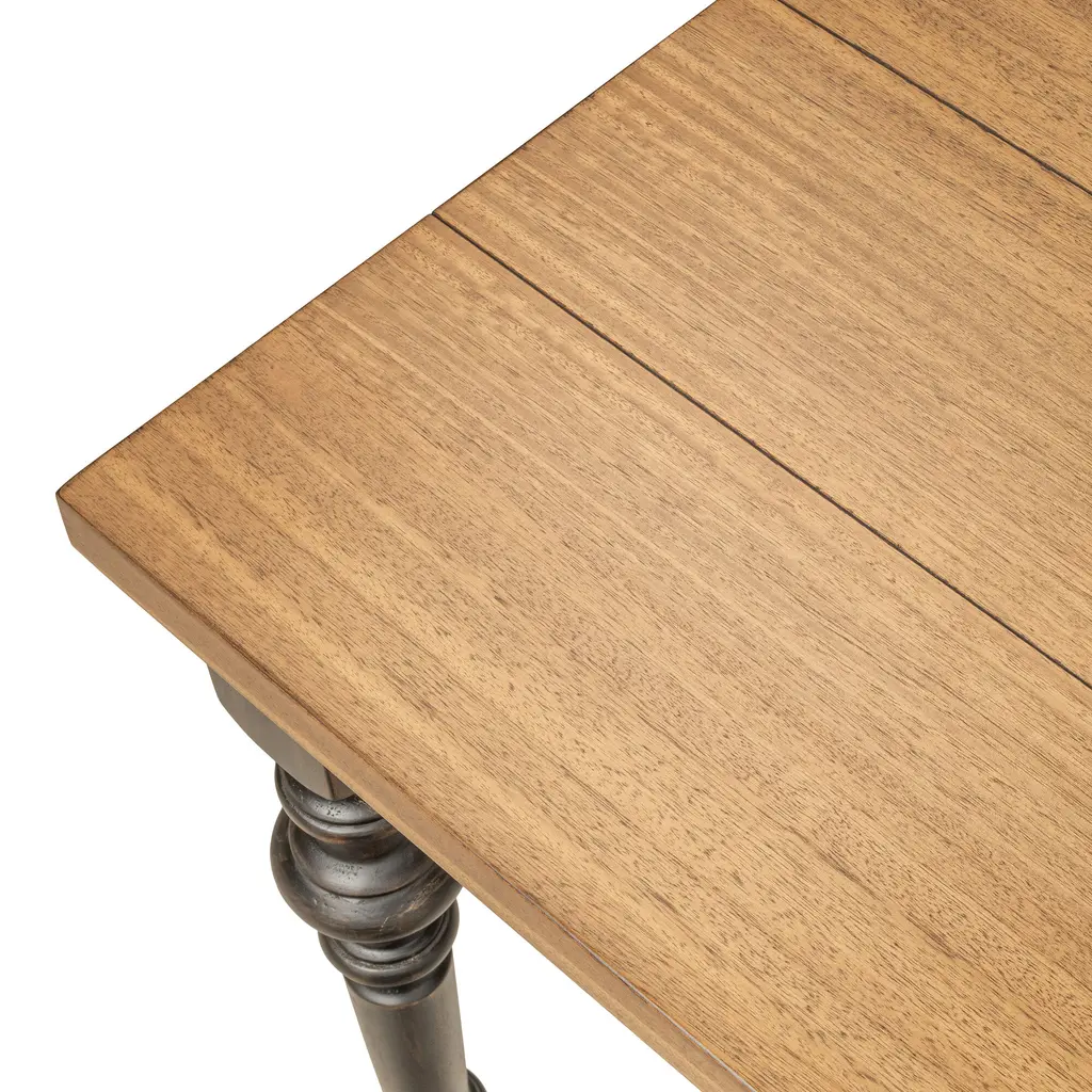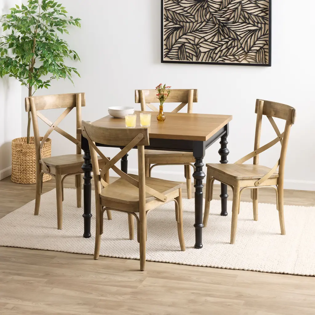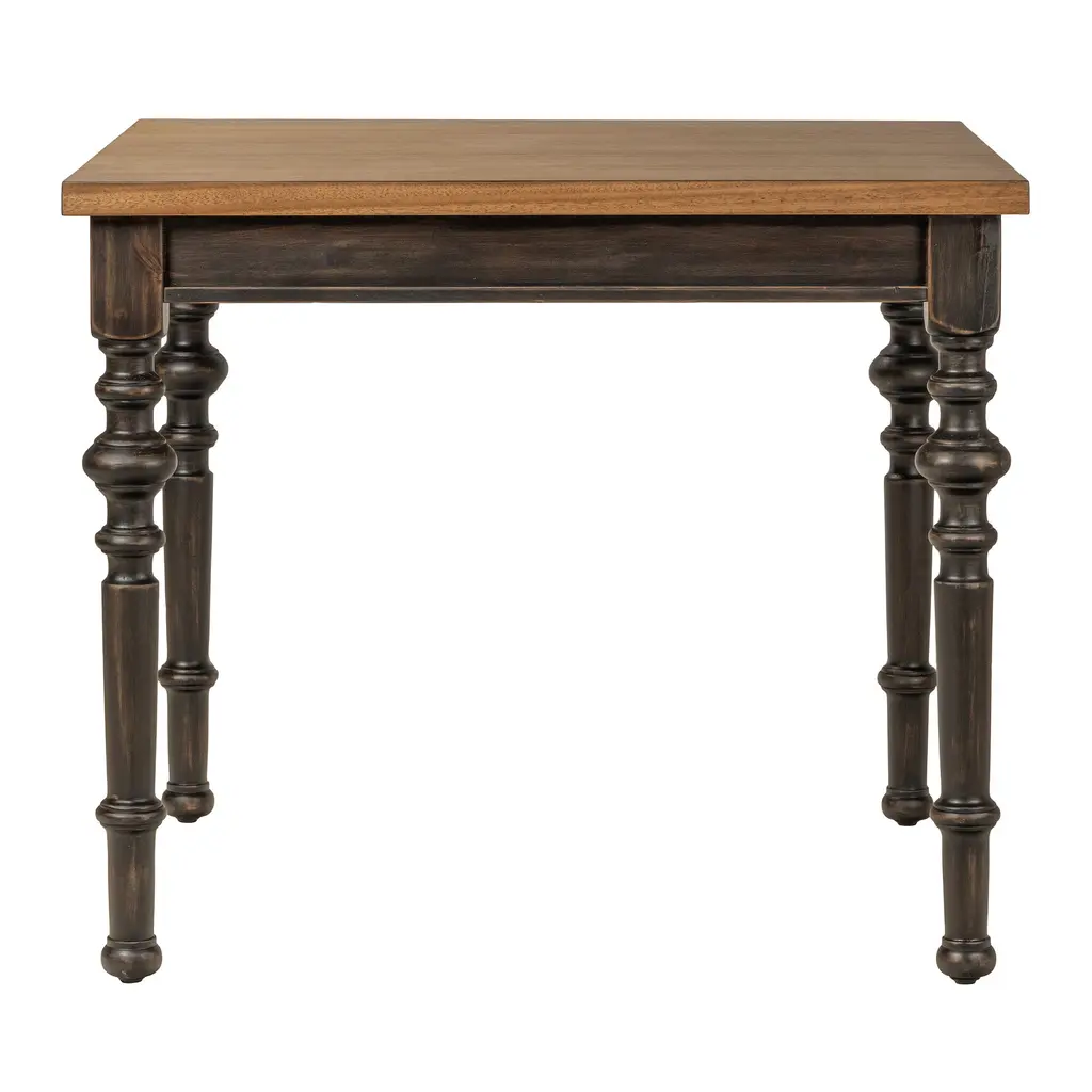 Our petite Phoebe farmhouse dining table unites a square, slat-grooved wood surface in a light-walnut glaze with a classic base of turned legs in a timeworn rubbed blackwash. An approachable take on antique dining furniture, its two-tone splendor elevates small dining rooms and kitchens at a truly fantastic value. Phoebe is equal complement to traditional bistro chairs and modern or contemporary side chairs.