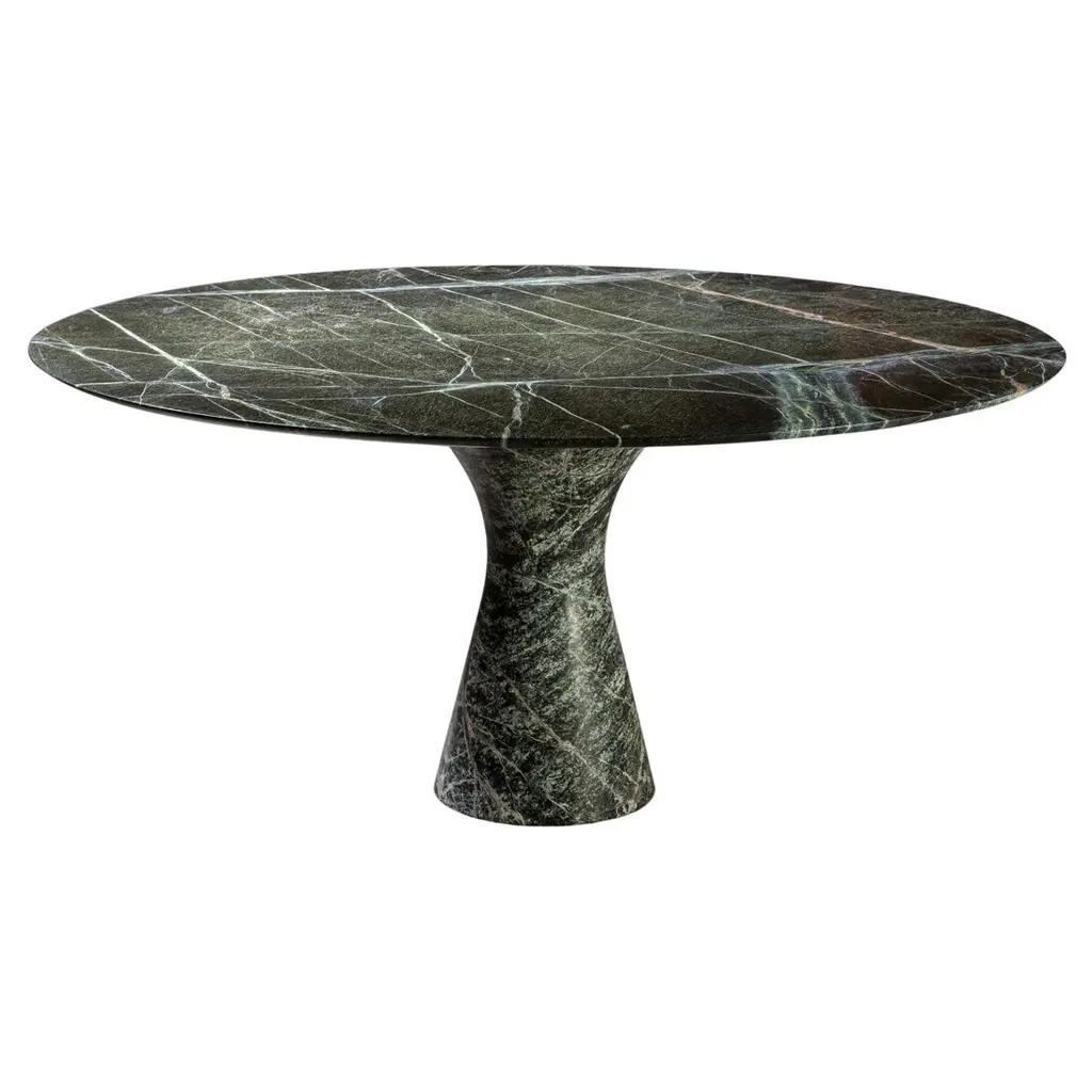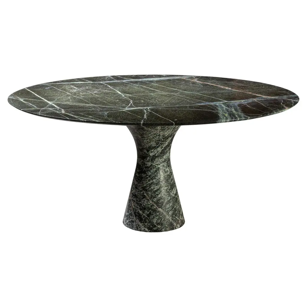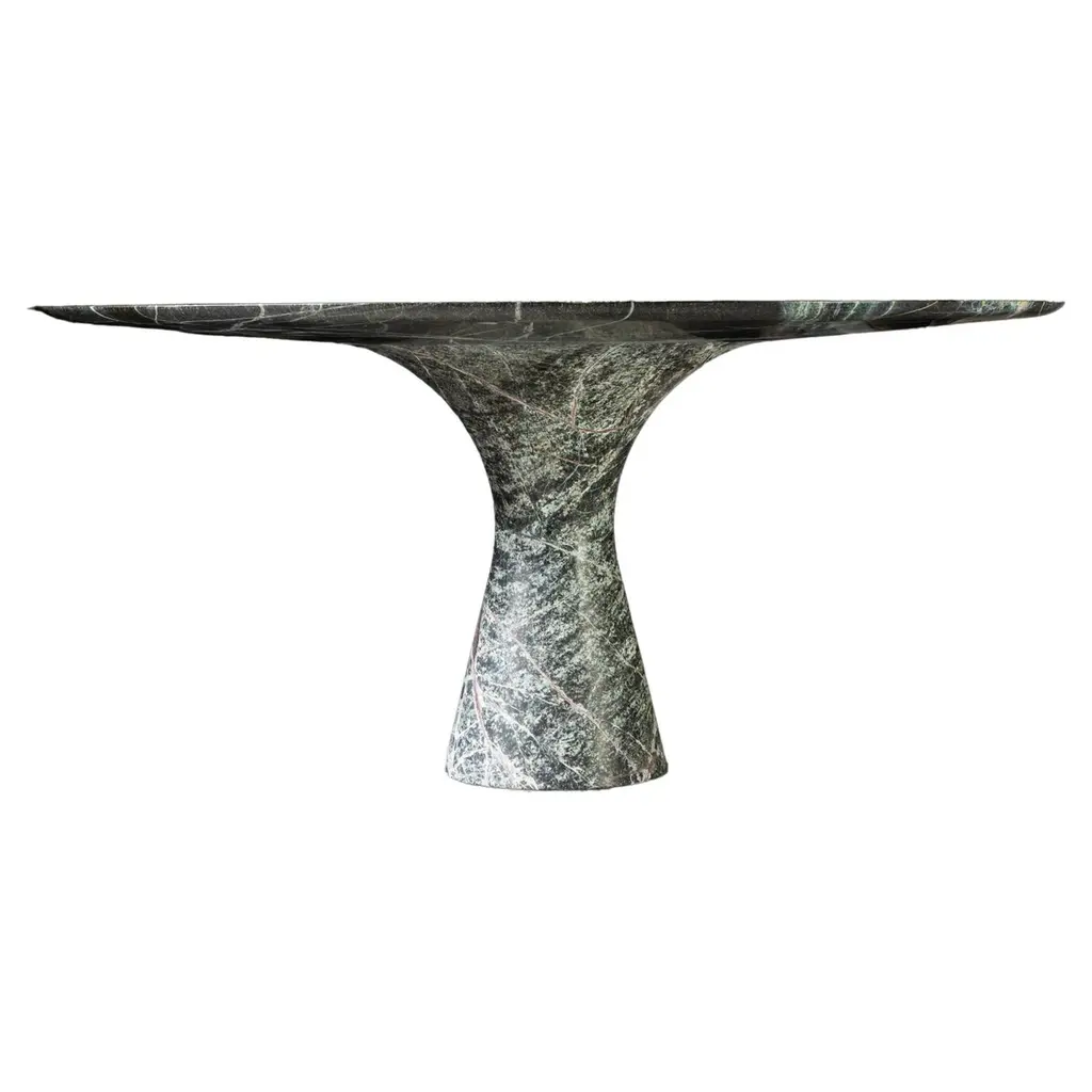 Picasso green refined contemporary marble dining table 130/75Dimensions: 130 x 75 cmMaterials: Picasso GreenAngelo is the essence of a round table in natural stone, a sculptural shape in robust material with elegant lines and refined finishes.The collection consists of a round/oval dining or conference table, side tables and lower tables.Suitable for both indoor and outdoor use!All tables are made by order and finished by hand to be sure that the tabletop and base become one pieceThe basic collection consists of 9 different marbles and different standard dimensions, however on request we make to measure.Almost any size or marble is possible!All tables are signed and numbered (the low and side tables are only signed).All tables are impregnated with Lithofin Nanotop. This protection is not visible and the marble keeps its natural look and feel. With the delivery of every table, a maintenance set of Lithofin is included.The production time is standard 12 weeks.The design Angelo is the essence of a round or oval table in natural stone, it features a sculptural form, sturdy material, an elegant line and a refined finish. Two elements, table base and top, form one whole together. The bottom is one running curve from table foot to edge. The conical connection creates a stabile whole.To show the marble in it’s most expressive character, different finishes are possible (polished, honed, brushed, striped, sandblasted & brushed). The basic collection consists of nine different types of marble and different sizes. On request this design can be executed in almost any type of marble and on measure. This table is perfectly suitable in a housing, retail or office environment. As the table is supported by one central foot it creates a lot of flexibility in seating. Executed in hard variations of natural stone suited for external use, this design can be a perfect garden table or sculpture.Angelo M/R 130 : ø 130 x 75 cmAngelo M/R 160 : ø 160 x 75 cmAngelo M/R 180 : ø 180 x 75 cmAngelo M/O 210 : 210 x 135 x 75 cmAngelo M/O 250 : 250 x 160 x 75 cmAngelo M/O 290 : 290 x 160 x 75 cm The basic collection is available in the following marbles: Kyknos, Grafite, Travertino Rosso, grey saint Laurent, Picasso green, port saint Laurent, Travertino silver, Rosso Lepanto and Bianco Statuarietto in a honed finish. On request different sizes, finishes and marbles are possible. AwardsGood Design Award – Chicago, USA (2018)People’s Choice, AZ Award – Toronto, Canada (2019)German Design Award – Frankfurt, Germany (2020).