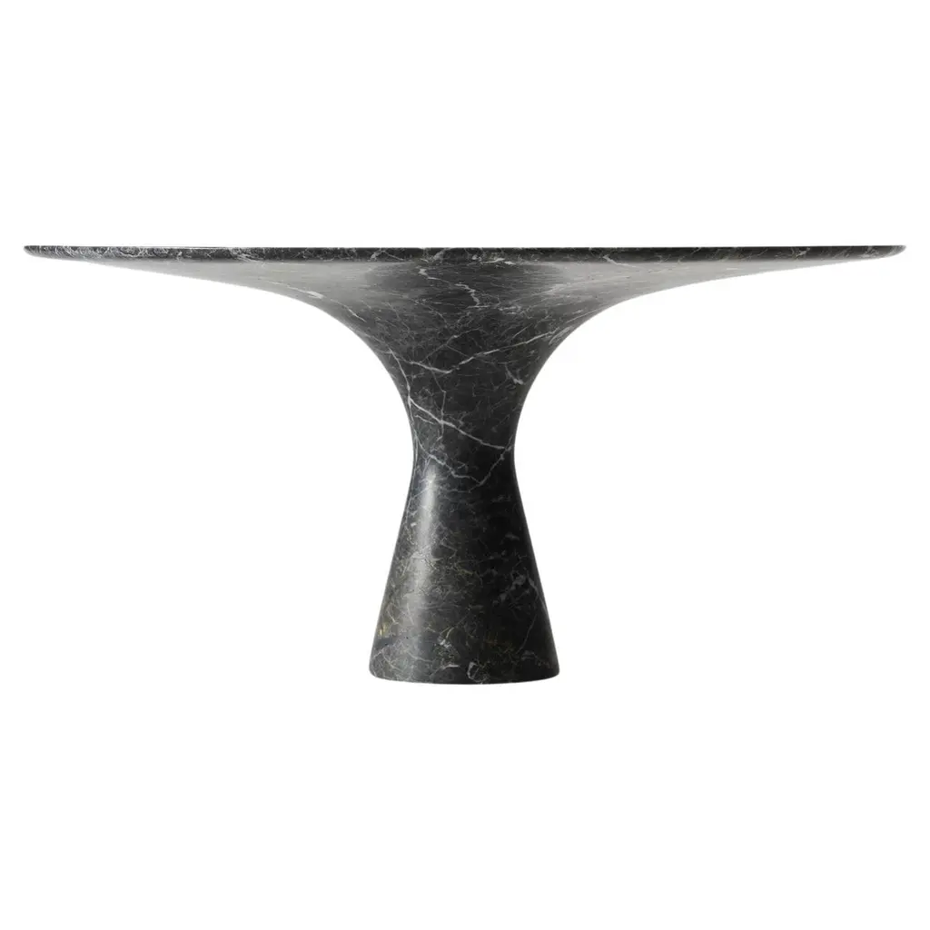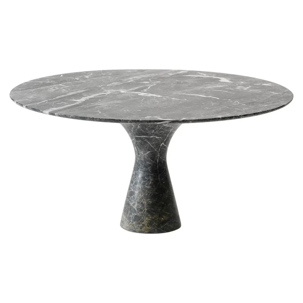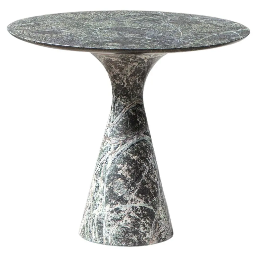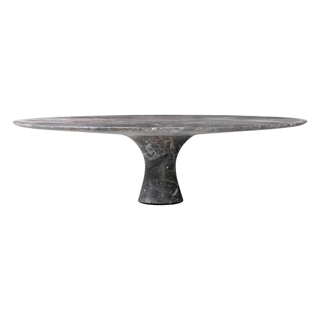 Picasso green refined contemporary marble dining table 130/75Dimensions: 130 x 75 cmMaterials: Picasso GreenAngelo is the essence of a round table in natural stone, a sculptural shape in robust material with elegant lines and refined finishes.The collection consists of a round/oval dining or conference table, side tables and lower tables.Suitable for both indoor and outdoor use!All tables are made by order and finished by hand to be sure that the tabletop and base become one pieceThe basic collection consists of 9 different marbles and different standard dimensions, however on request we make to measure.Almost any size or marble is possible!All tables are signed and numbered (the low and side tables are only signed).All tables are impregnated with Lithofin Nanotop. This protection is not visible and the marble keeps its natural look and feel. With the delivery of every table, a maintenance set of Lithofin is included.The production time is standard 12 weeks.The design Angelo is the essence of a round or oval table in natural stone, it features a sculptural form, sturdy material, an elegant line and a refined finish. Two elements, table base and top, form one whole together. The bottom is one running curve from table foot to edge. The conical connection creates a stabile whole.To show the marble in it’s most expressive character, different finishes are possible (polished, honed, brushed, striped, sandblasted & brushed). The basic collection consists of nine different types of marble and different sizes. On request this design can be executed in almost any type of marble and on measure. This table is perfectly suitable in a housing, retail or office environment. As the table is supported by one central foot it creates a lot of flexibility in seating. Executed in hard variations of natural stone suited for external use, this design can be a perfect garden table or sculpture.Angelo M/R 130 : ø 130 x 75 cmAngelo M/R 160 : ø 160 x 75 cmAngelo M/R 180 : ø 180 x 75 cmAngelo M/O 210 : 210 x 135 x 75 cmAngelo M/O 250 : 250 x 160 x 75 cmAngelo M/O 290 : 290 x 160 x 75 cm The basic collection is available in the following marbles: Kyknos, Grafite, Travertino Rosso, grey saint Laurent, Picasso green, port saint Laurent, Travertino silver, Rosso Lepanto and Bianco Statuarietto in a honed finish. On request different sizes, finishes and marbles are possible. AwardsGood Design Award – Chicago, USA (2018)People’s Choice, AZ Award – Toronto, Canada (2019)German Design Award – Frankfurt, Germany (2020).